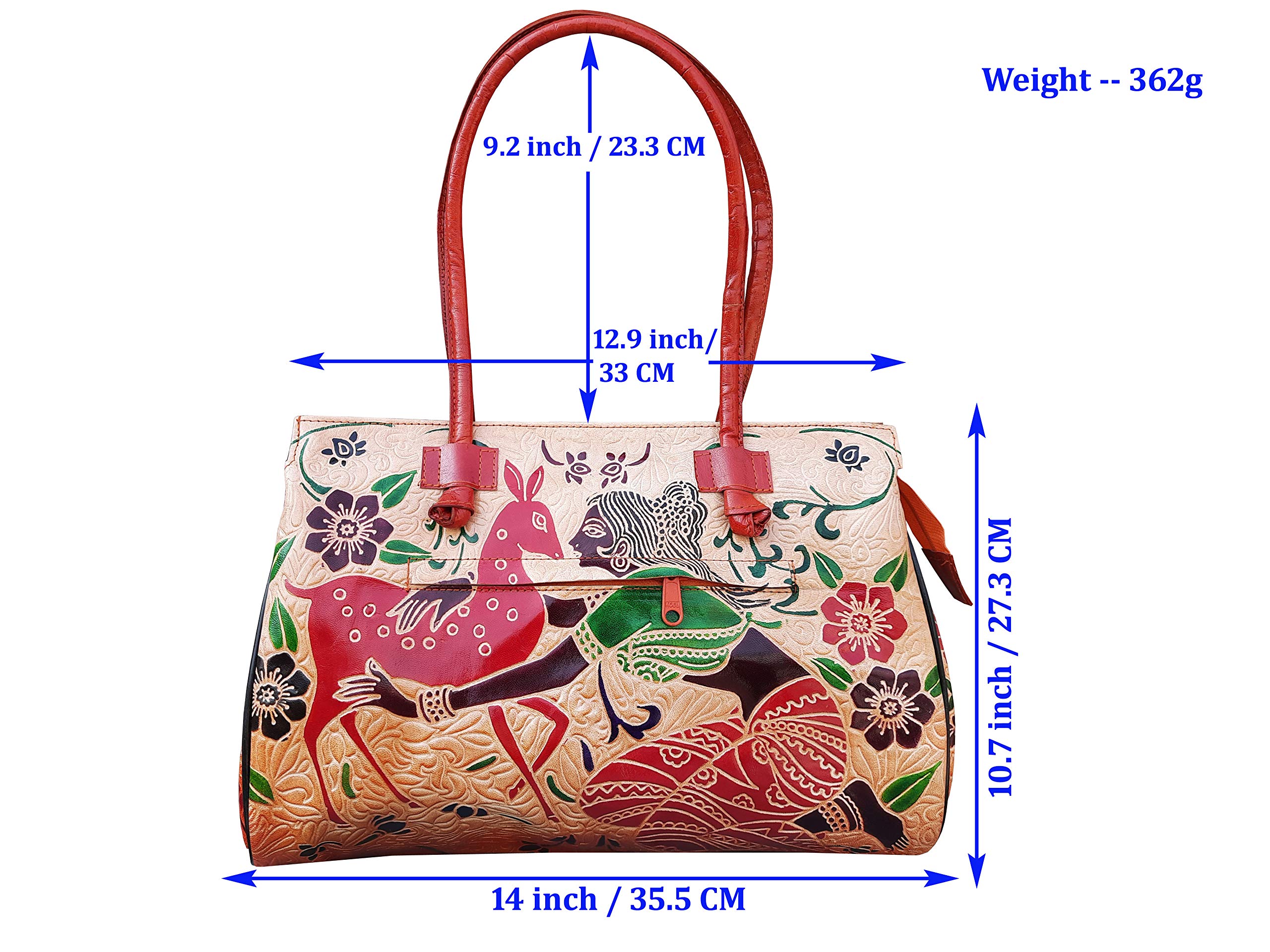 Dimension: - Height: 10.7 inch / 27.3 cm Width at Base: 14 inch / 35.5 cm Width at Top: 12.9 inch / 33 cm Shoulder Strap : 9.2 inch / 23.3 cm Weight: 362g Outer Material Leather Traditional Block print. Care Instruction: Clean it with dry Cloth.