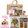 Swad Happy Women’s Day Gift Hamper Set (Mixed Toffee & Rosted Saunf & Jeera Goli Pachak Mukhwas Mouthfreshener 25 Candy & 2 bottle) with Greeting Card & Jute BagGift Item