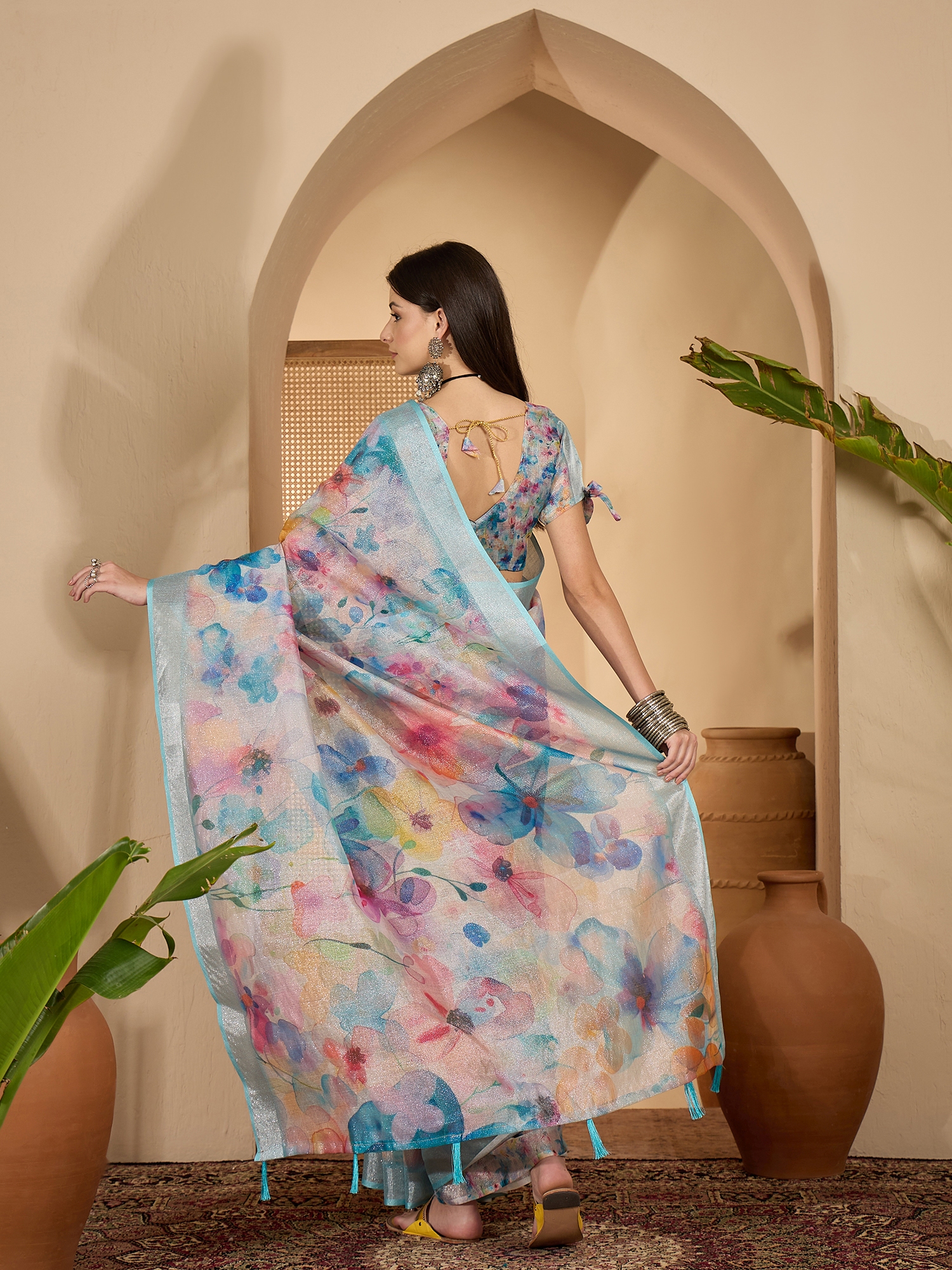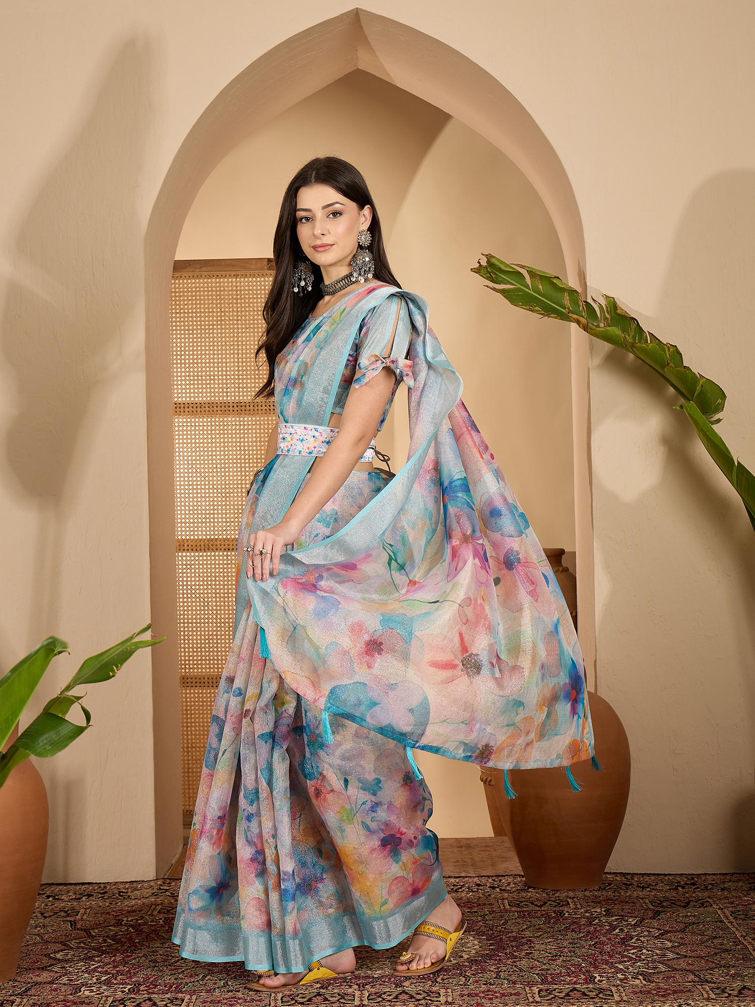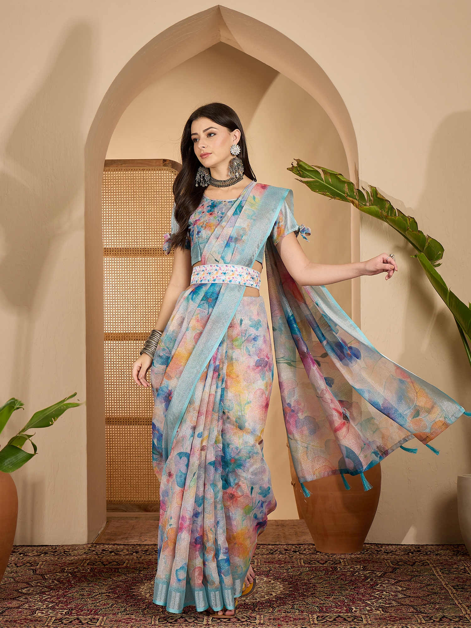 Saree Work-Digital Print ,Blouse Work- Linen Zari Silver