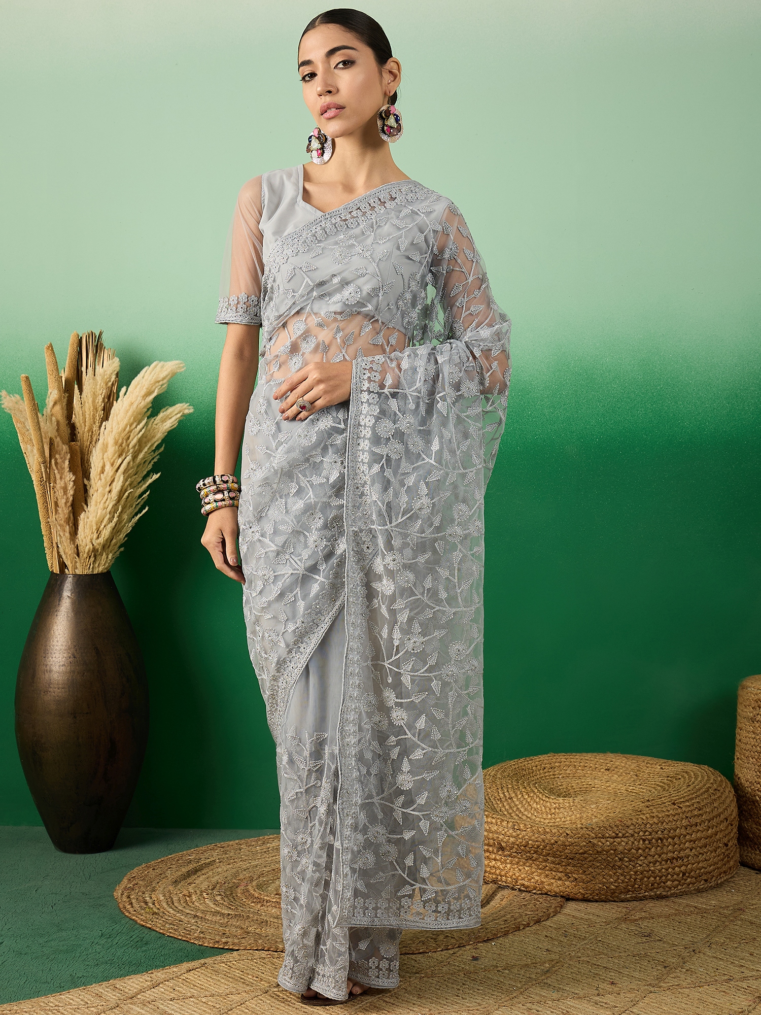 AASTHA FASHION Fashion Dream Womens Grey Net Saree | Soft & Elegant Traditional Wear