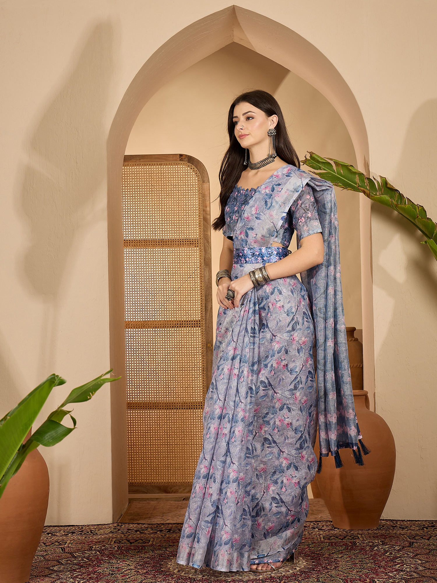 Saree Work-Digital Print ,Blouse Work- Linen Zari Silver