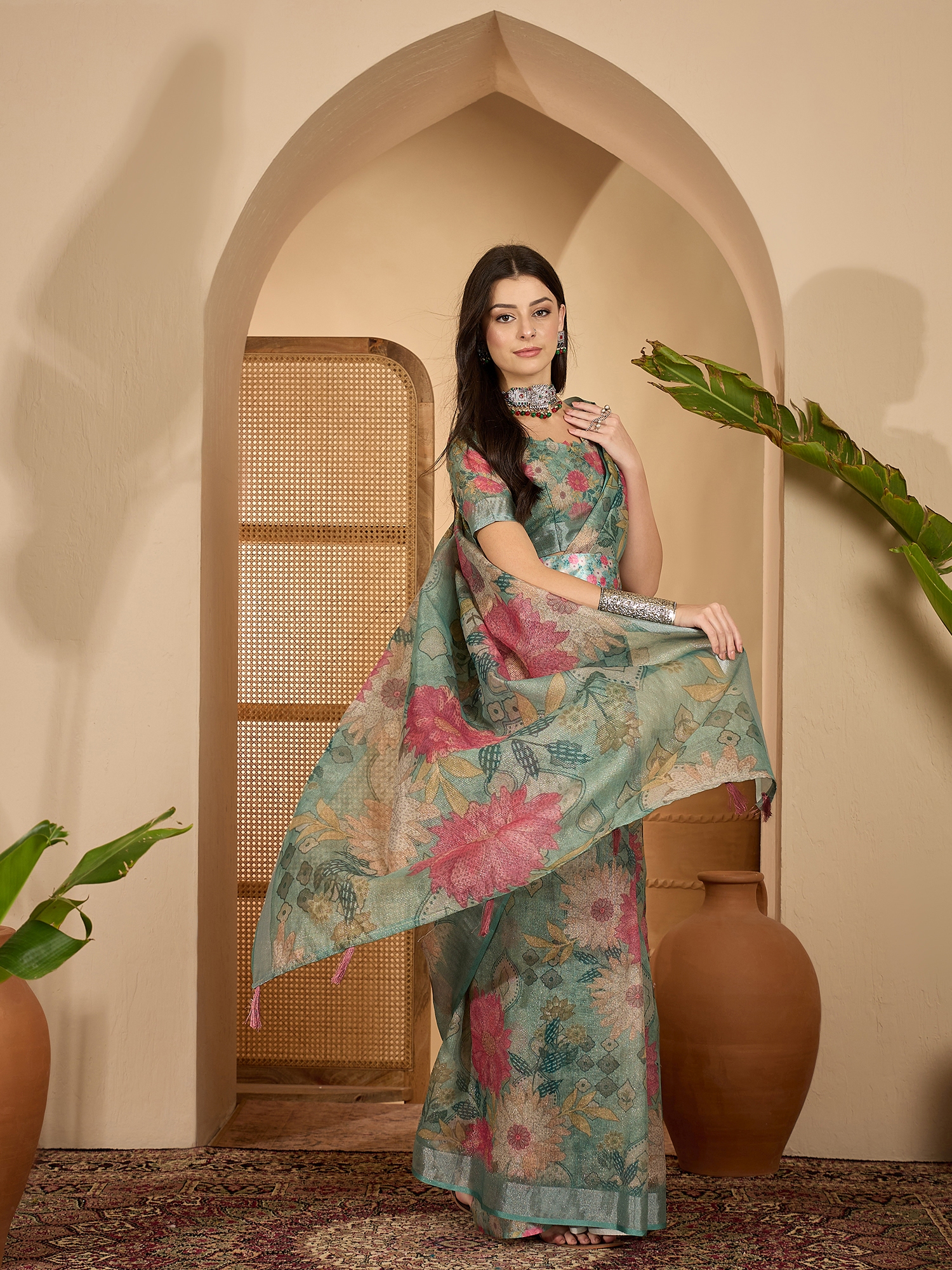 AASTHA FASHION Fashion Dream Womens Mint Green Linen Zari Gold Saree | Soft & Elegant Traditional Wear