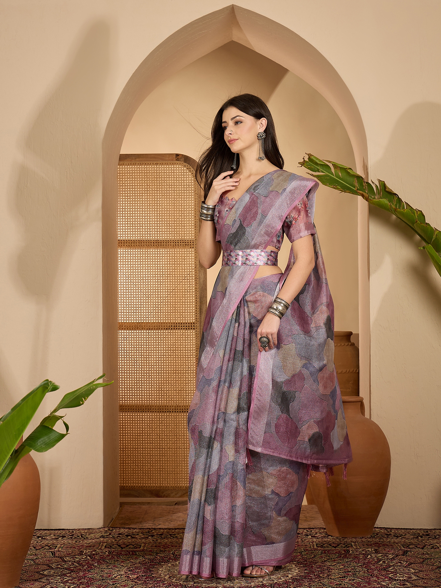 • Saree Work-Digital Print ,Blouse Work- Linen Zari Silver