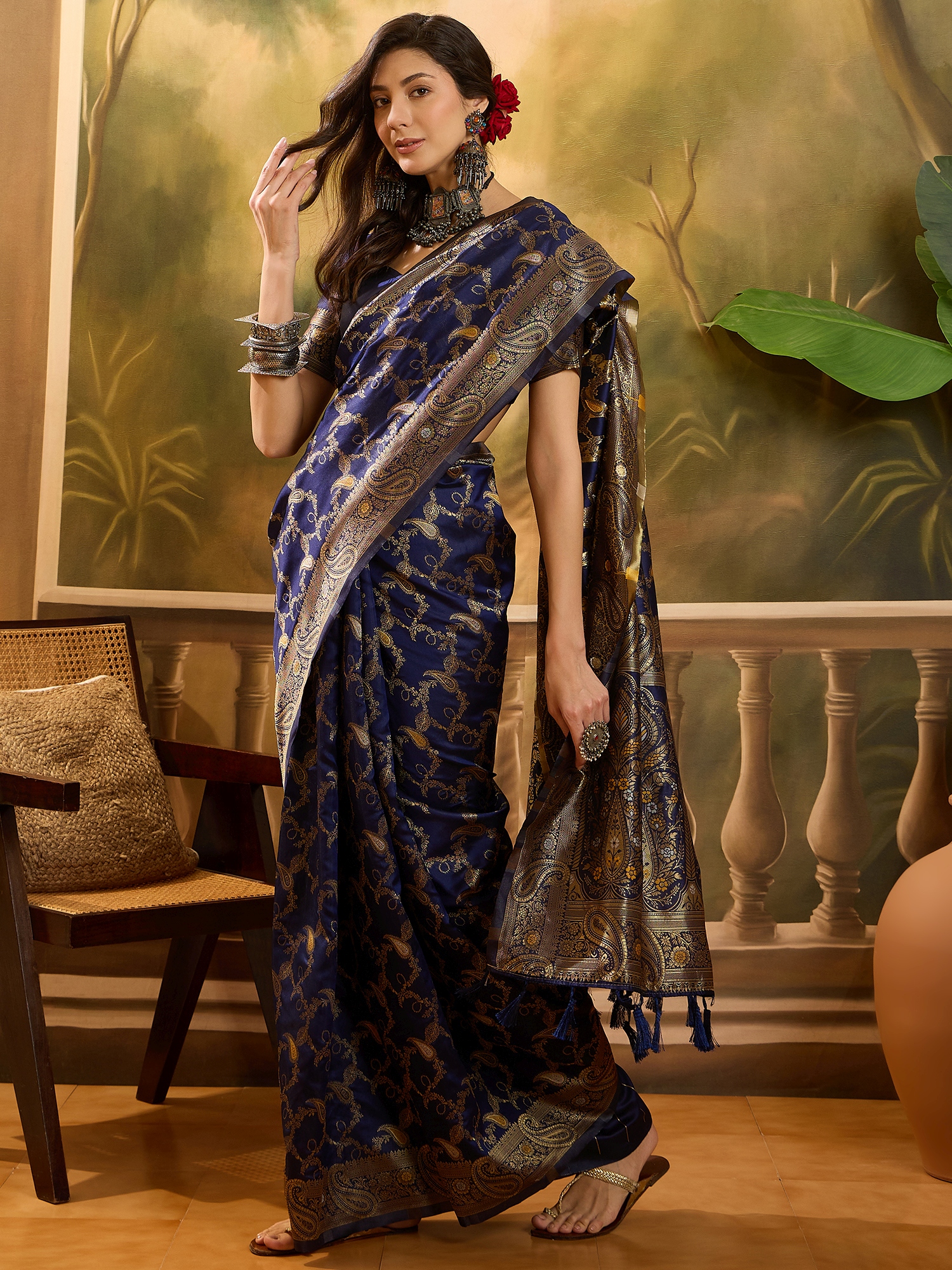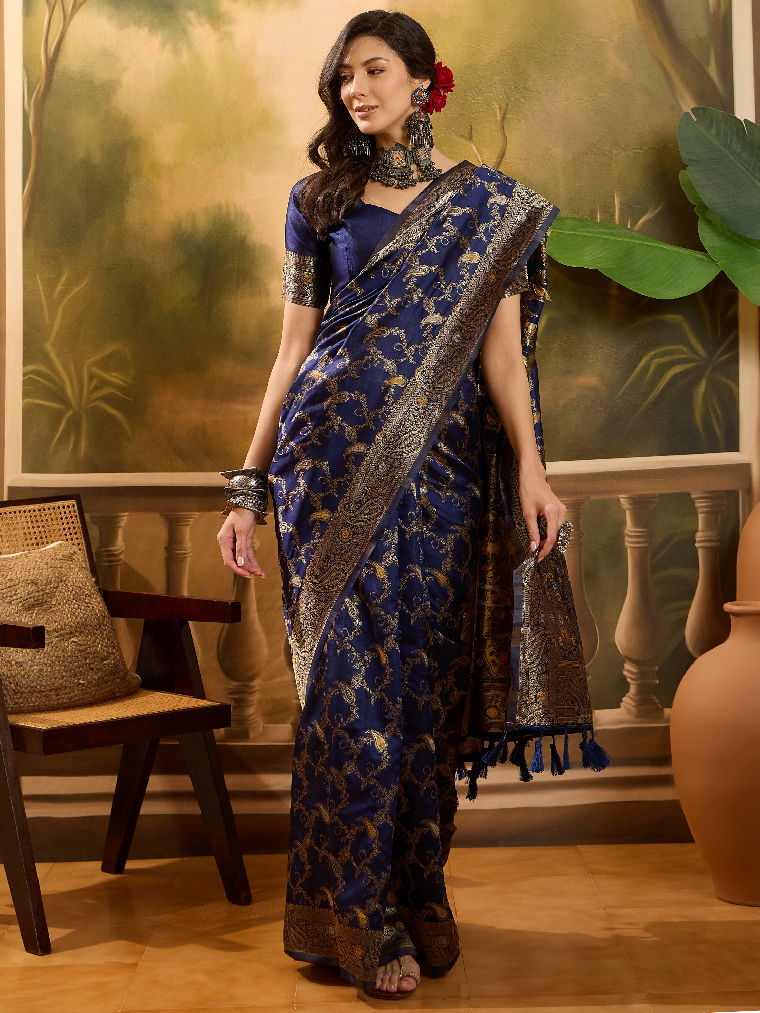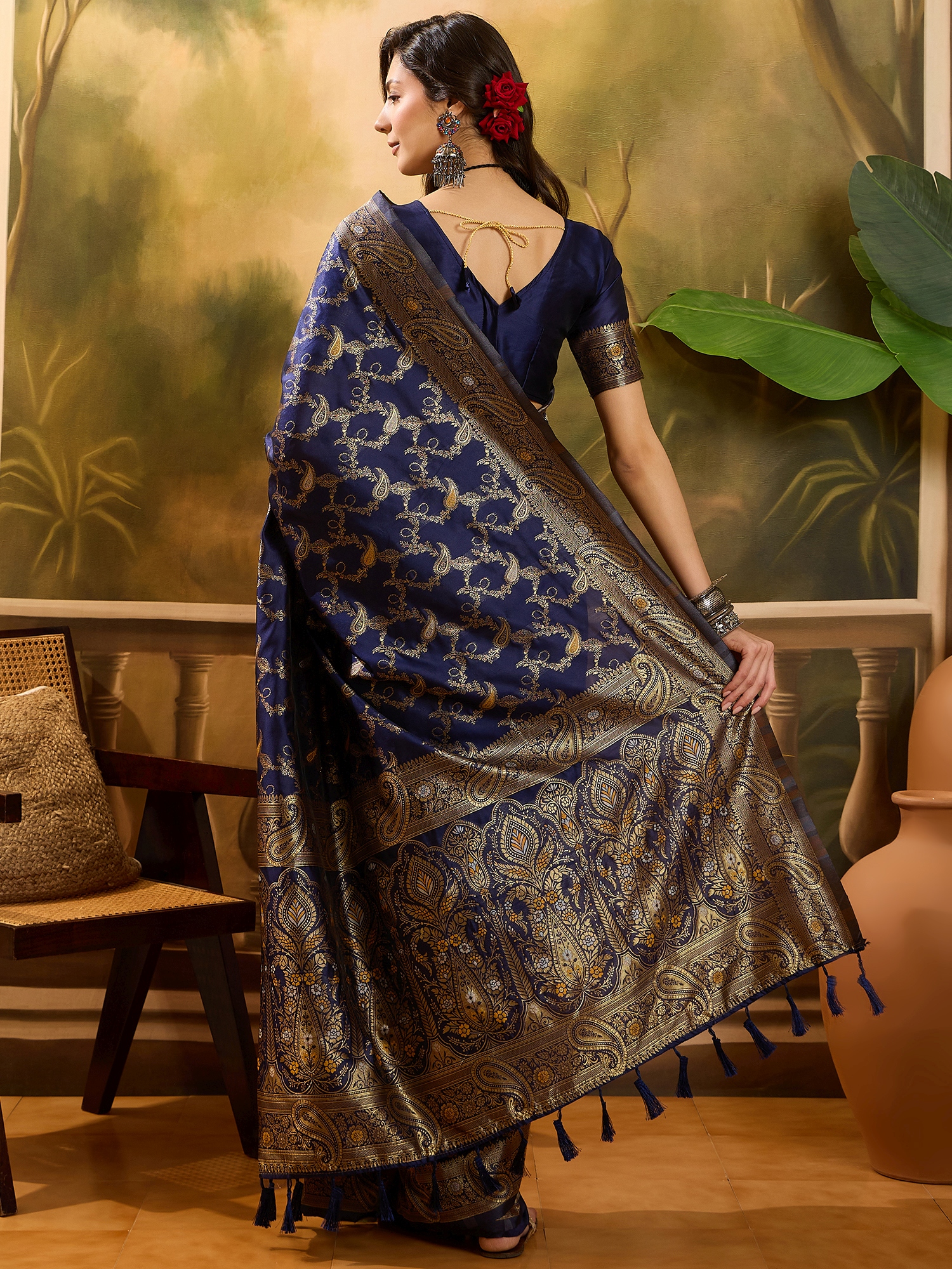 AASTHA FASHION Fashion Dream Womens Navy Blue Banarasi Jacquard Saree | Soft & Elegant Traditional Wear