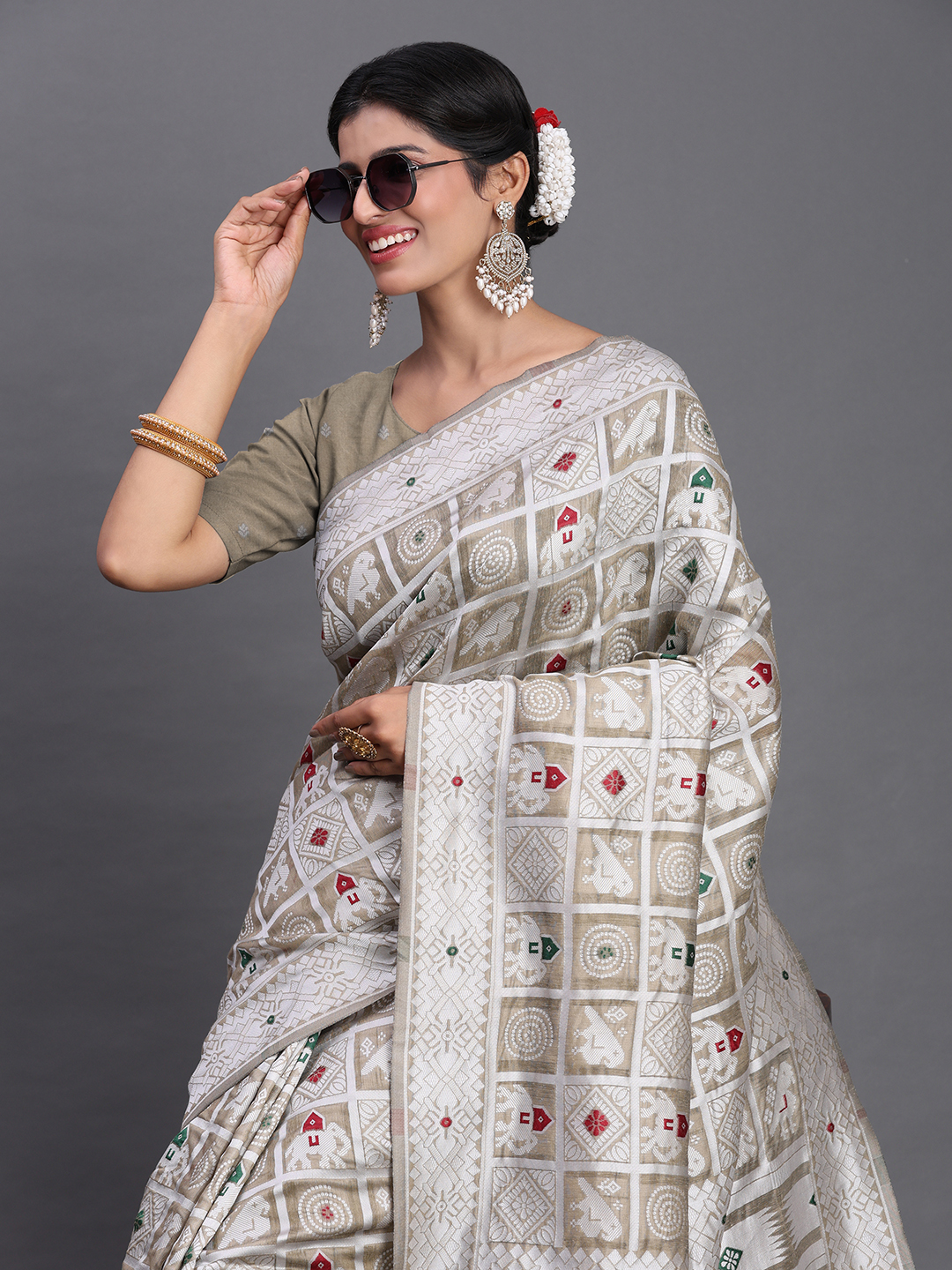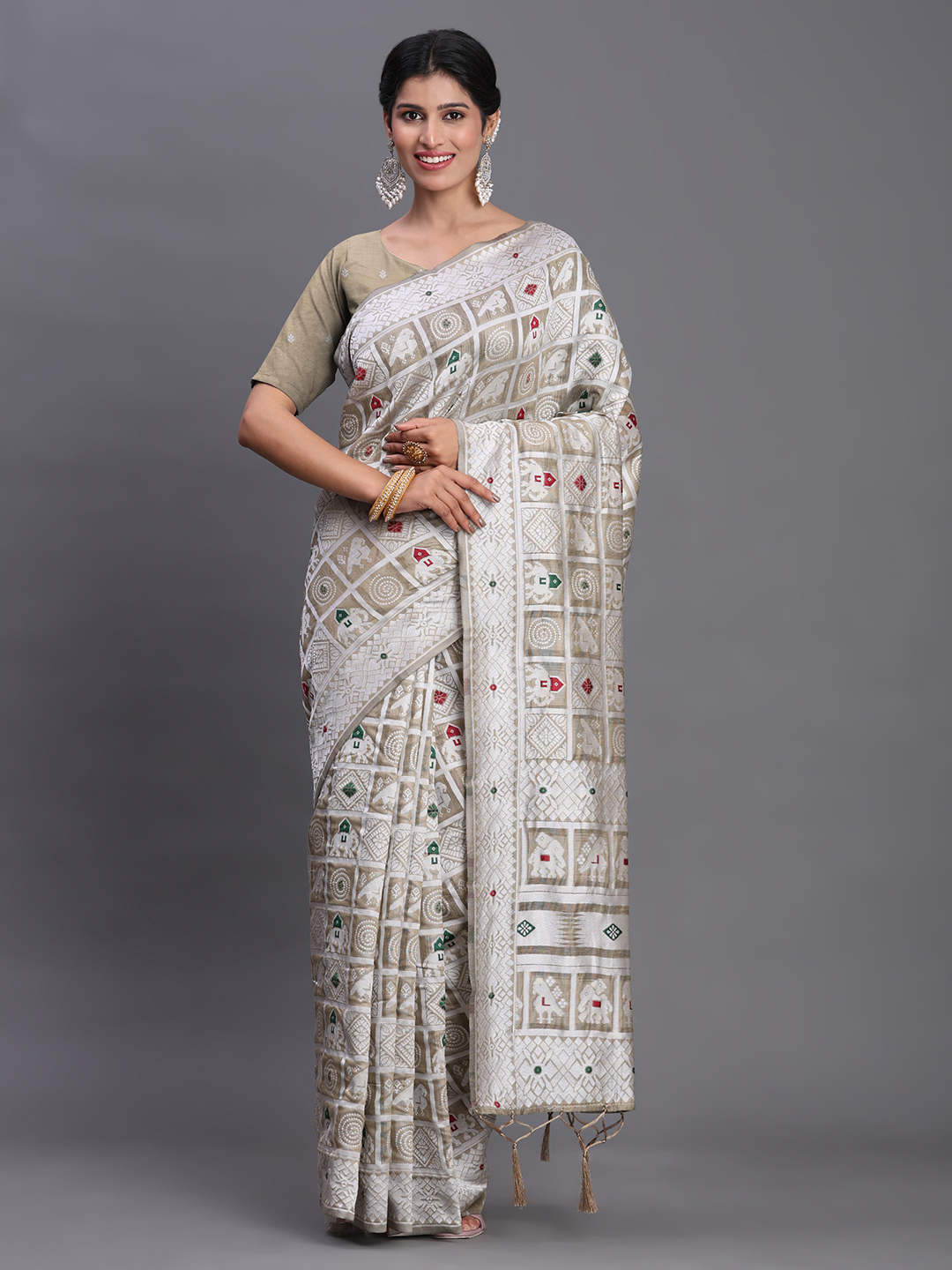 Beige Color Beautiful Woven Designer Linen Cotton Saree