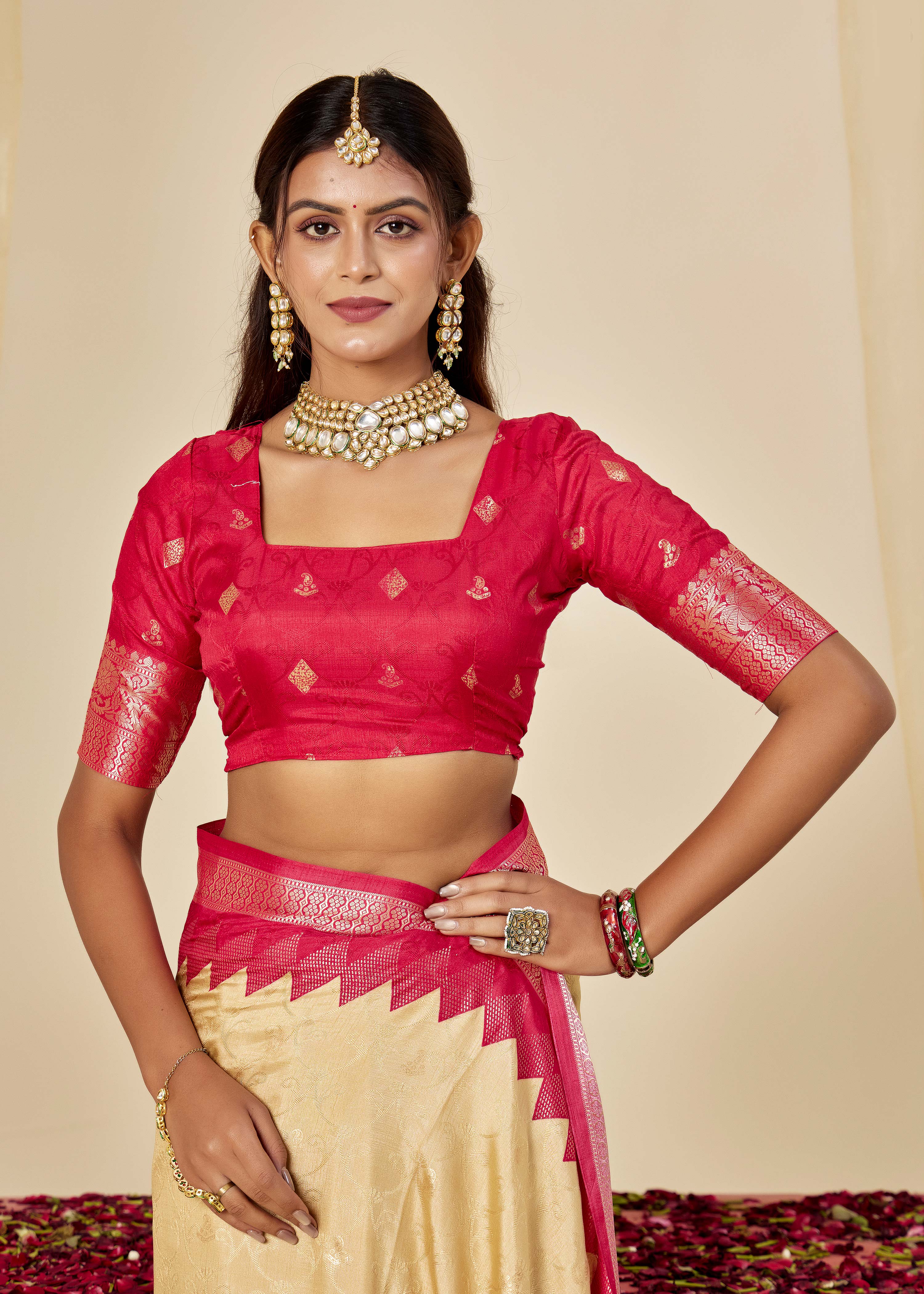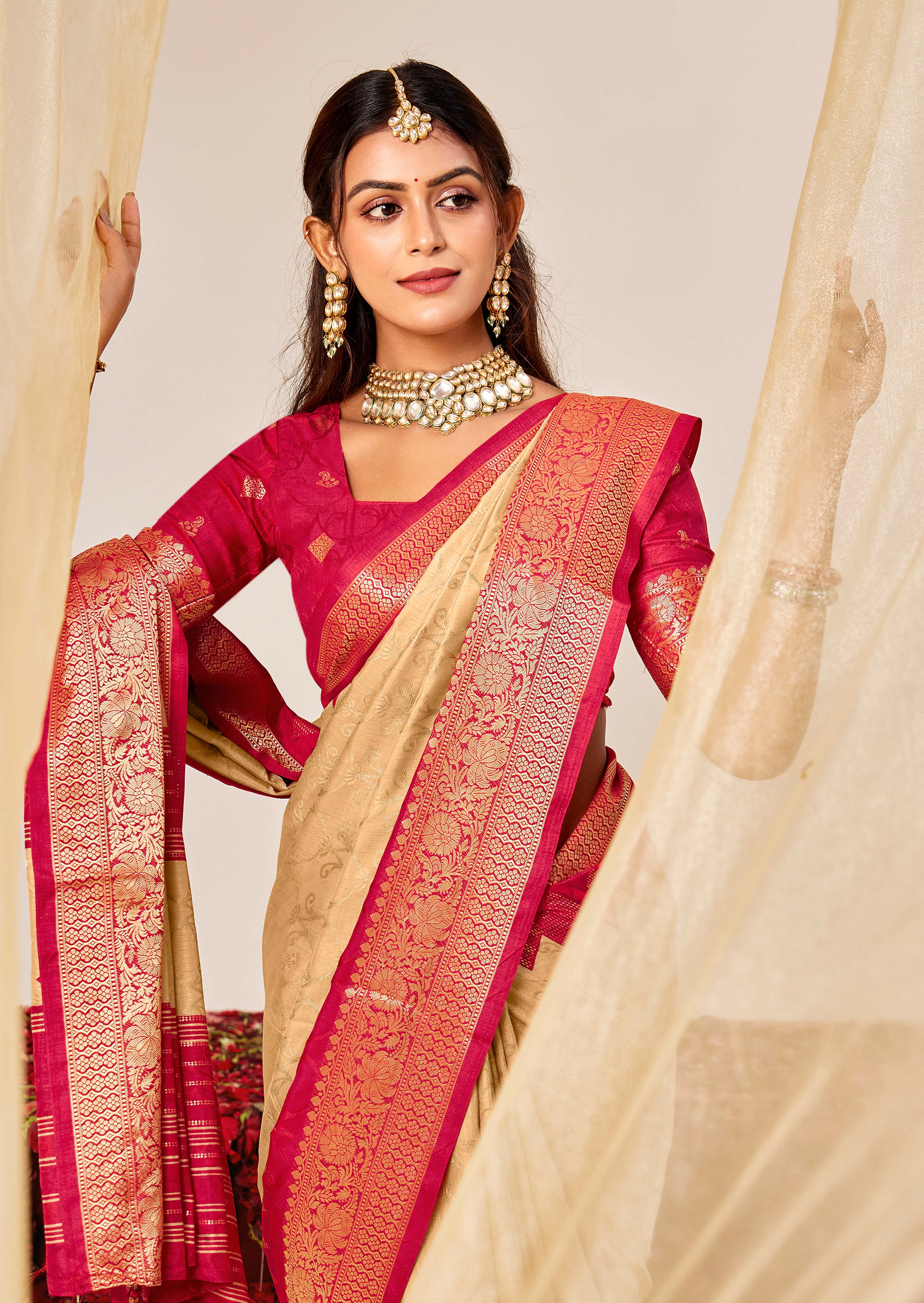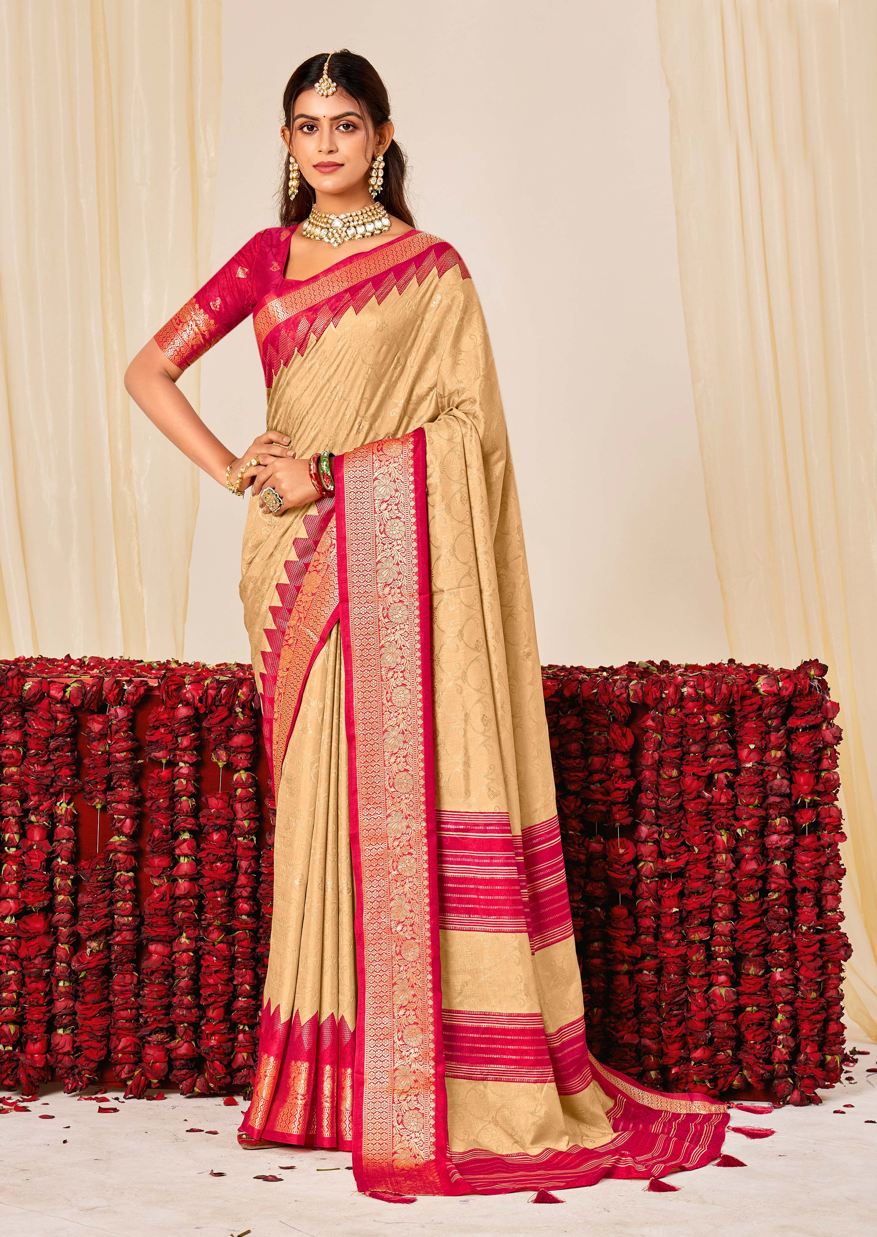 Beige Color Velvet Tussar Silk Fabric Woven Saree With Smart Elegant Print
