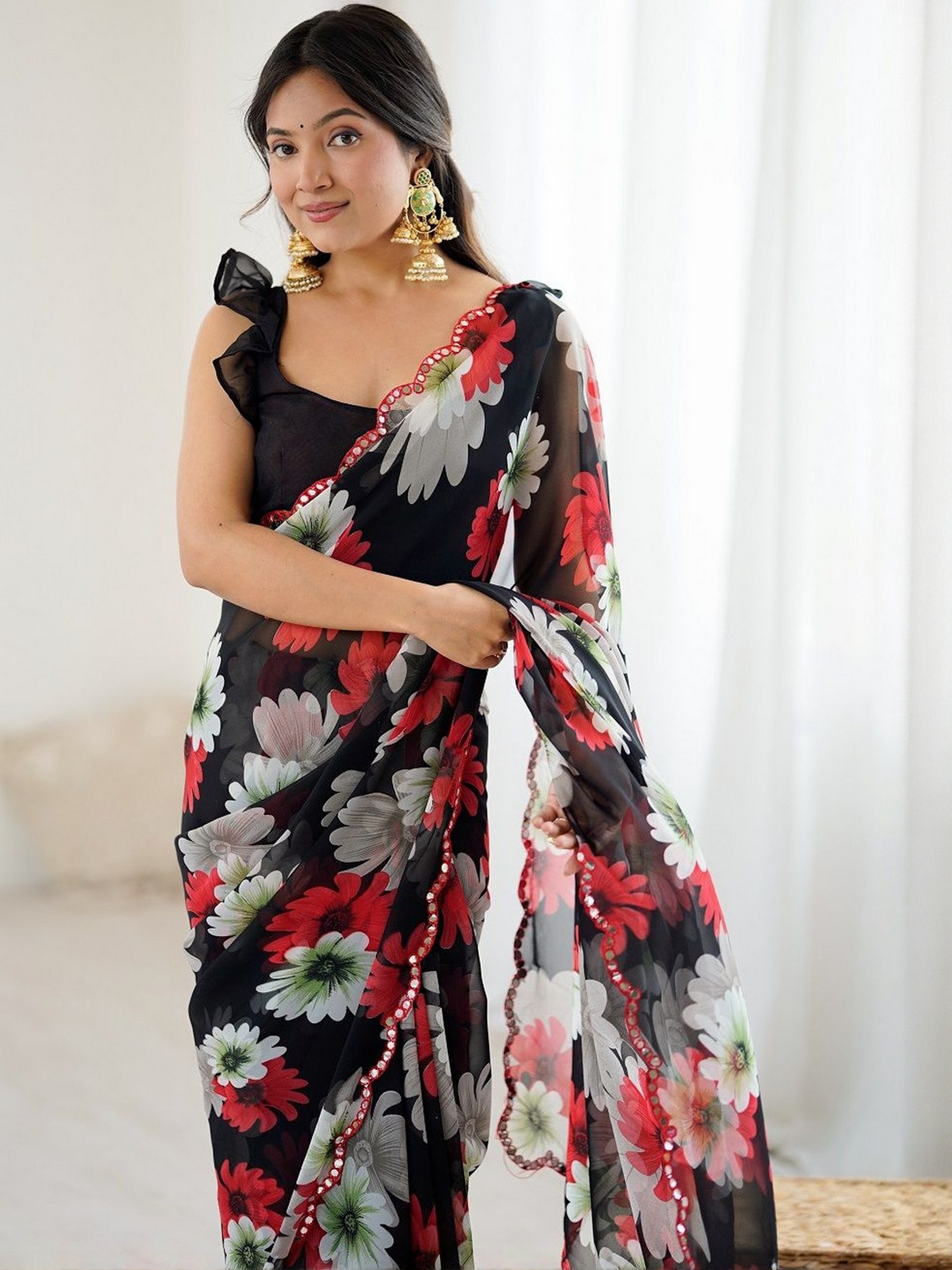 Black Color Georgette Fabric Designe Floral Printed Bollywood Style Saree
