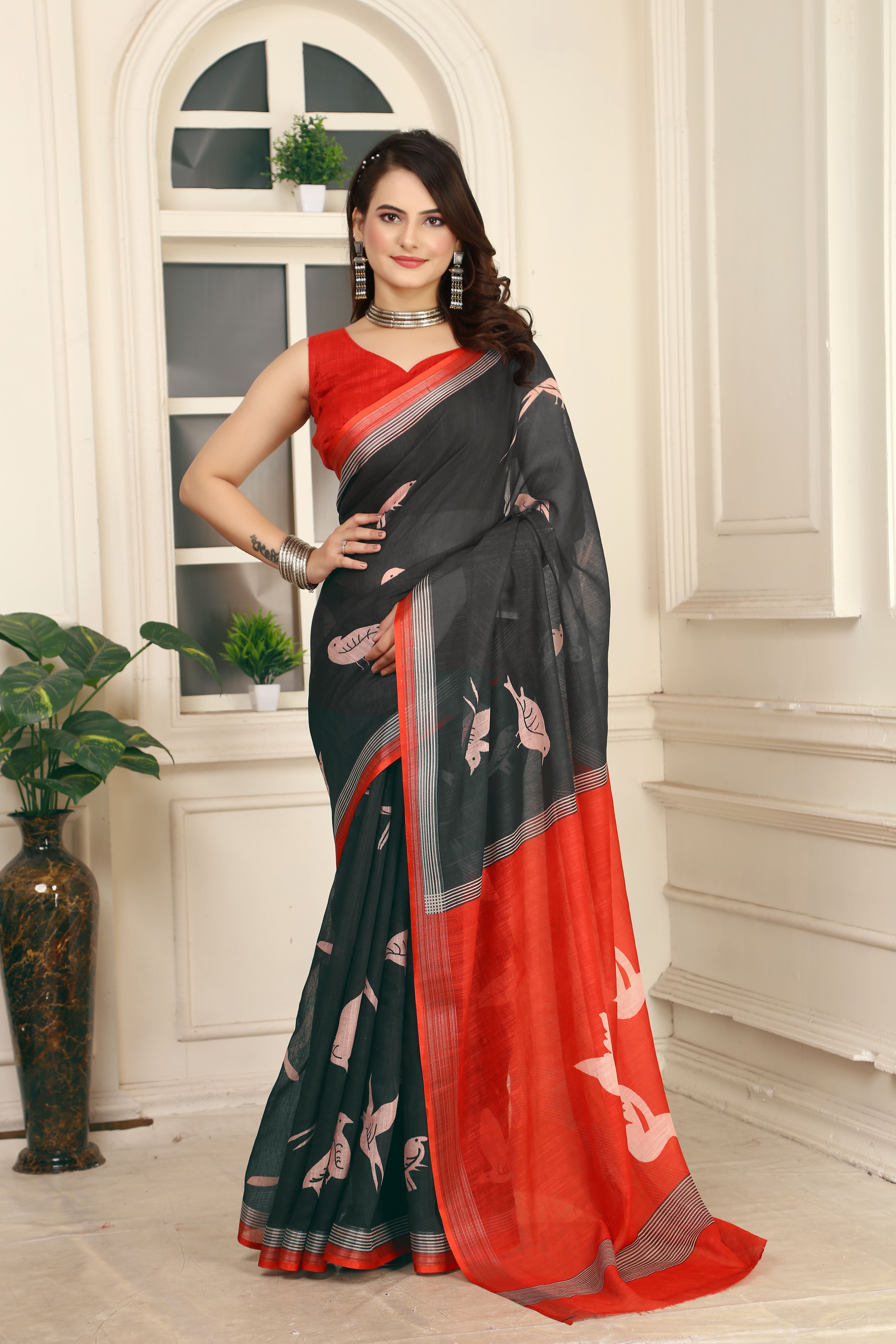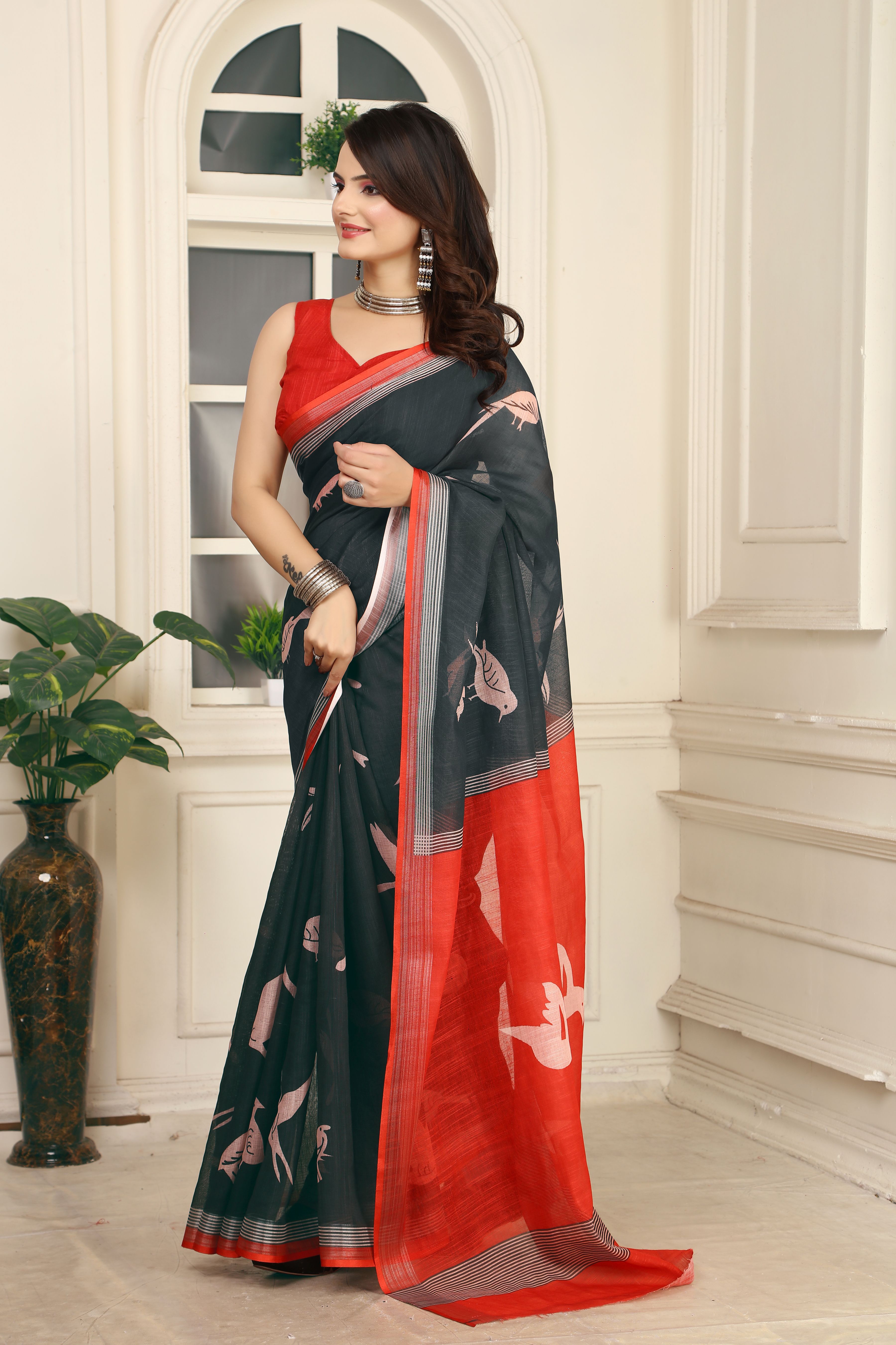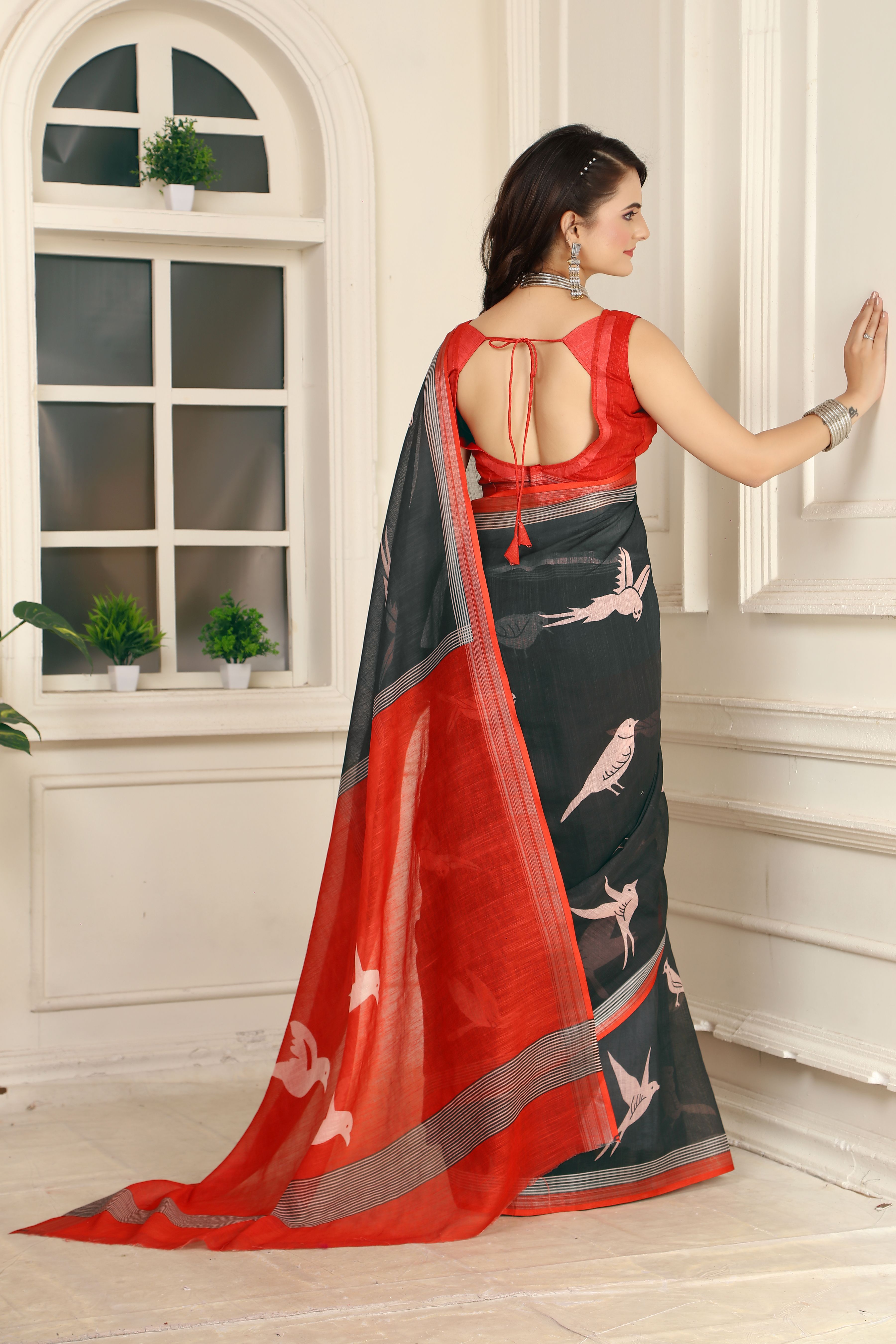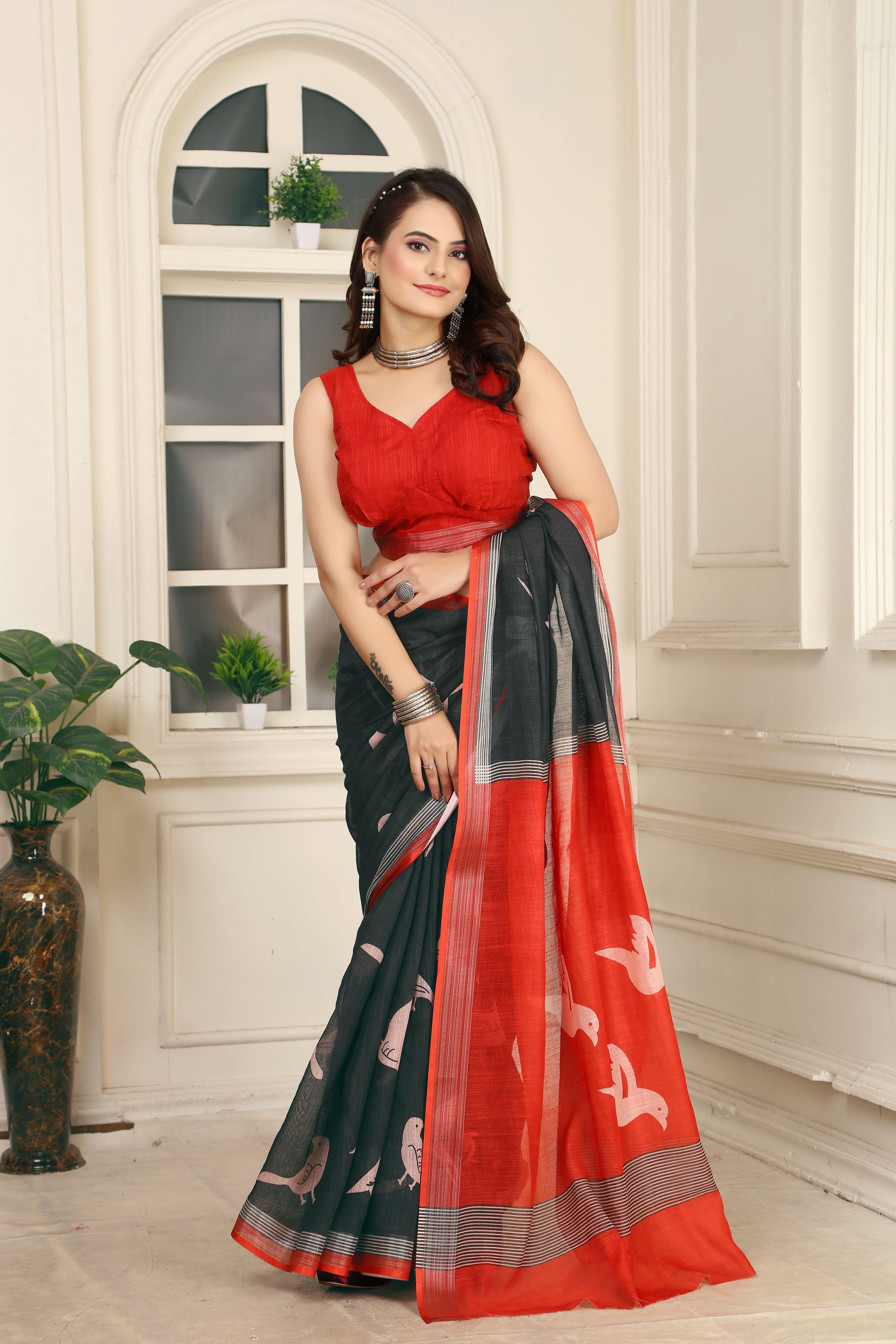 Black Color Linen Cotton Fabric Beautiful Printed Saree