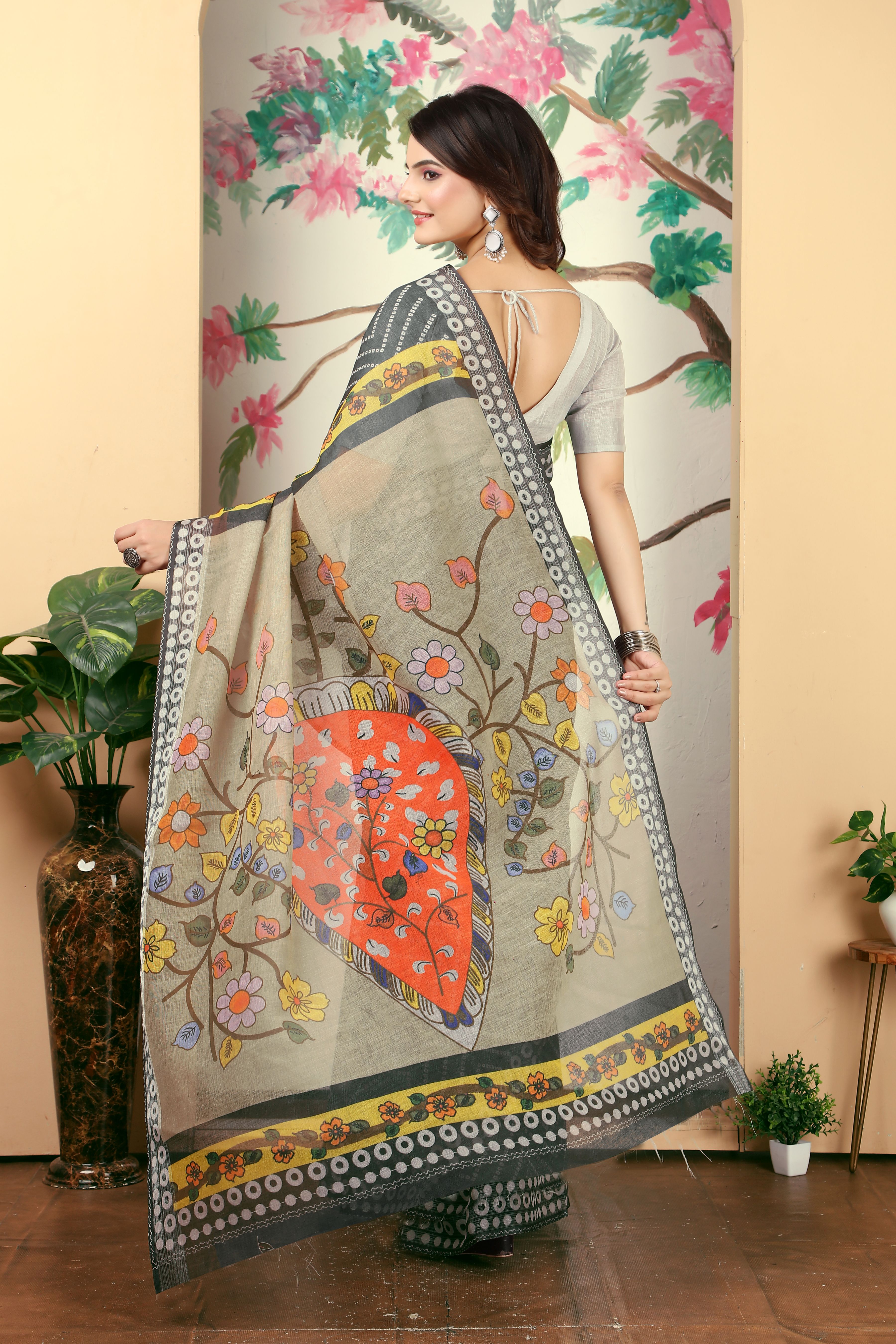 Black Color Linen Cotton Fabric Beautiful Printed Saree