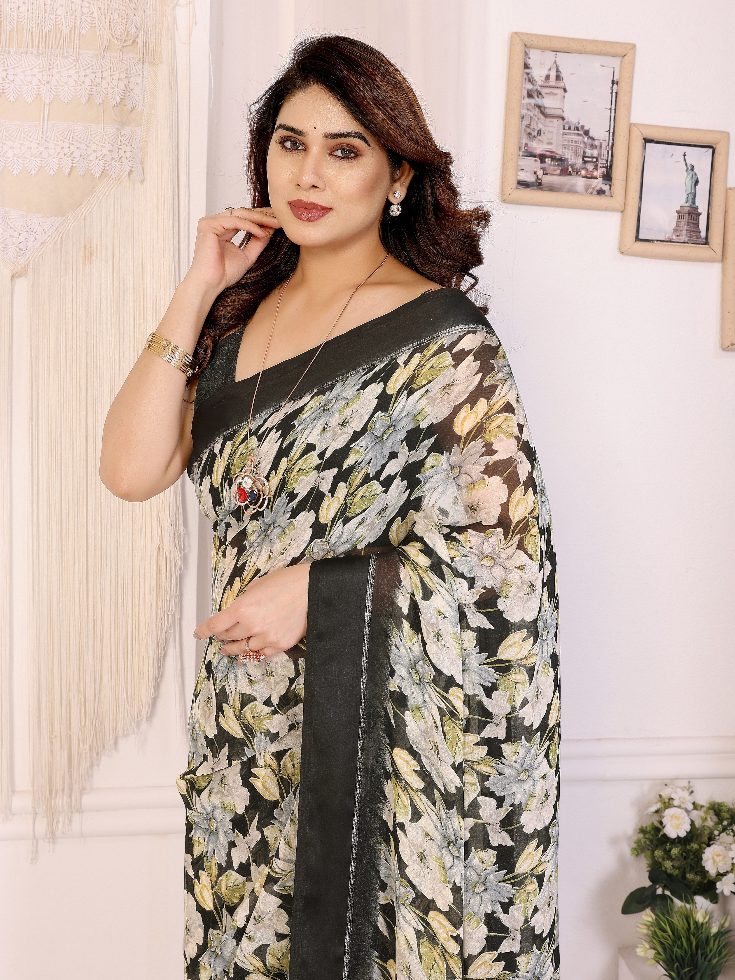 Black Color Moss Satin Patta Designer Flower Printed Ceremonial Saree
