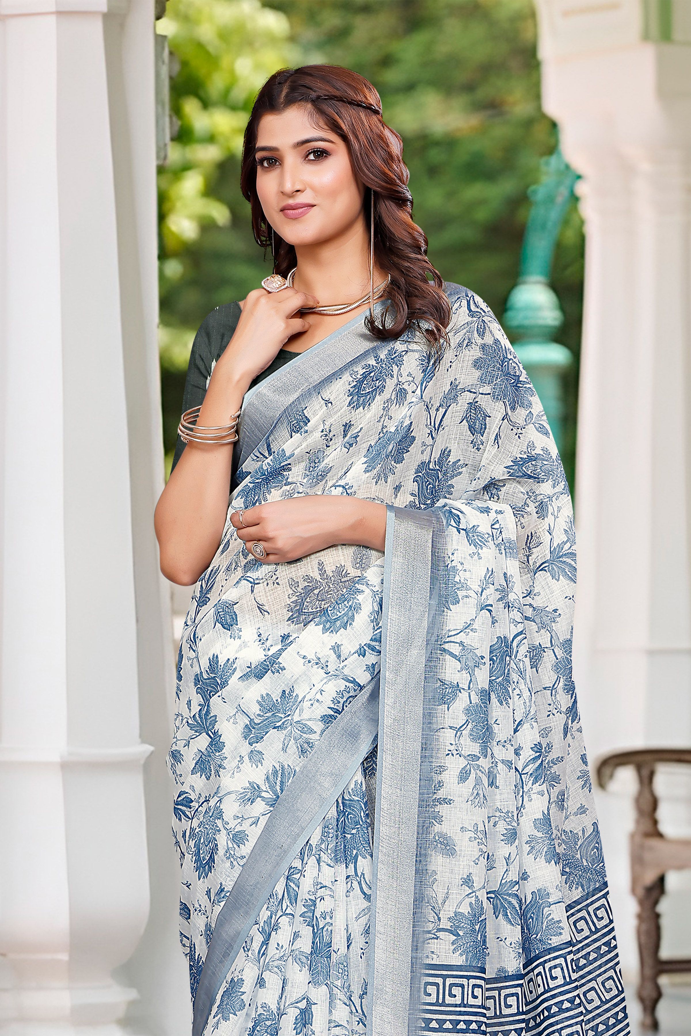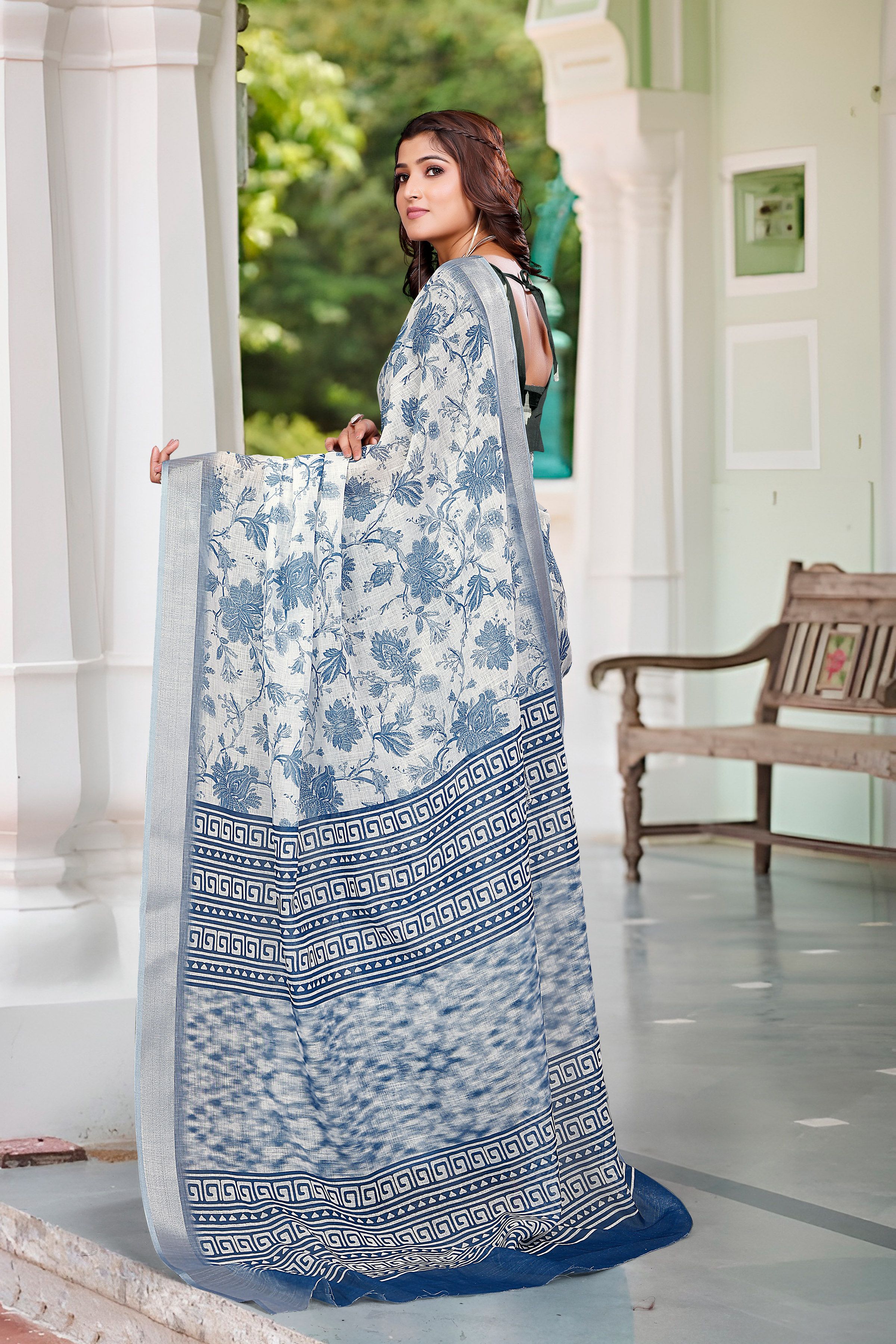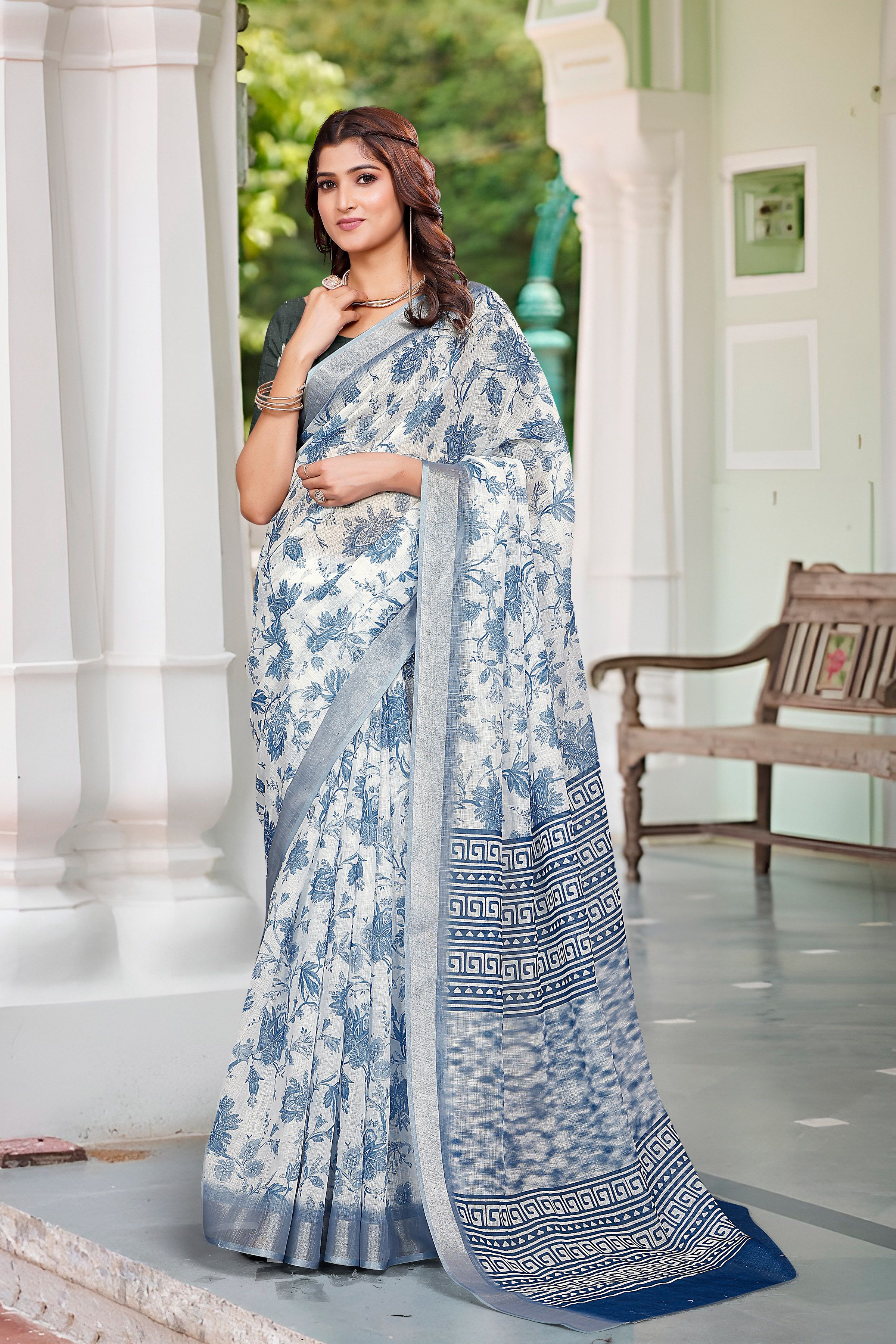 Blue Color Linen Cotton Fabric Beautiful Festive Special Saree