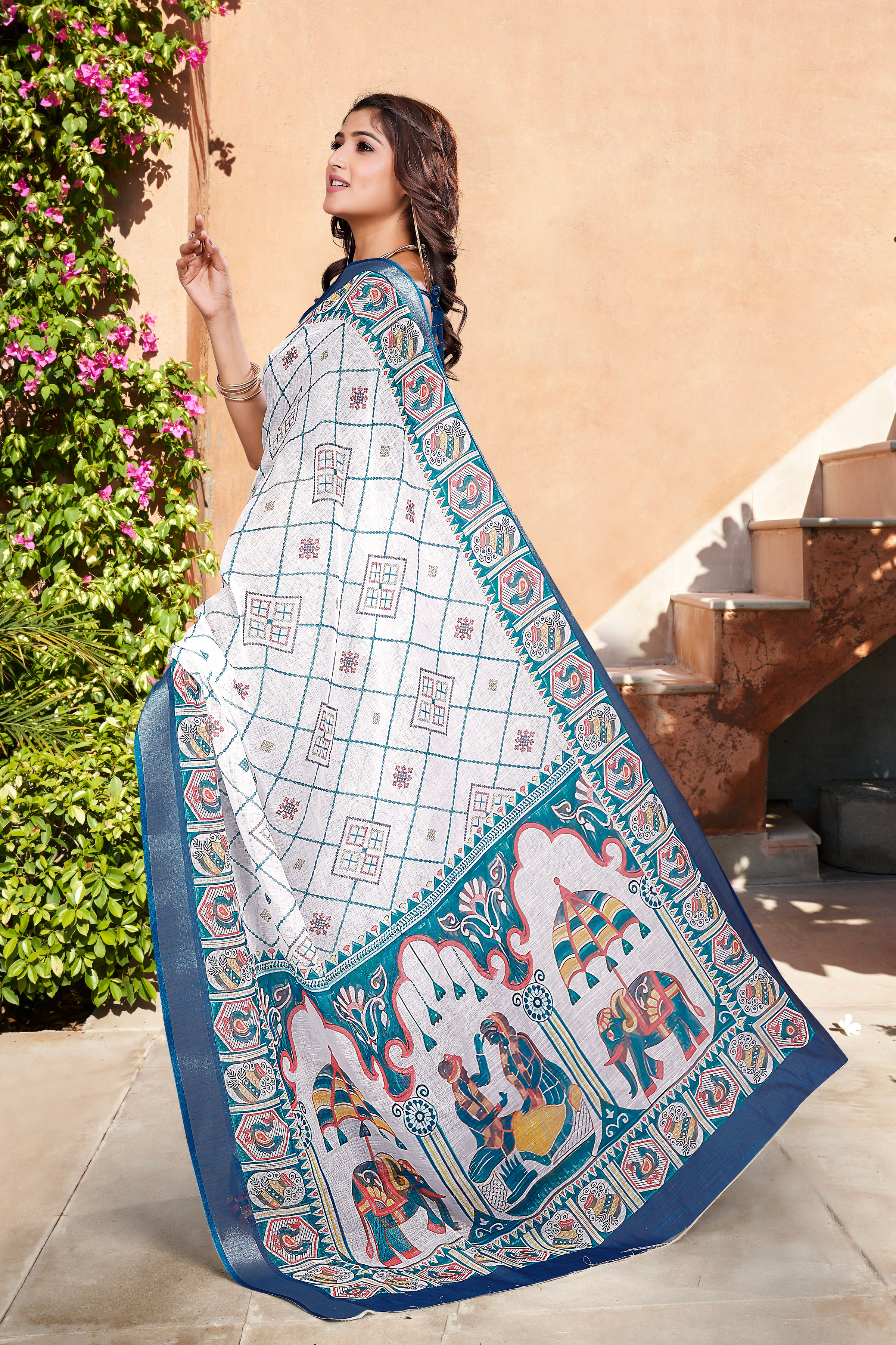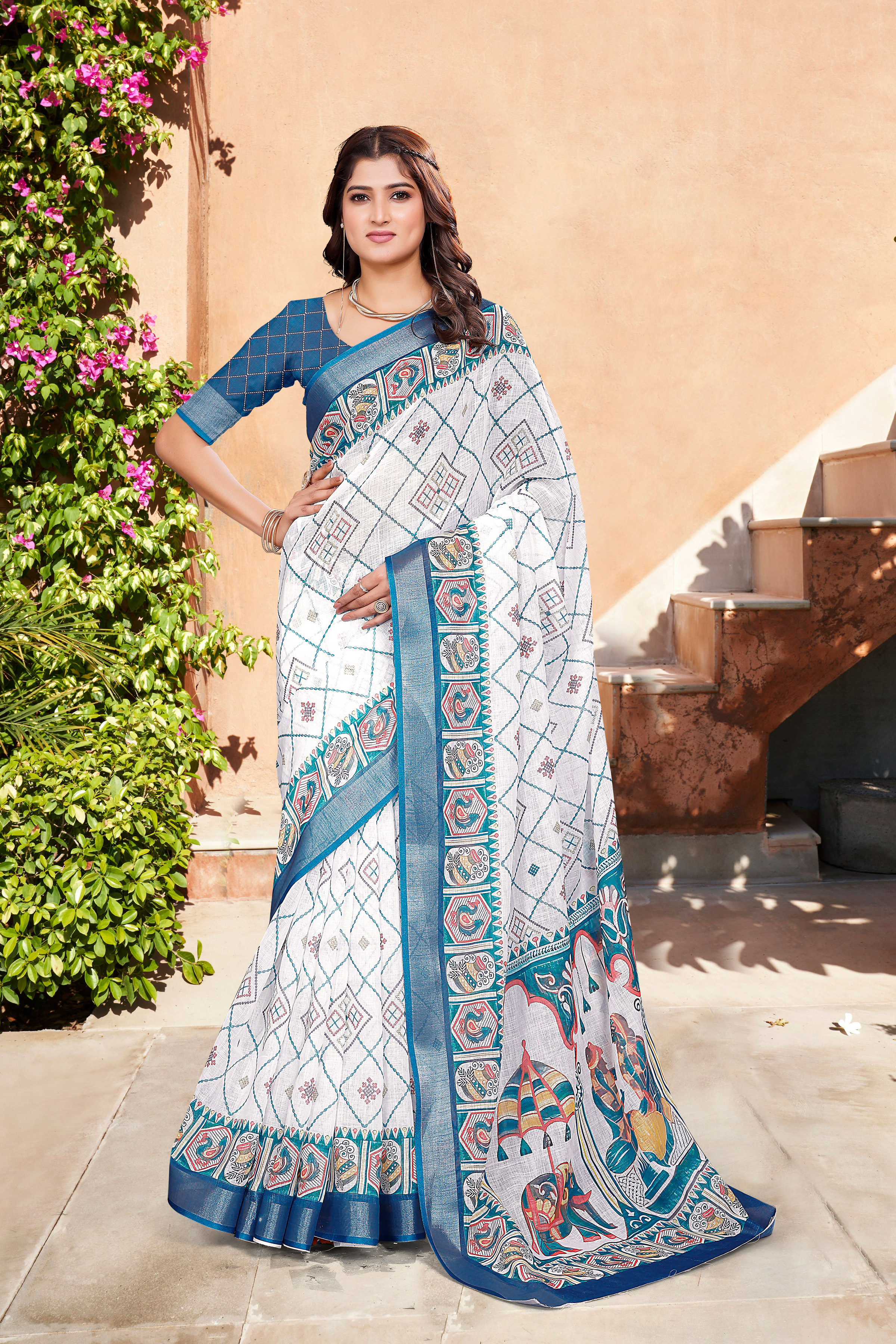 Blue Color Linen Cotton Saree With Smart Partywear Printed Looks