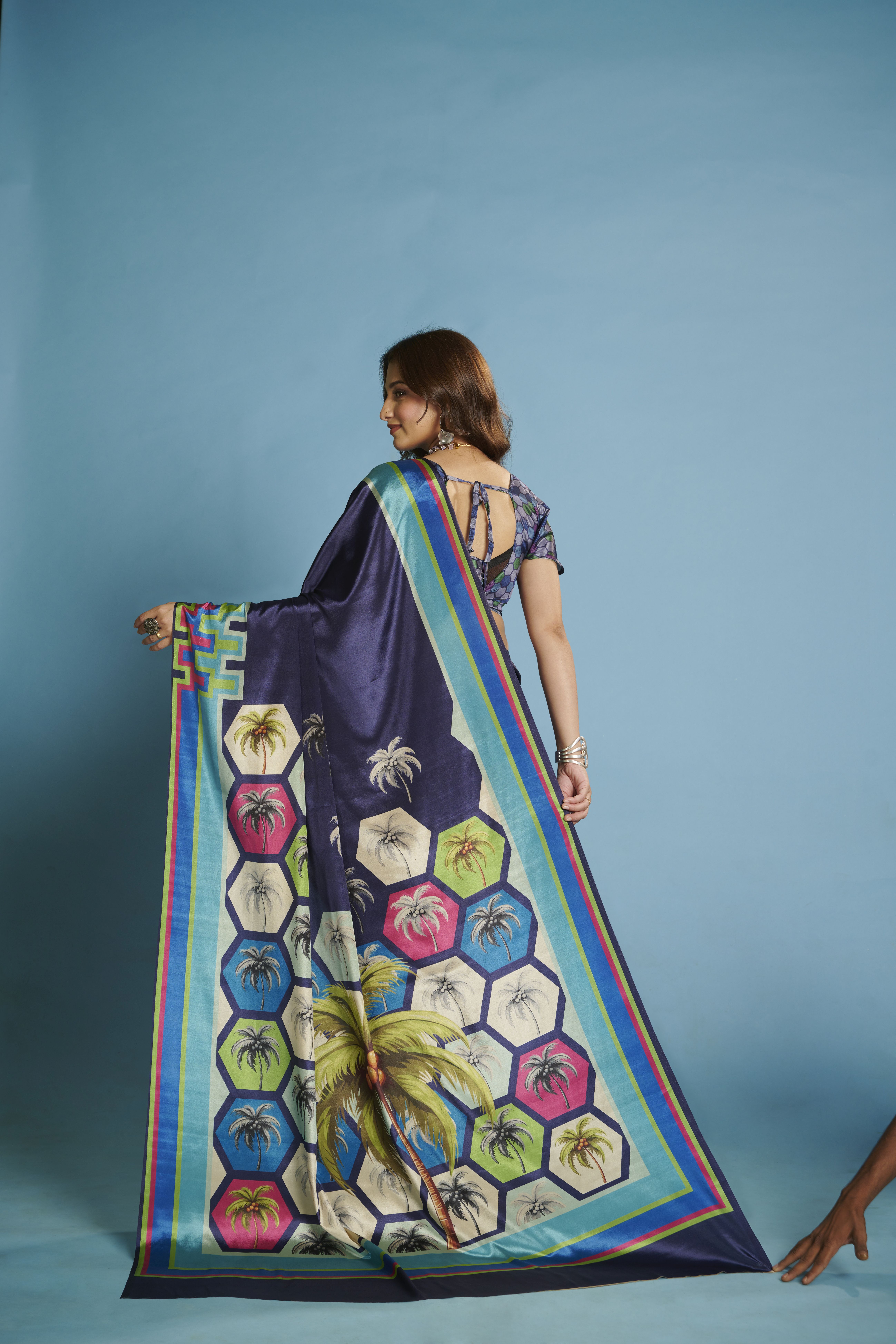 Blue Color Malai Crepe Silk Fabric Beautiful Digital Printed Saree