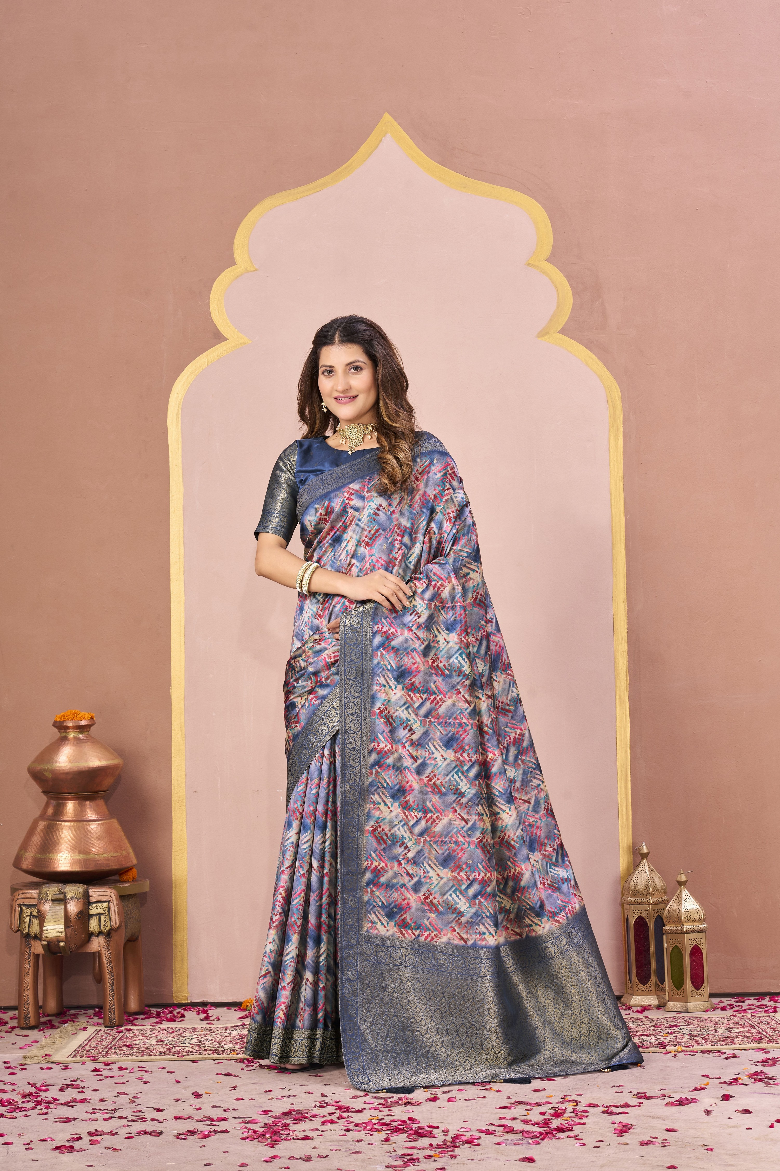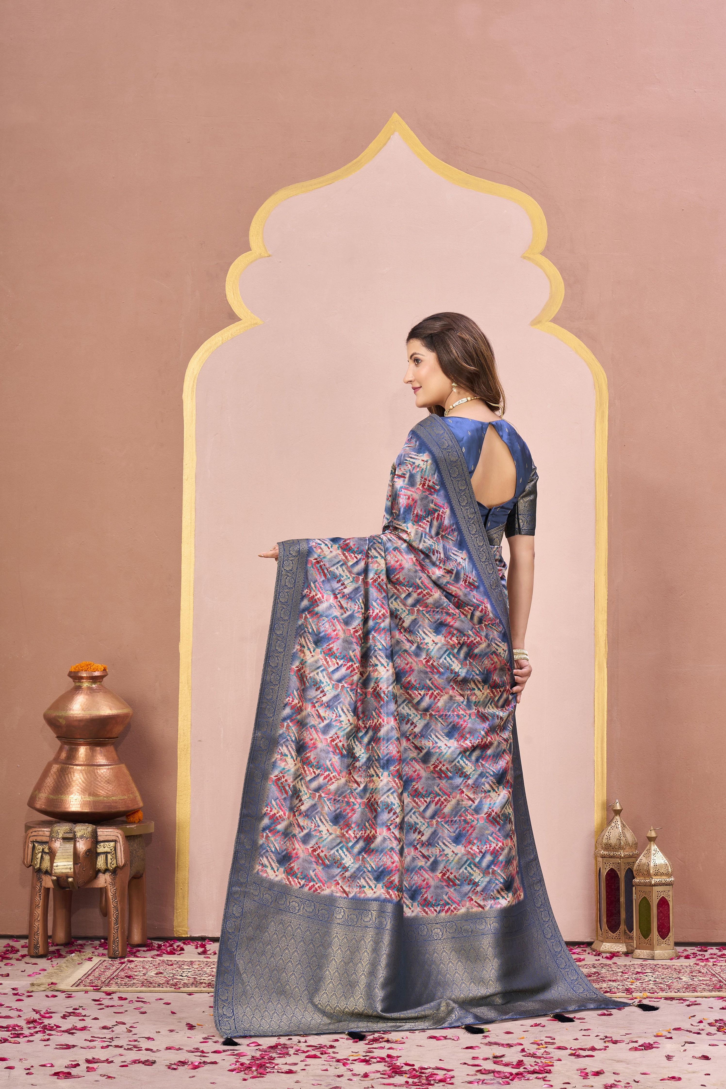 Blue Color Tussar Silk Designer Printed Saree With Woven Designer