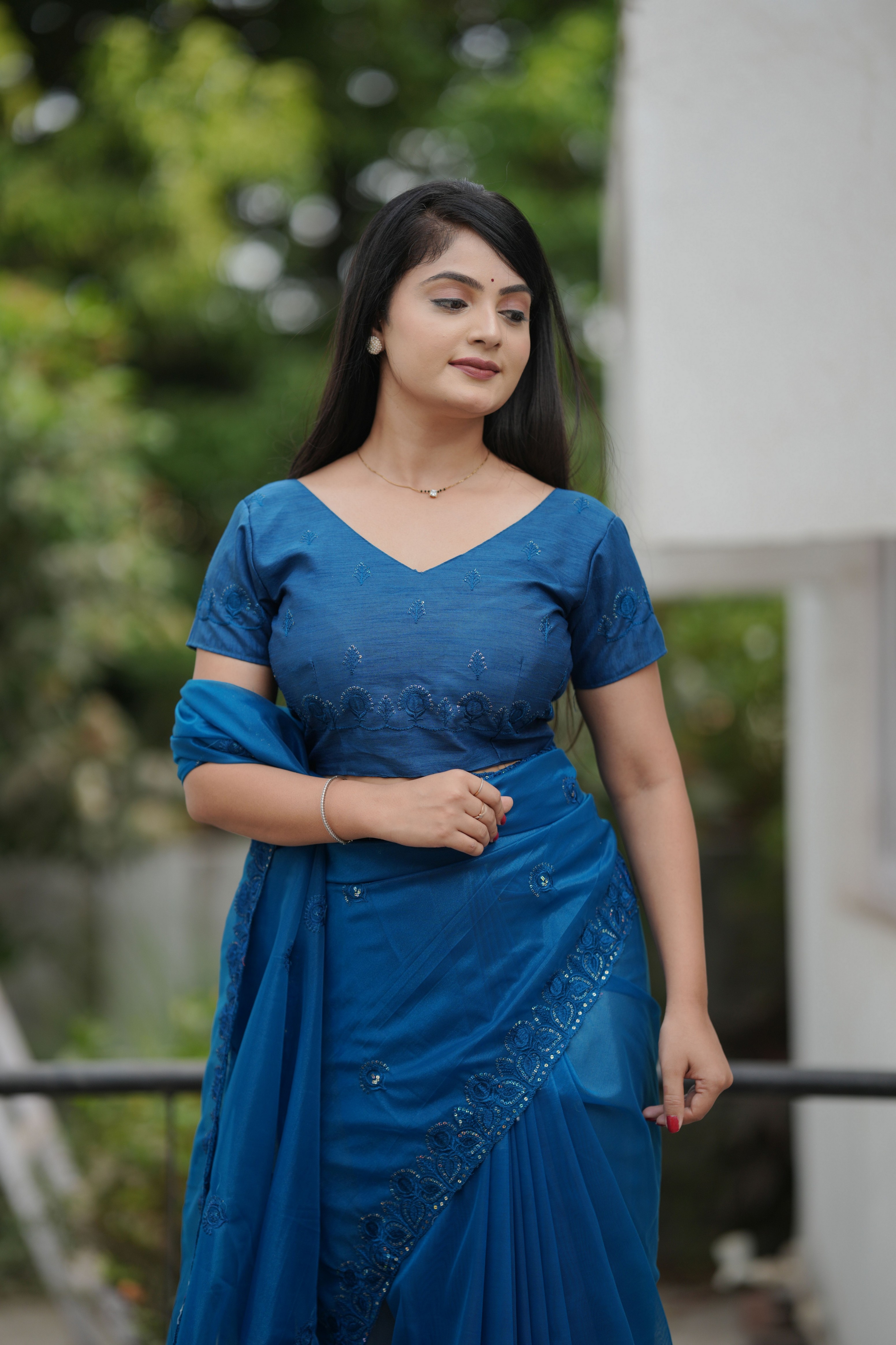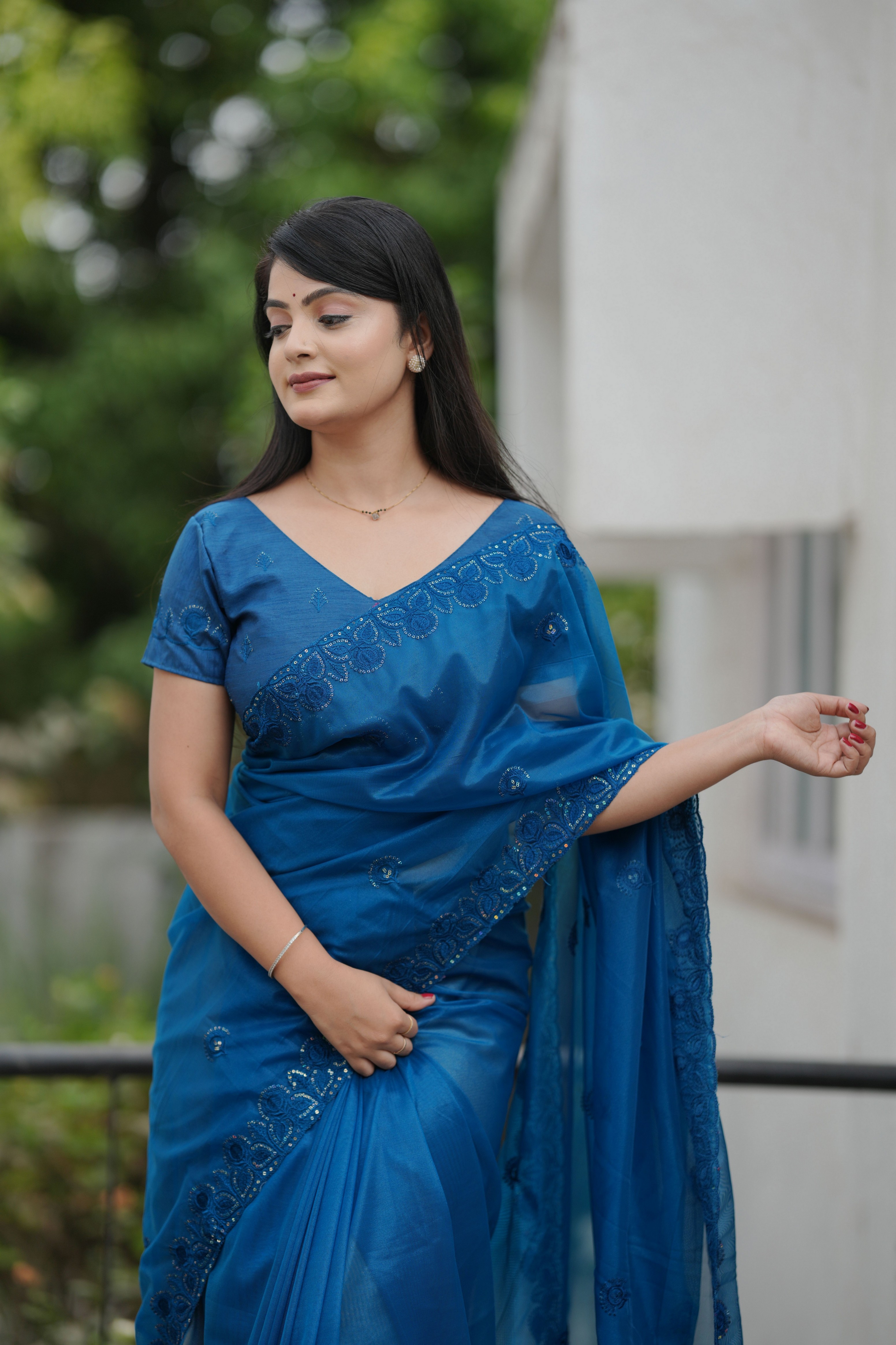Blue Color Twill Net Fabric Sequins Work Ceremonial Saree