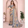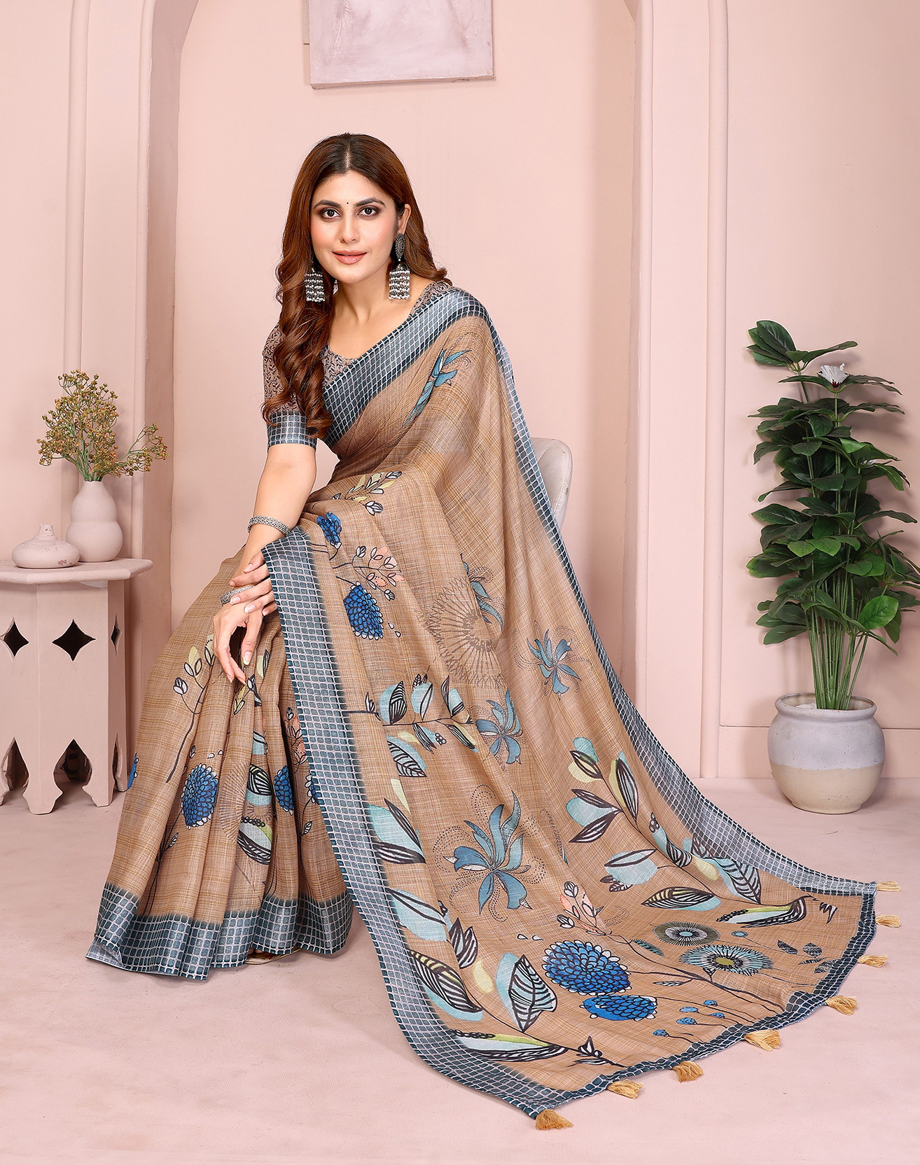 Brown Color Linen Cotton Fabric Designer Printed Formal Looks Sophisticated Saree