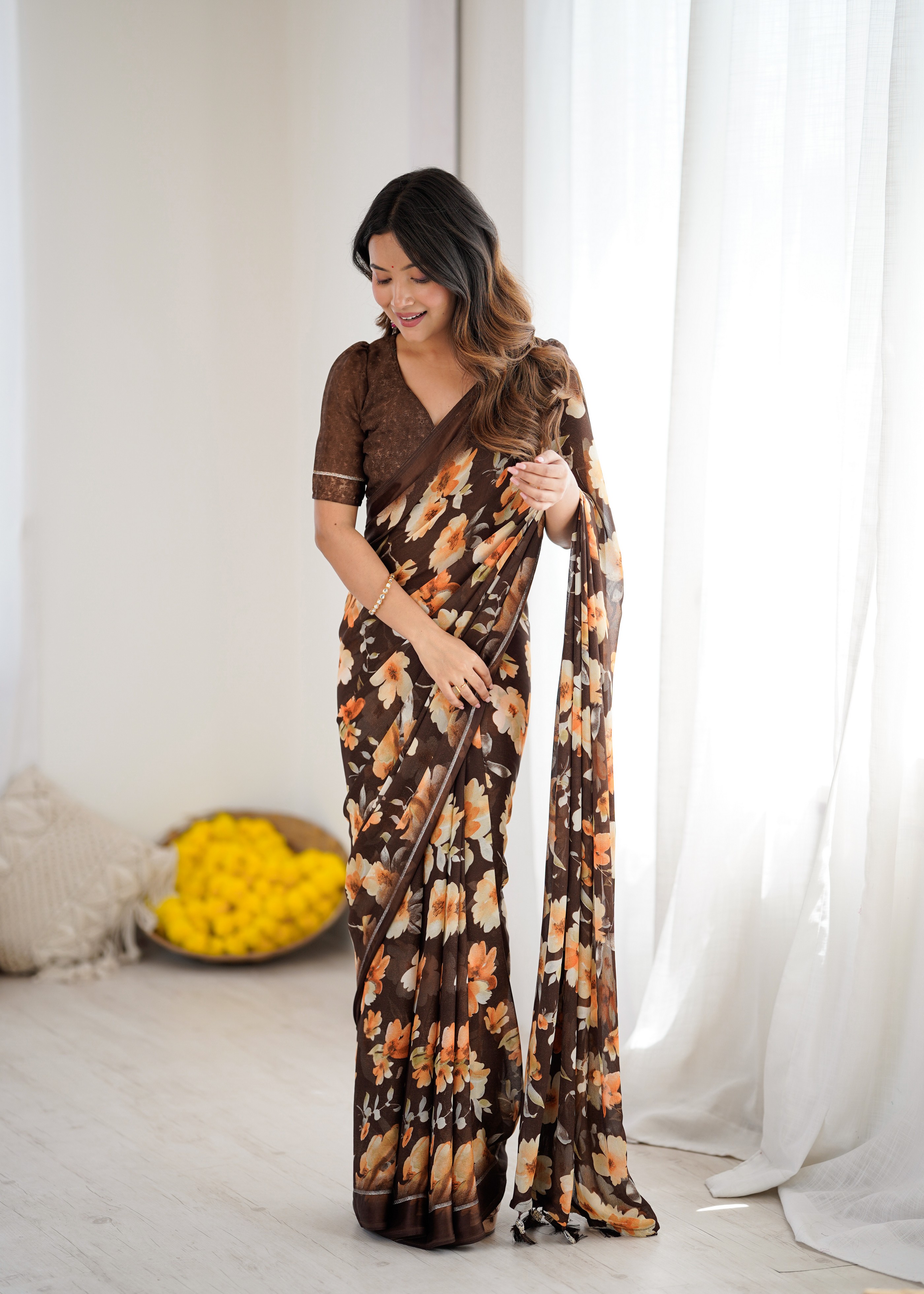 Coffee Color Moss Satin Patta Stylish Partywear Saree