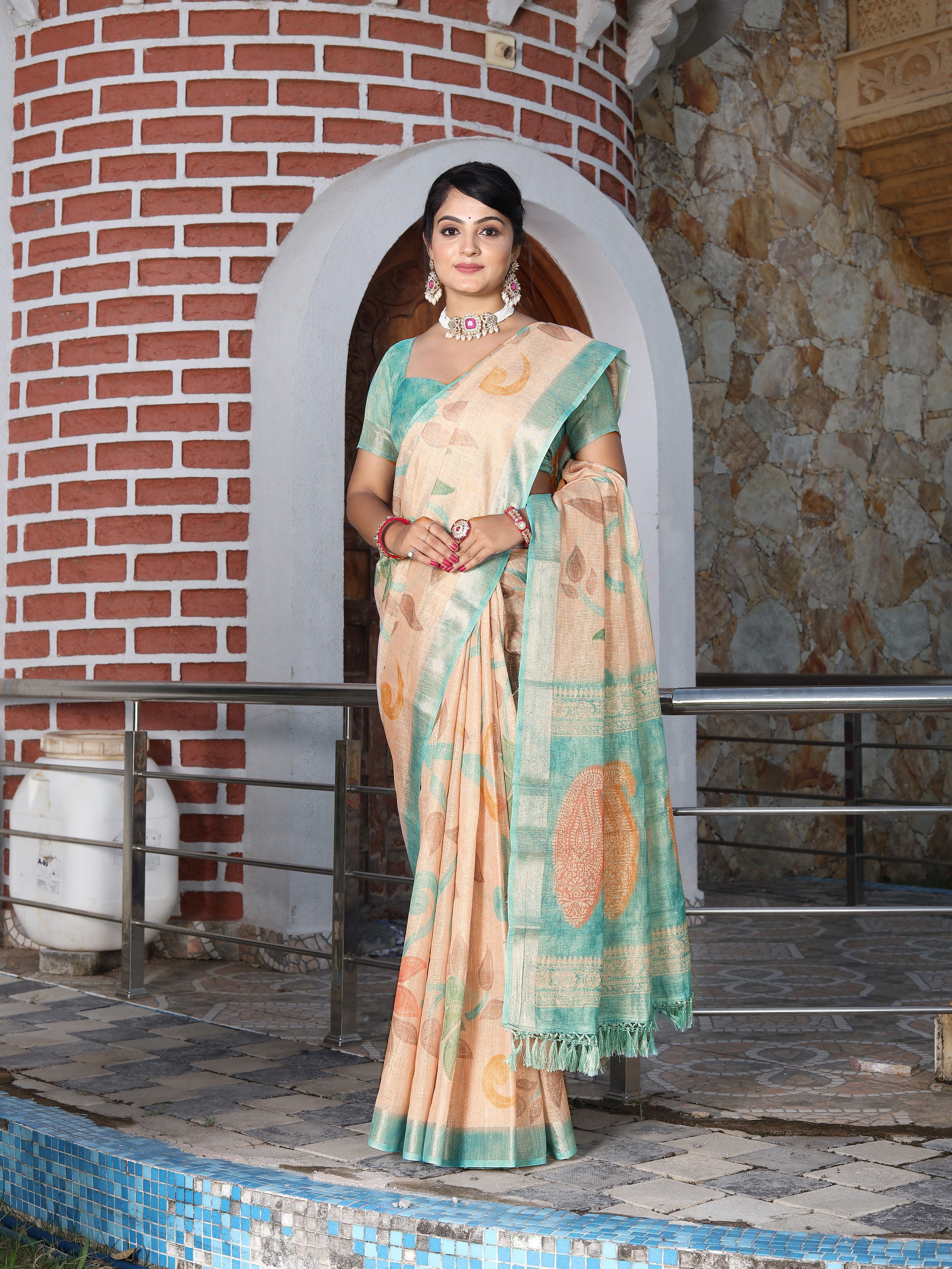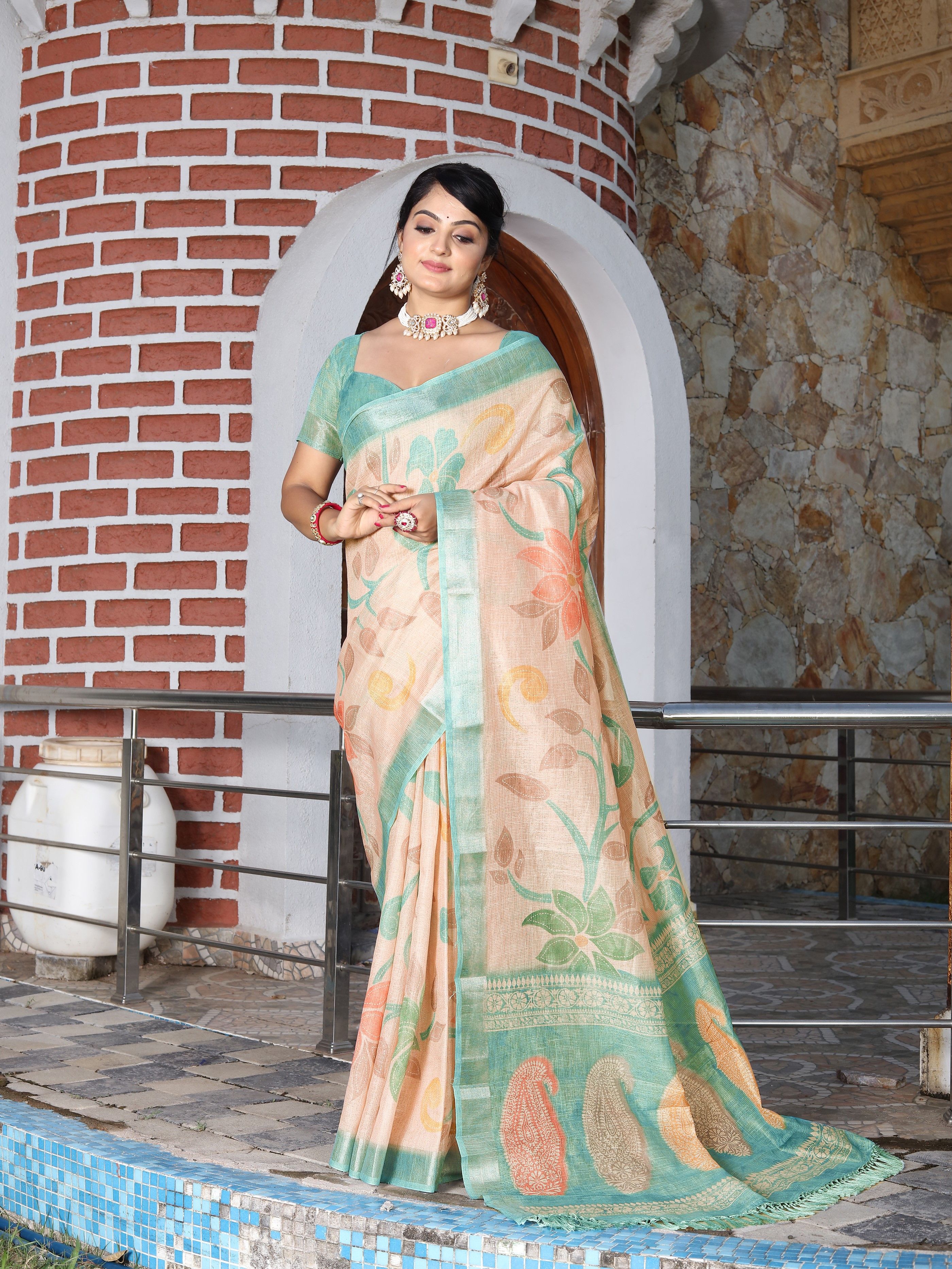 Cream Color Cotton Shimmer Fabric Designer Printed Ethnic Girlie Saree