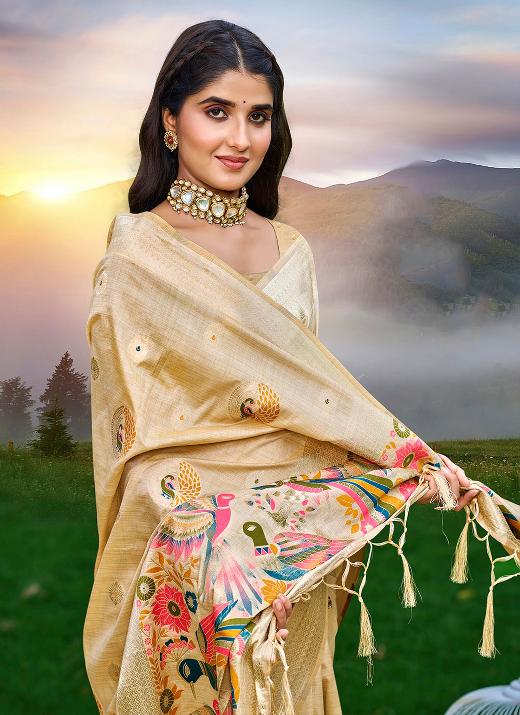 Cream Color Graceful Woven Meenakari Designer Saree On Assam Silk Fabric