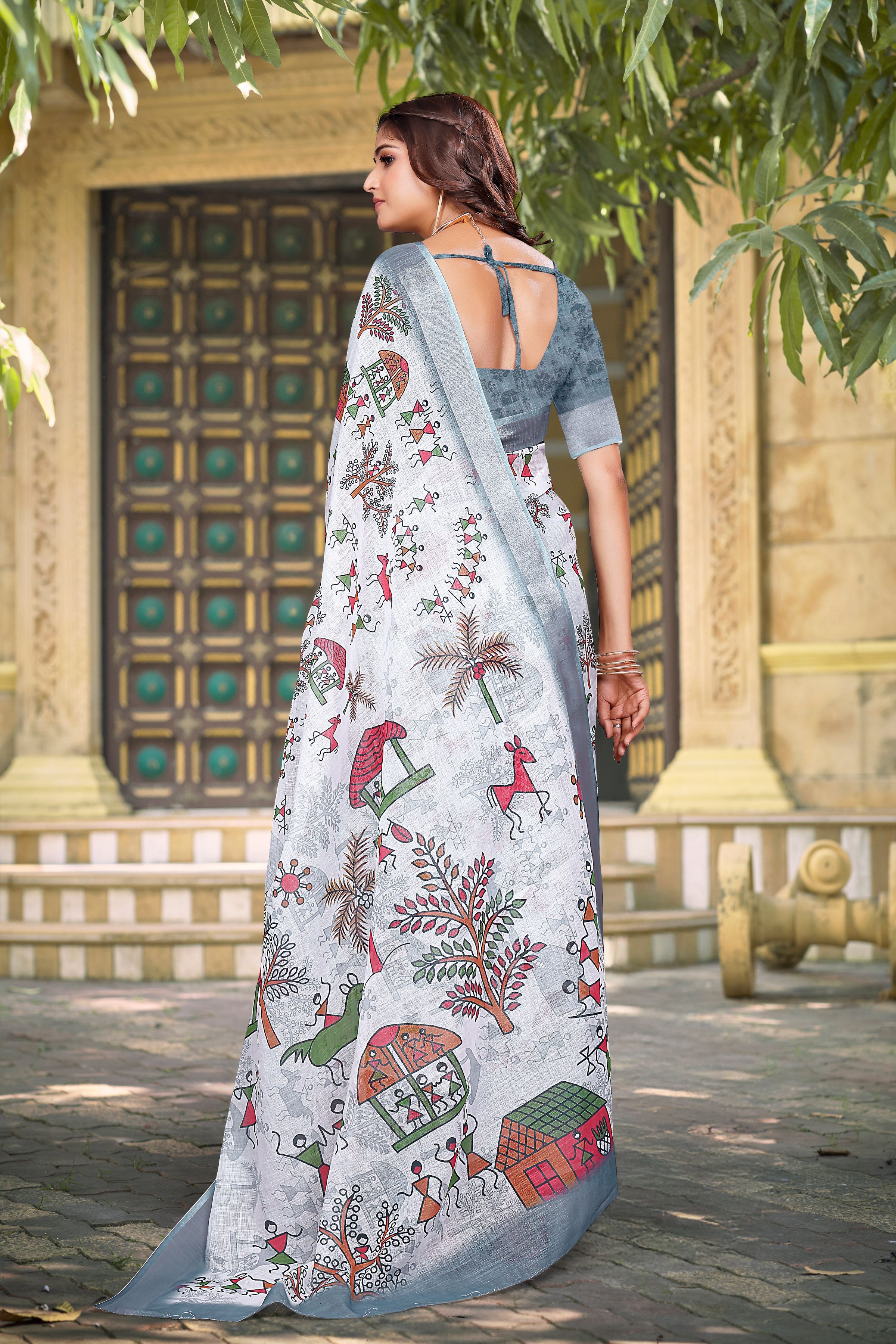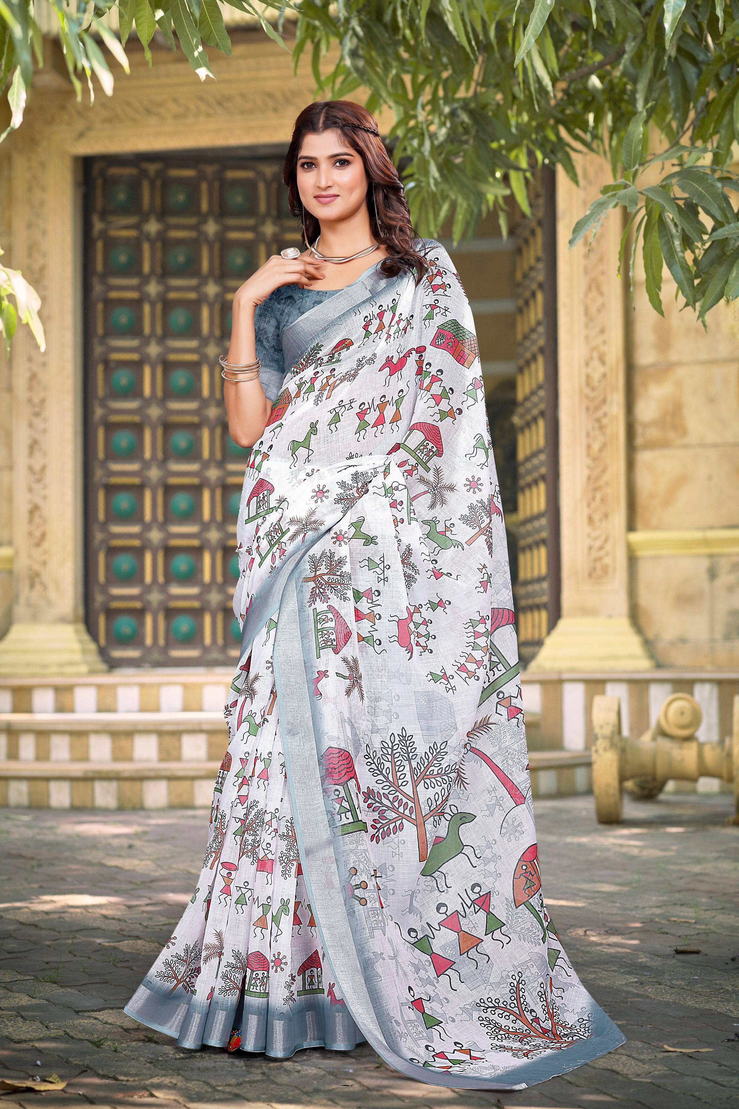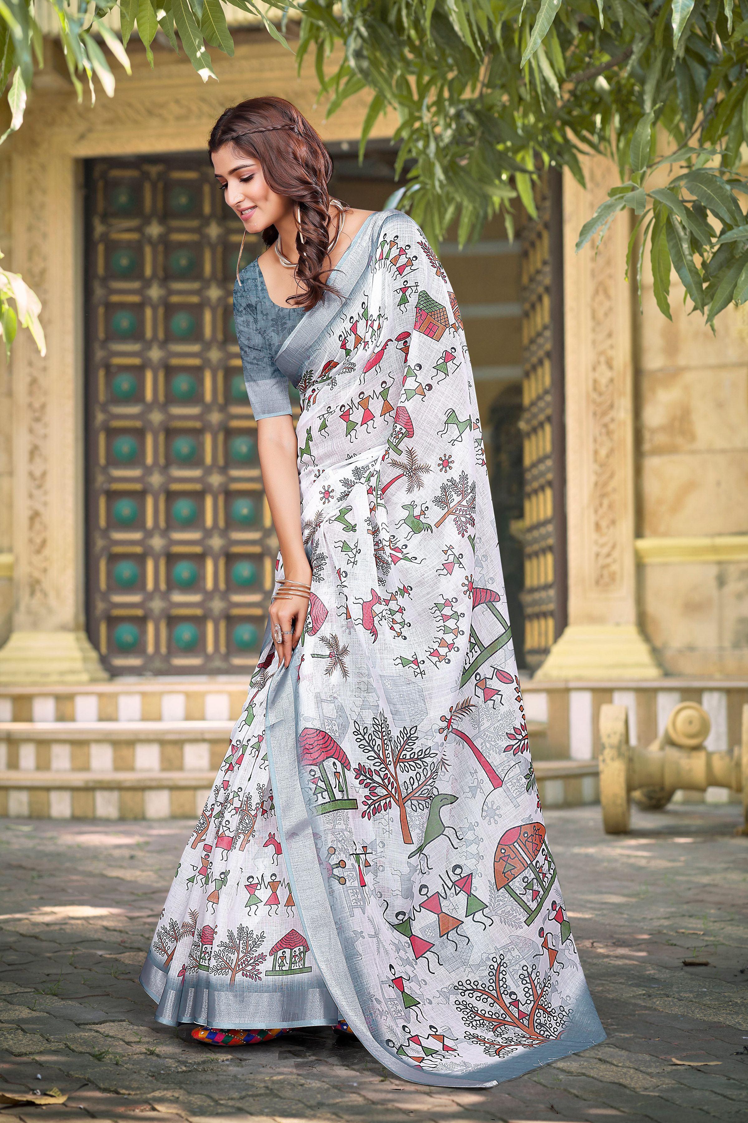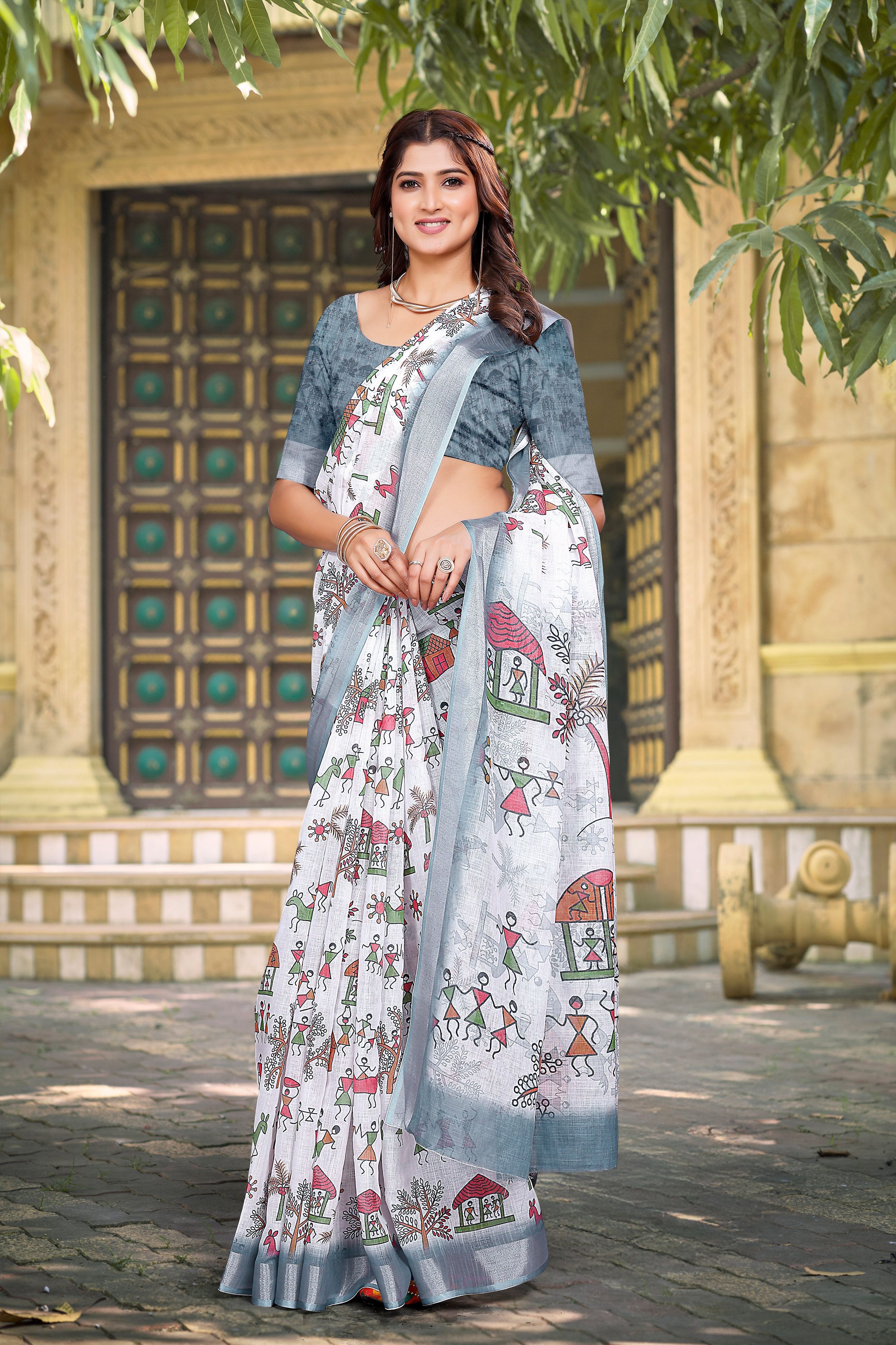 Cream Color Linen Cotton Fabric Beautiful Festive Special Saree