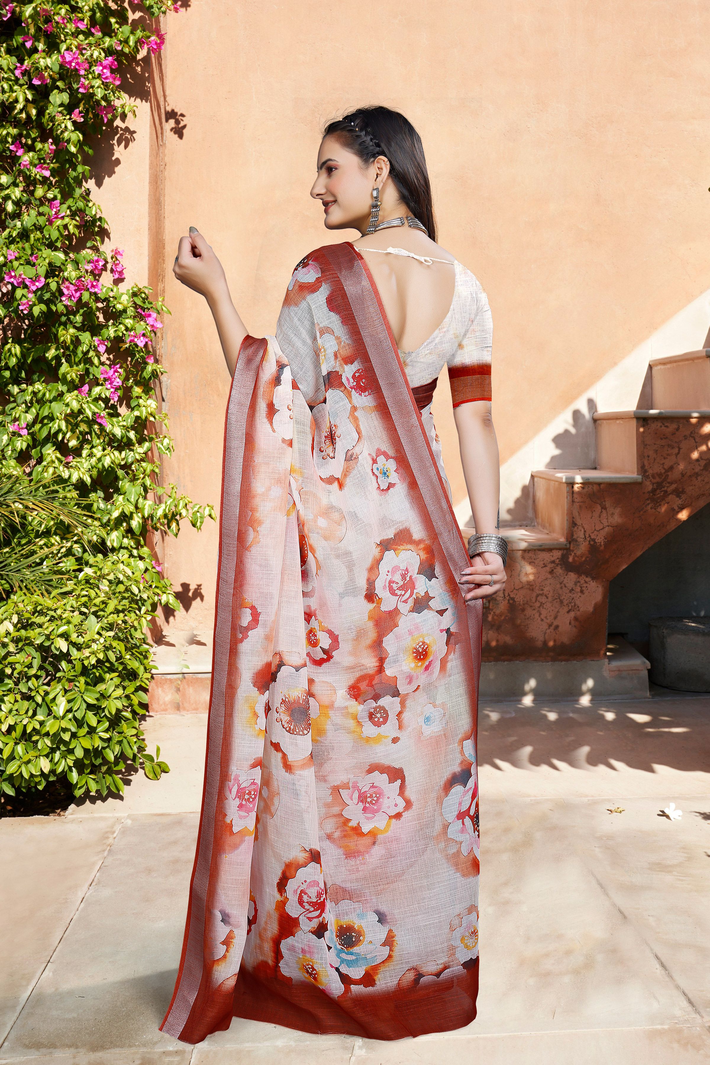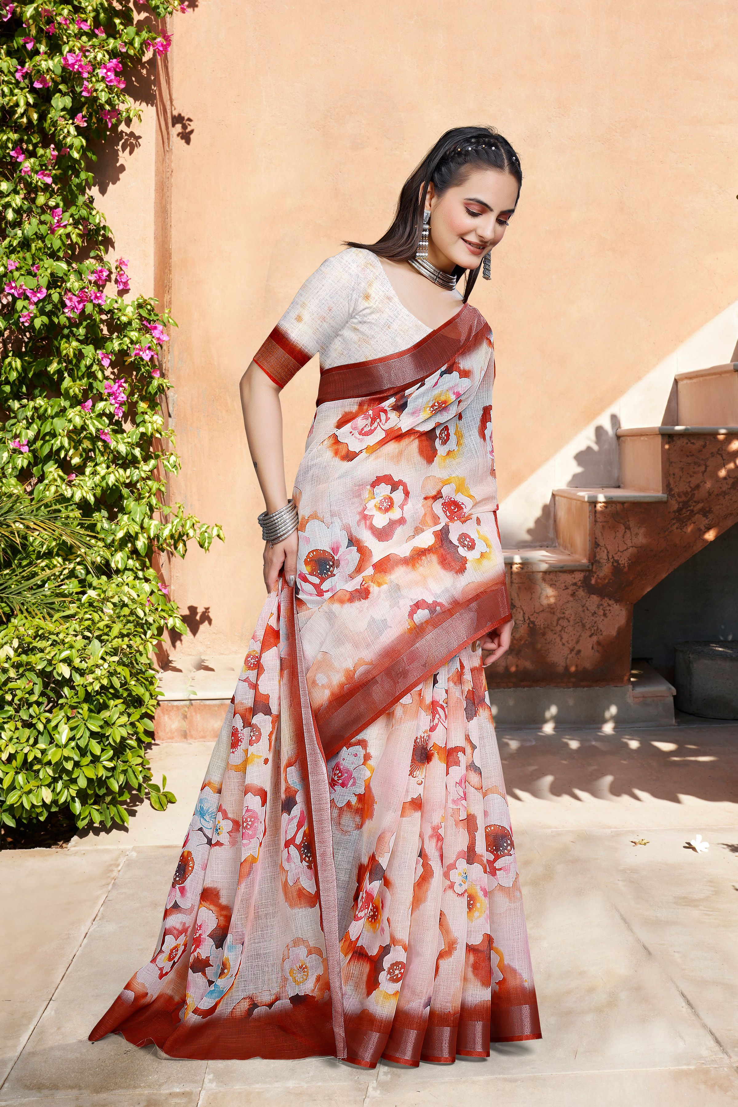 Cream Color Linen Cotton Fabric Woven Border Designer Printed Saree