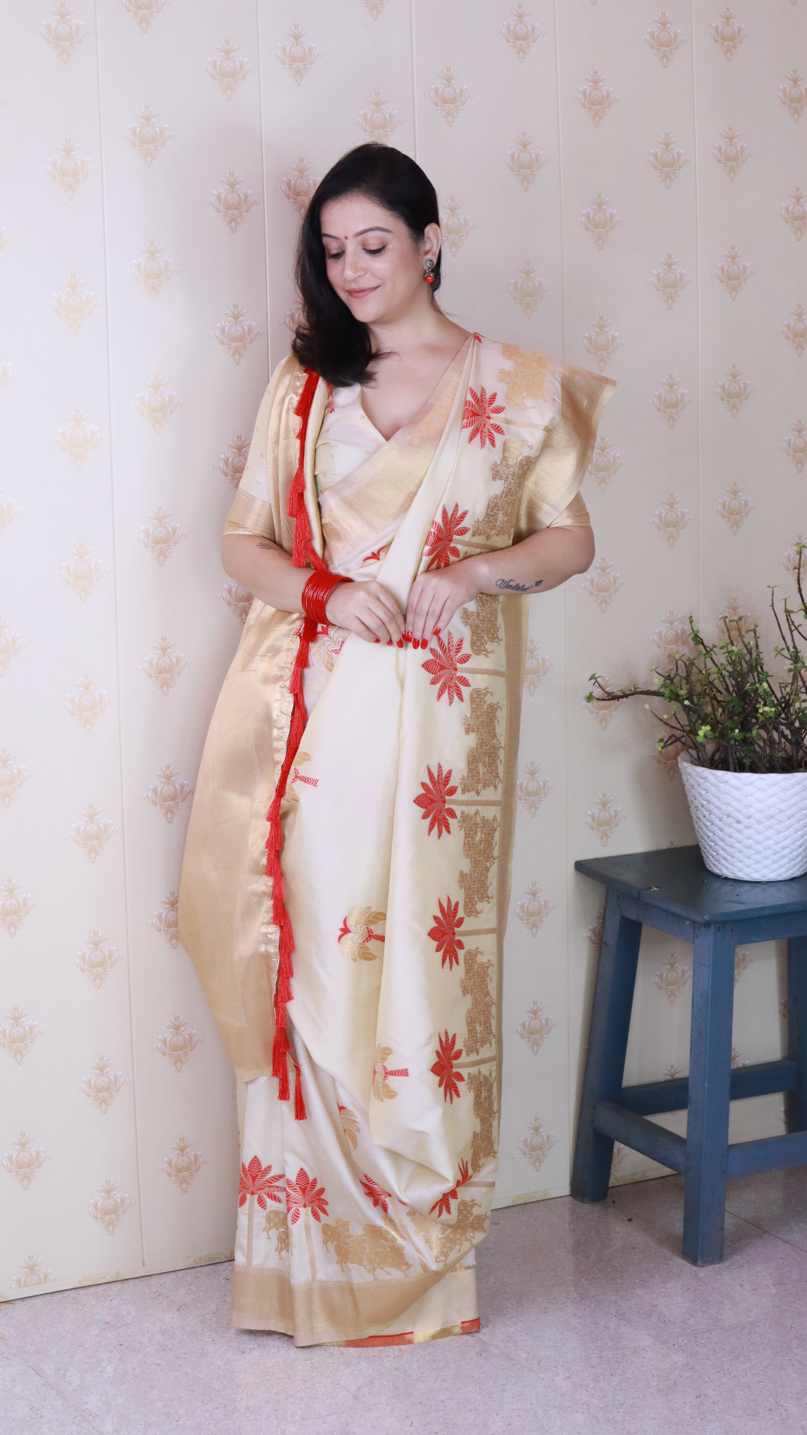 CreamColor Soft Silk Fabric Woven Meenakari Designer Ceremonial Partywear Saree