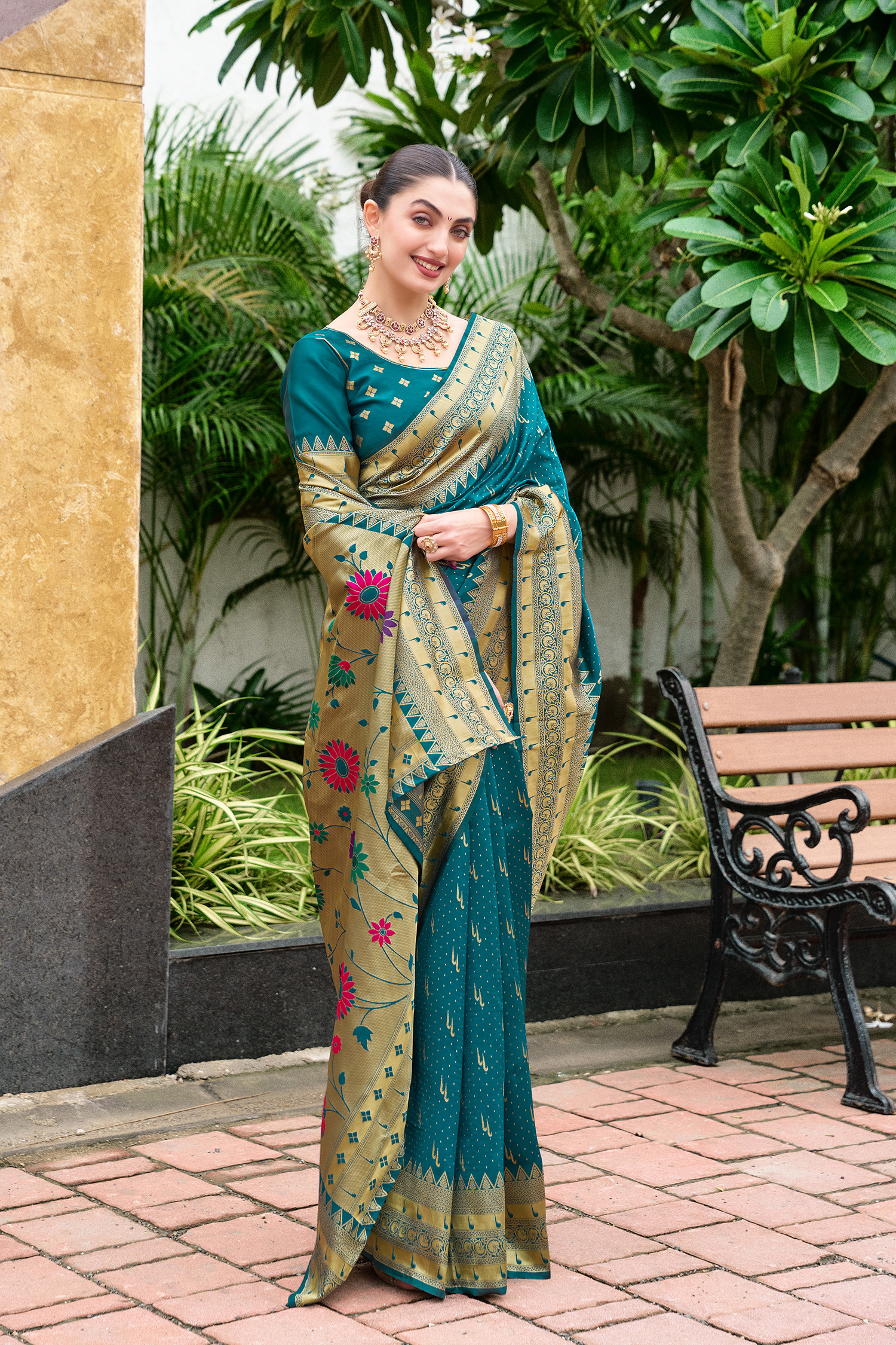 Deep Teal Color Beautiful Silk Blended Woven Zari Designer Ceremonial Saree