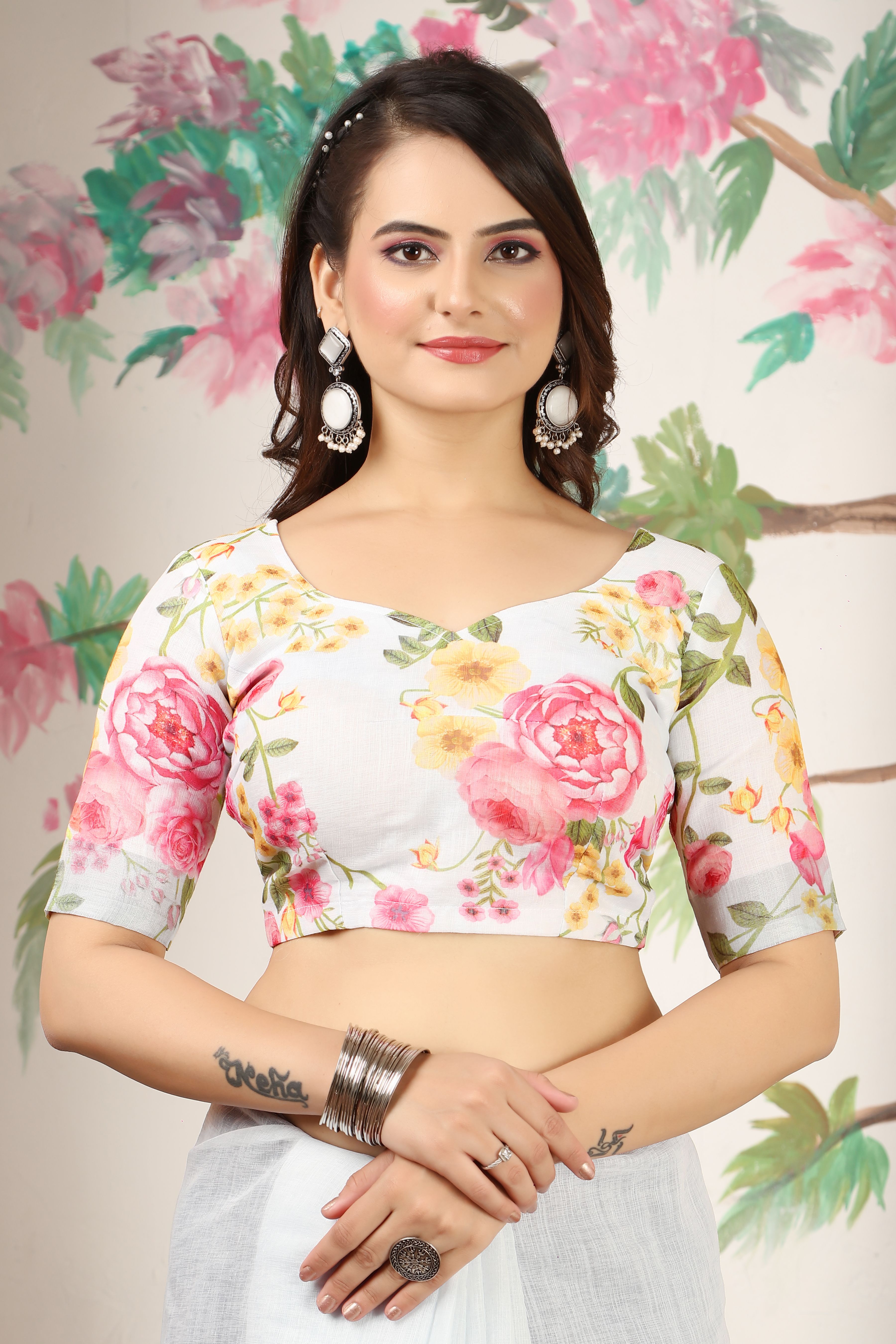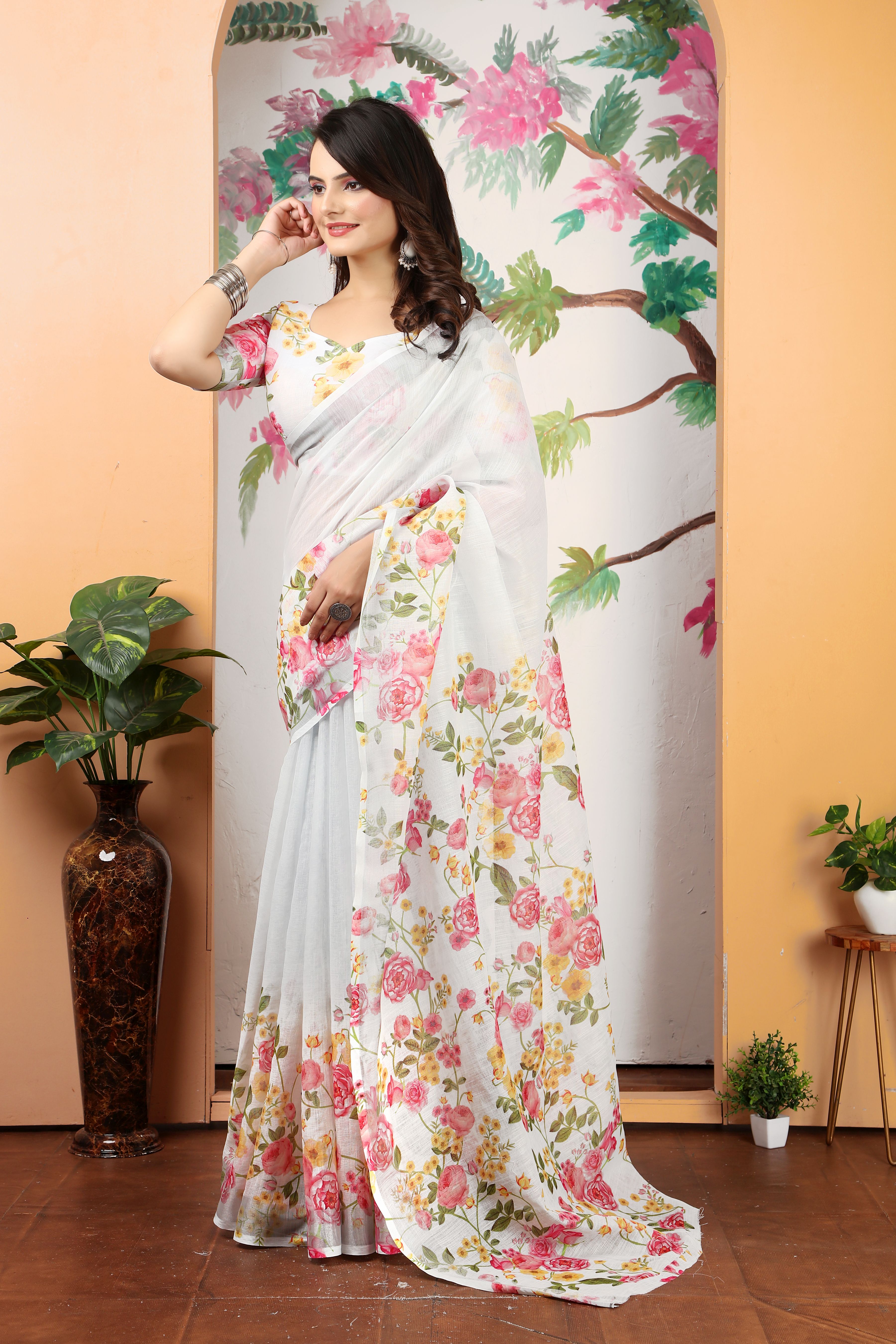 Ethnic Off White Color Beatutiful Linen Cotton Digital Printed Saree