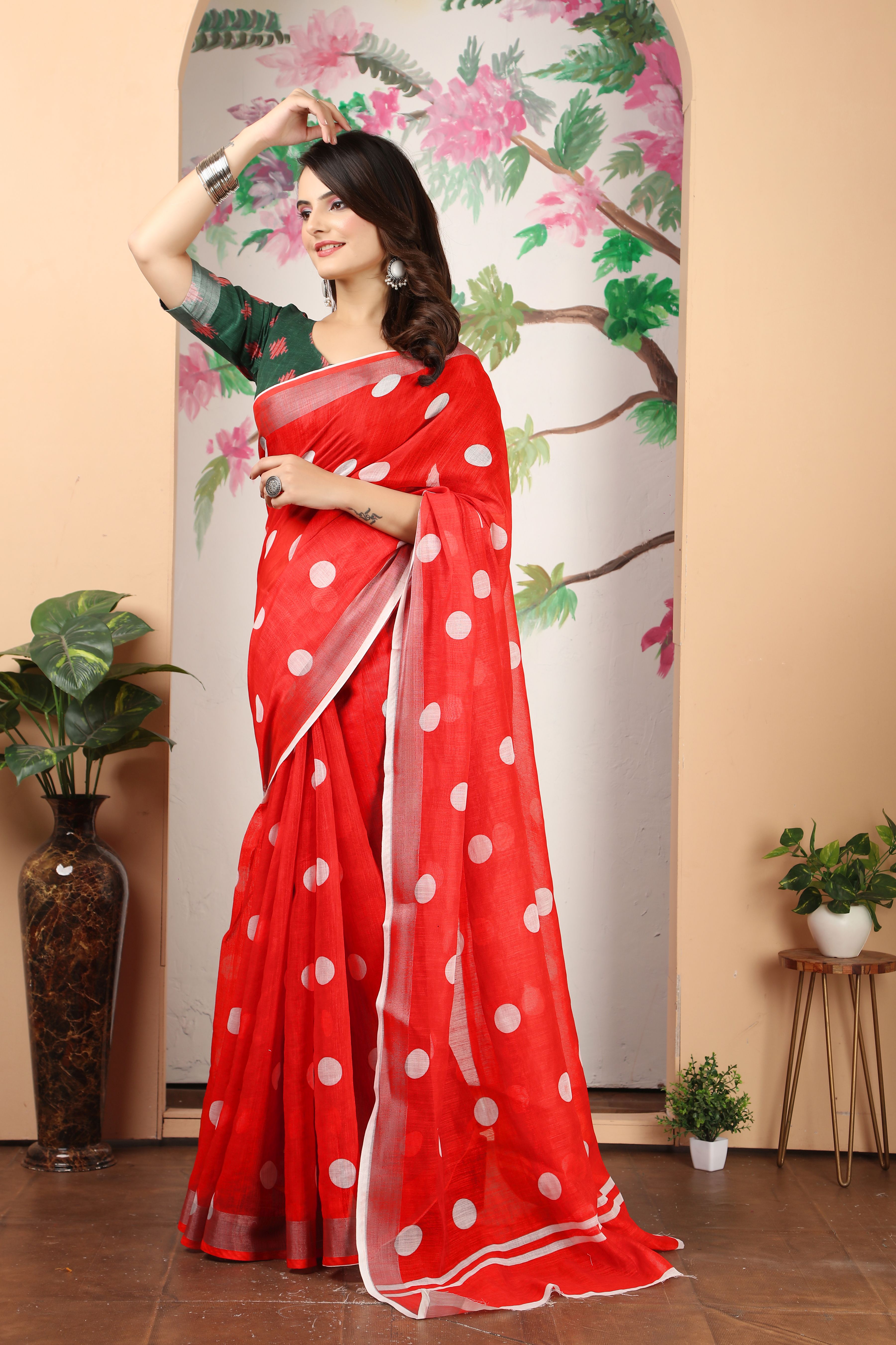 Ethnic Red Color Beatutiful Linen Cotton Digital Printed Saree