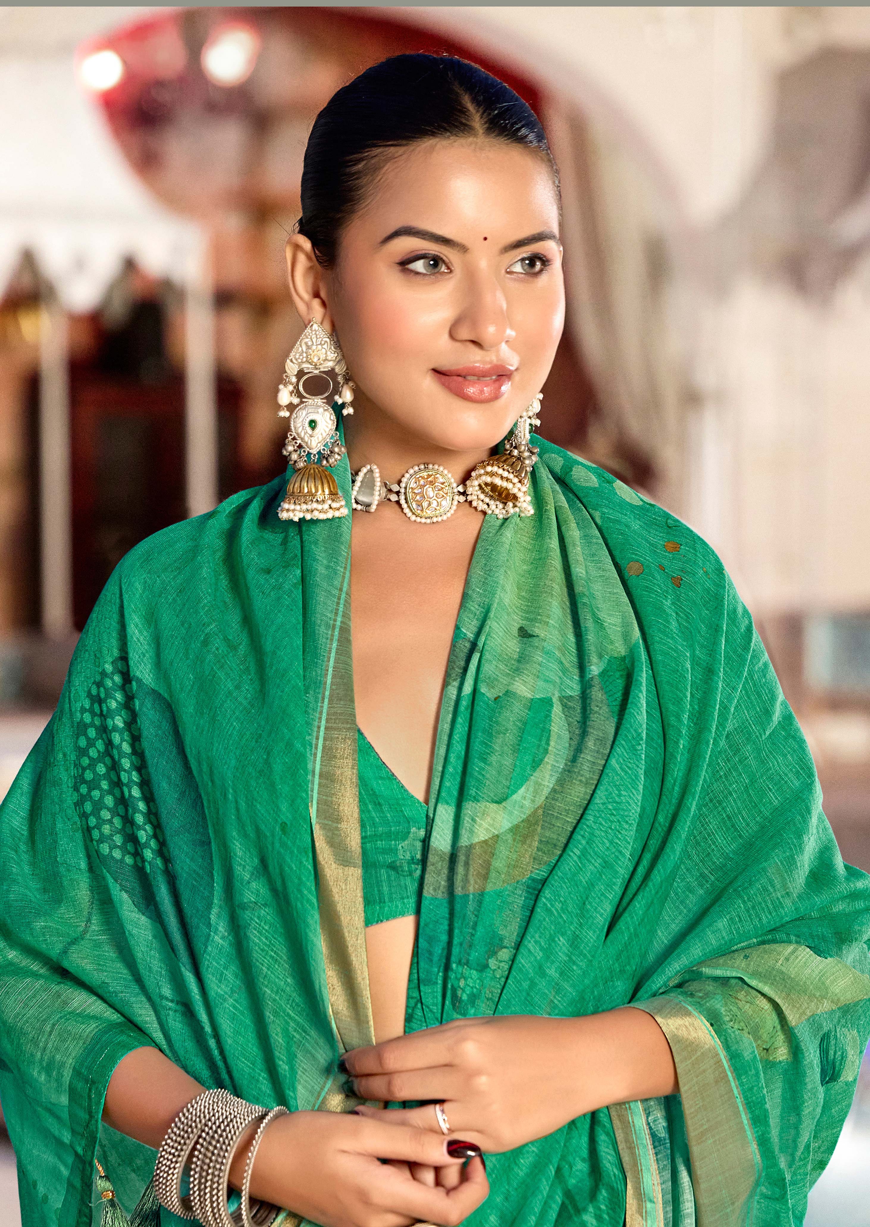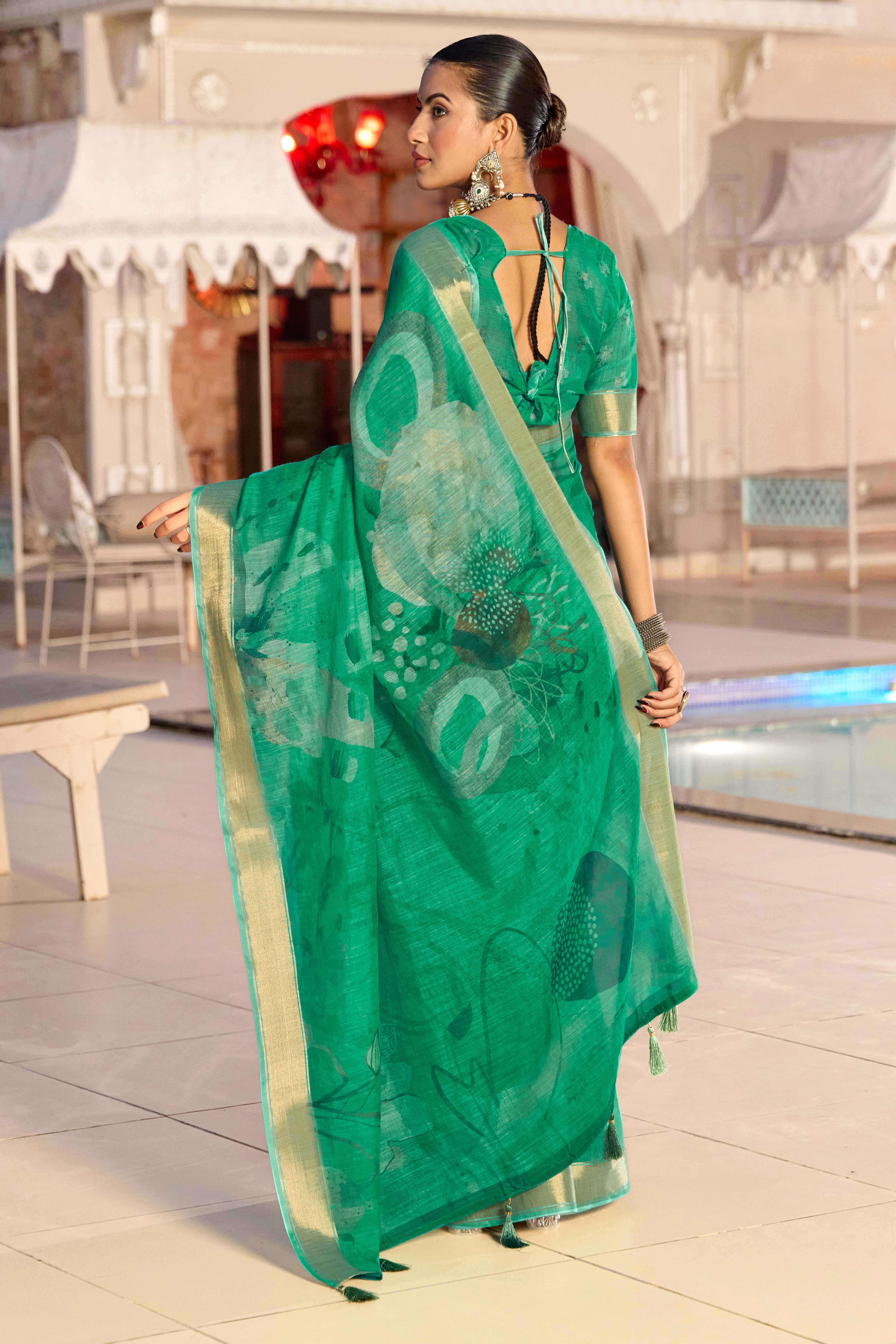 Green Color Beautiful Linen Silk Fabric Saree With Sophisticated Partywear Saree