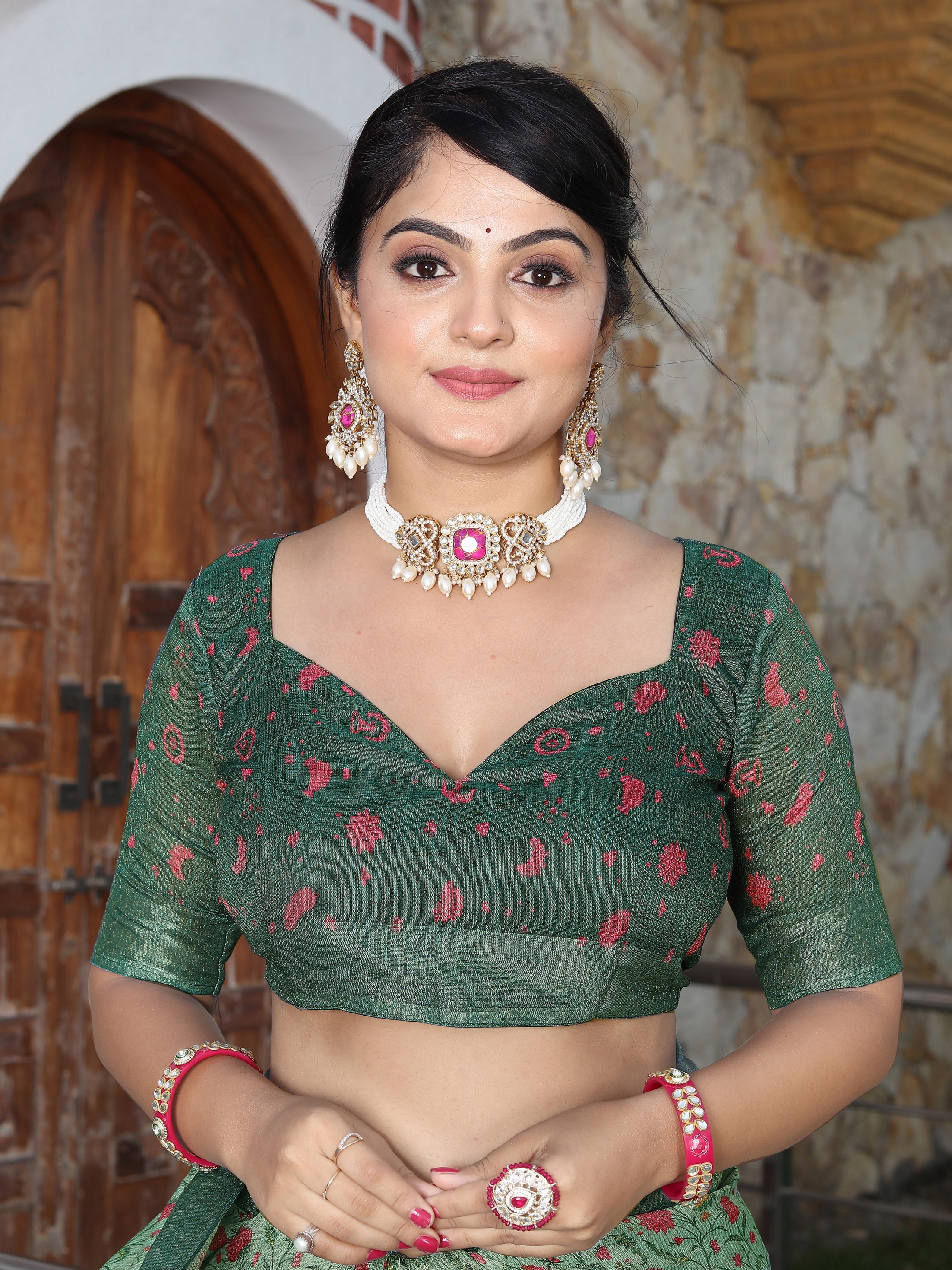 Green Color Cotton Shimmer Fabric Smart Printed Saree With Woven Border