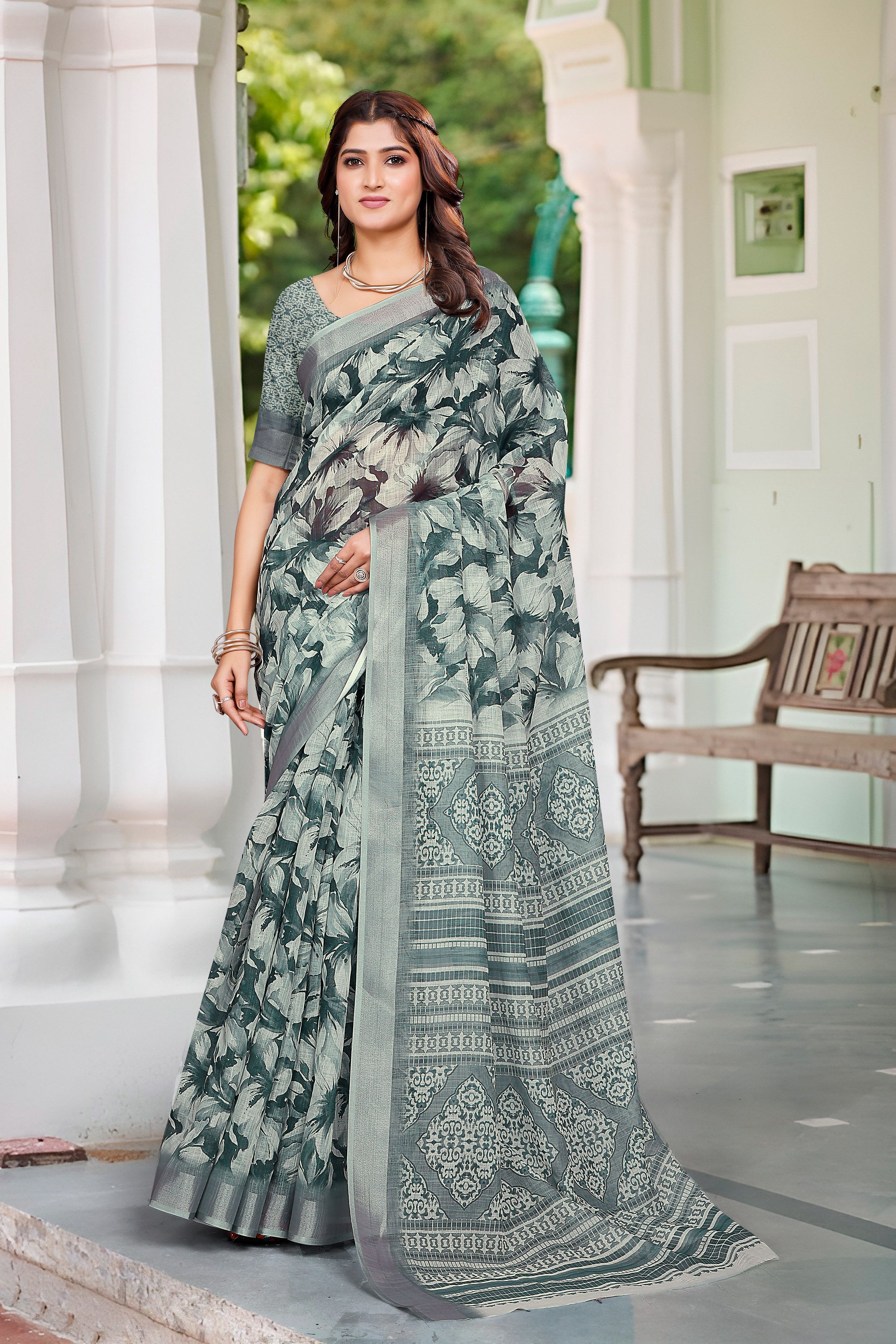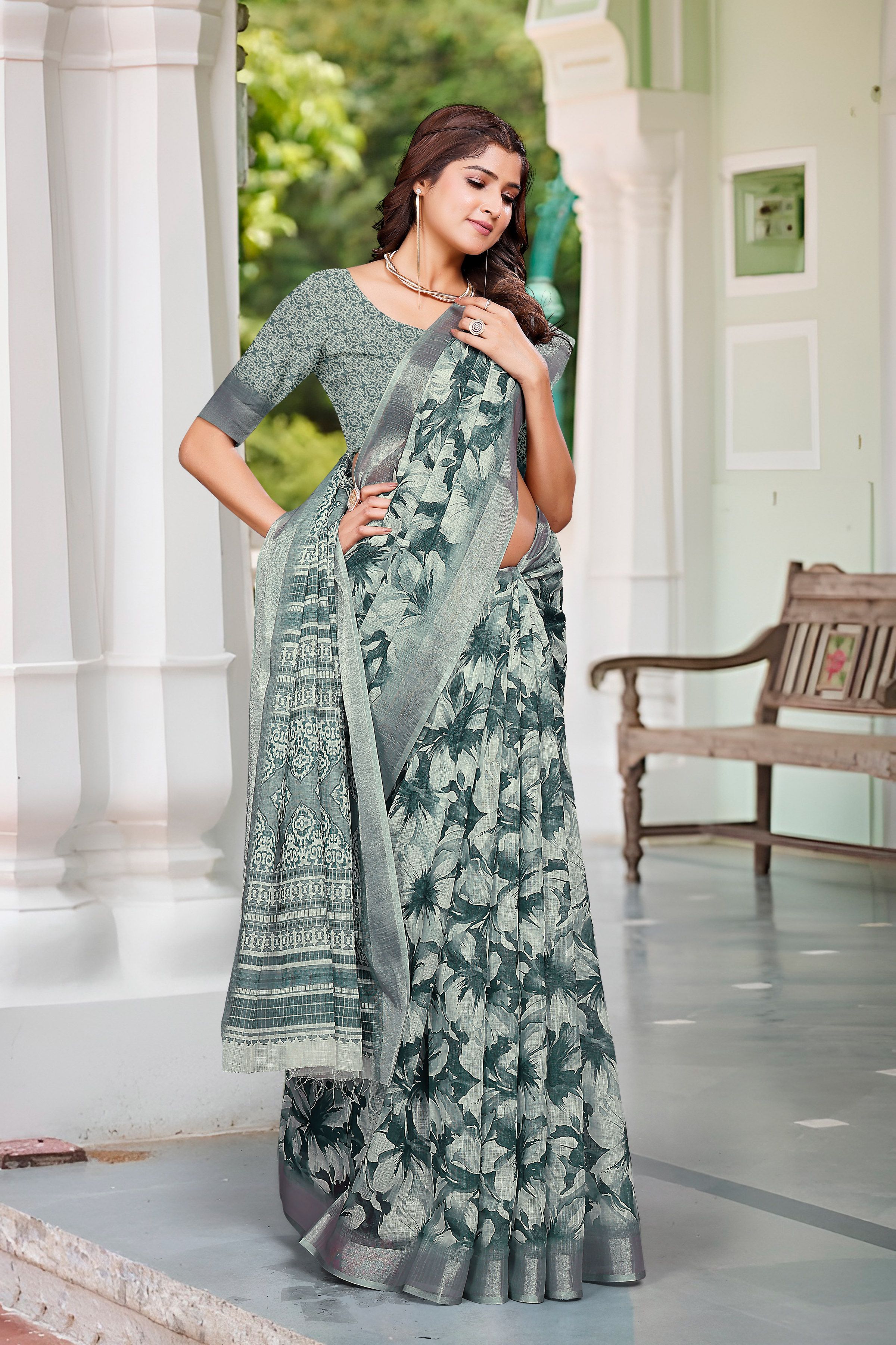Green Color Linen Cotton Fabric Beautiful Festive Special Saree