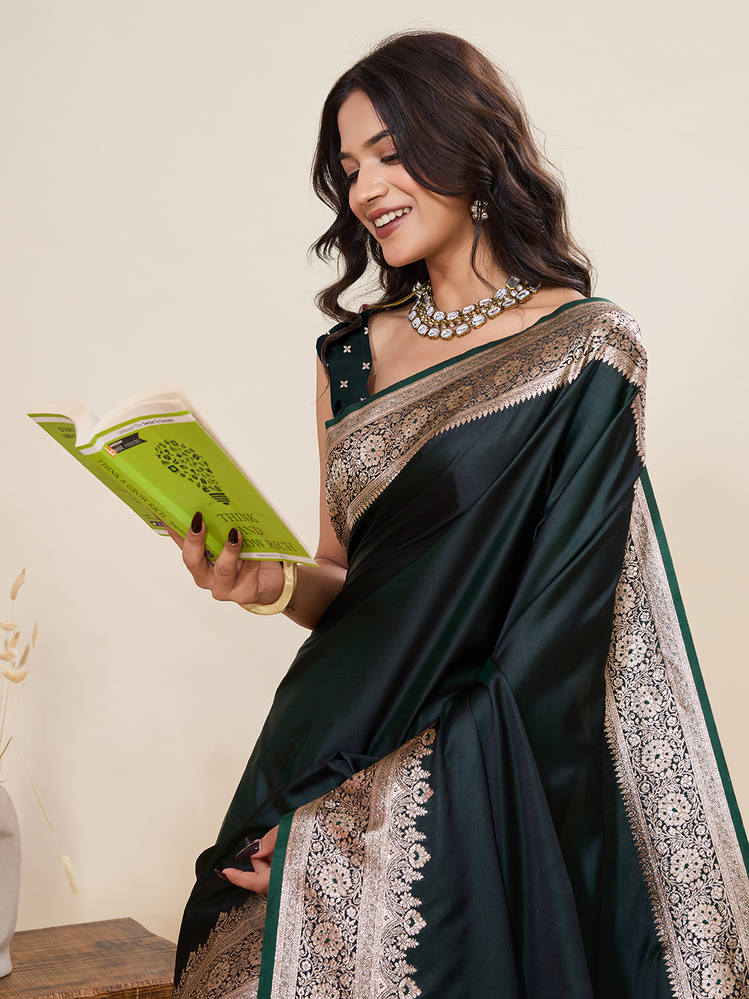 Green Color Satin Silk Fabric Wevon Jari Designer Graceful Partywear Saree