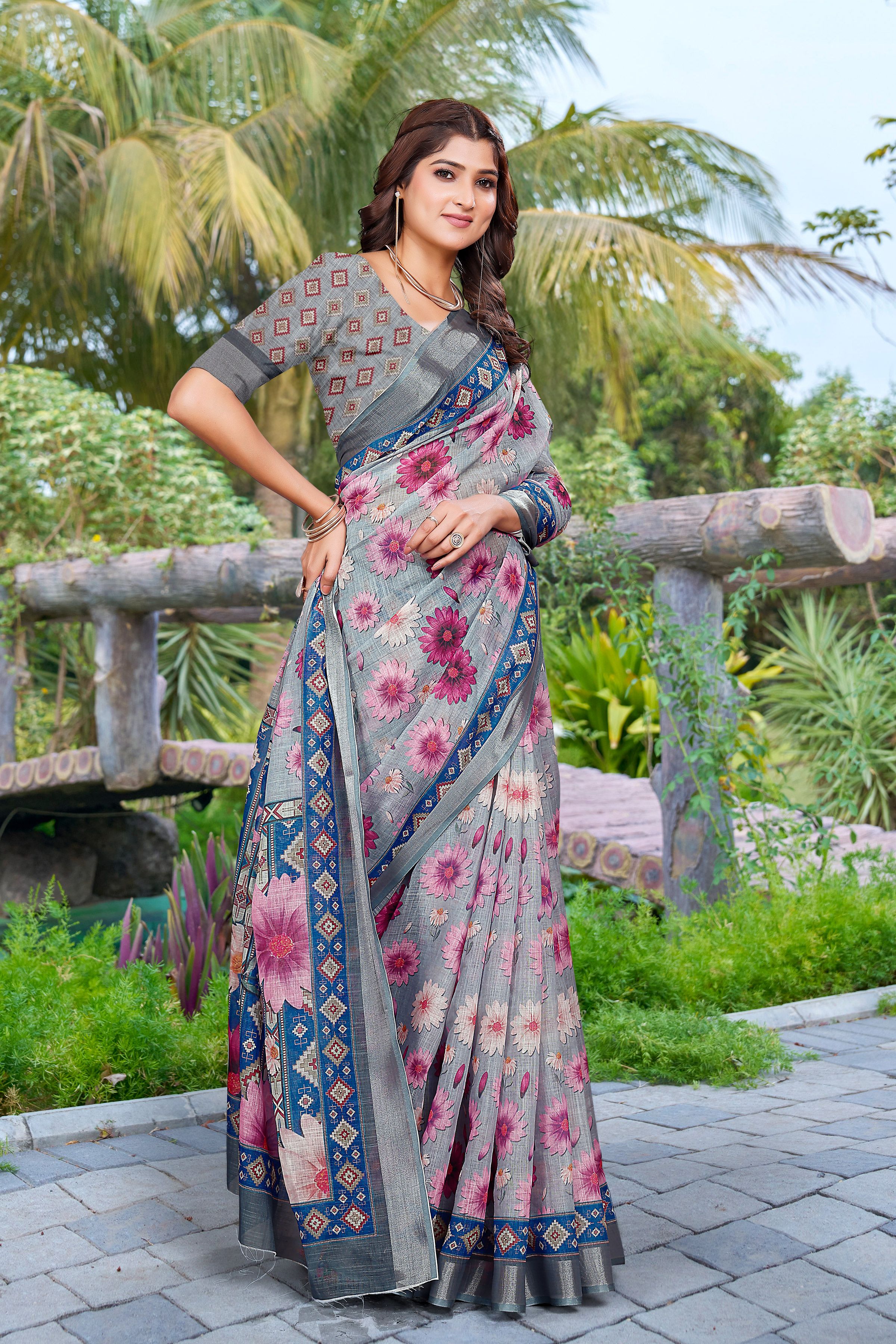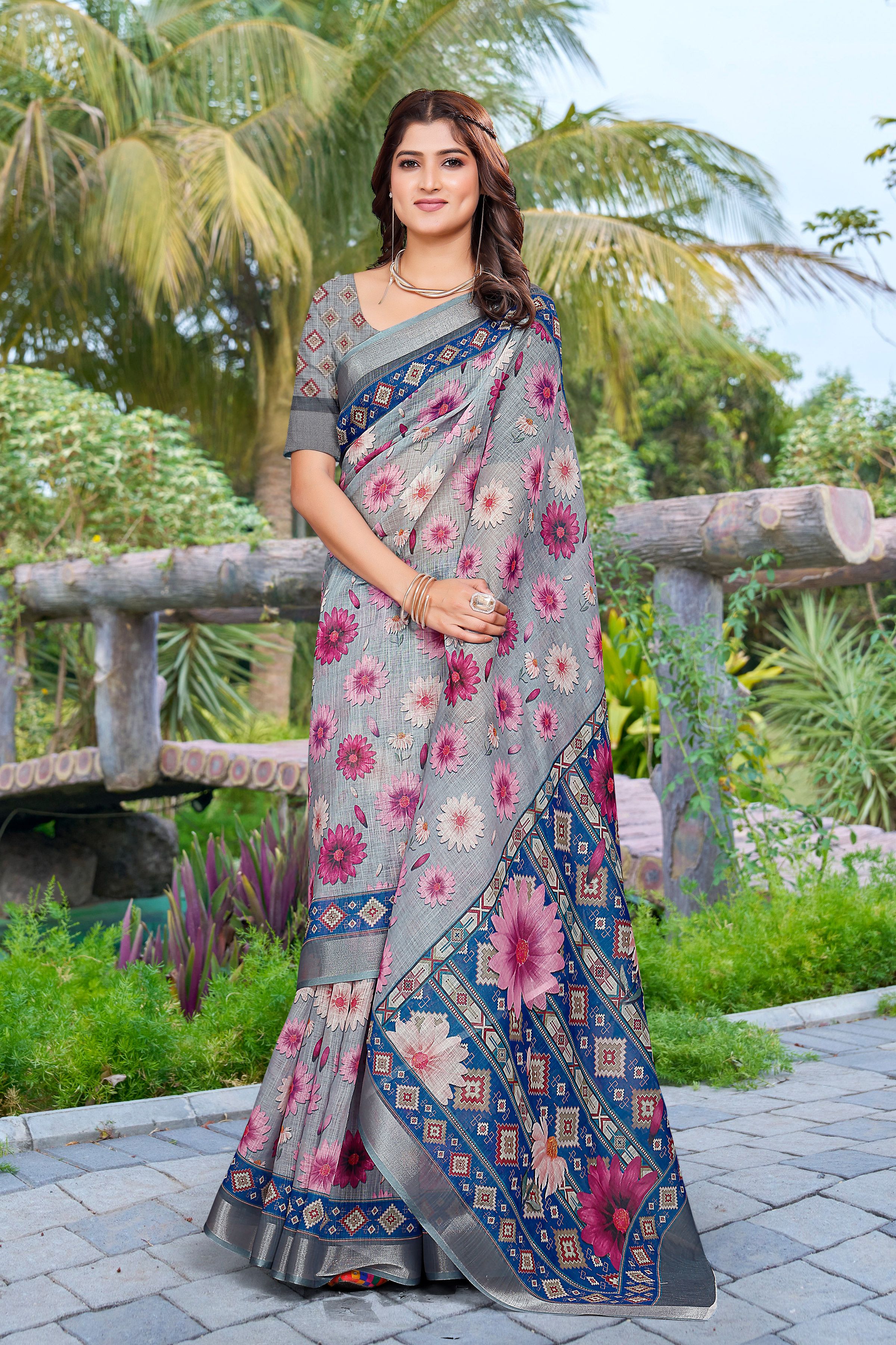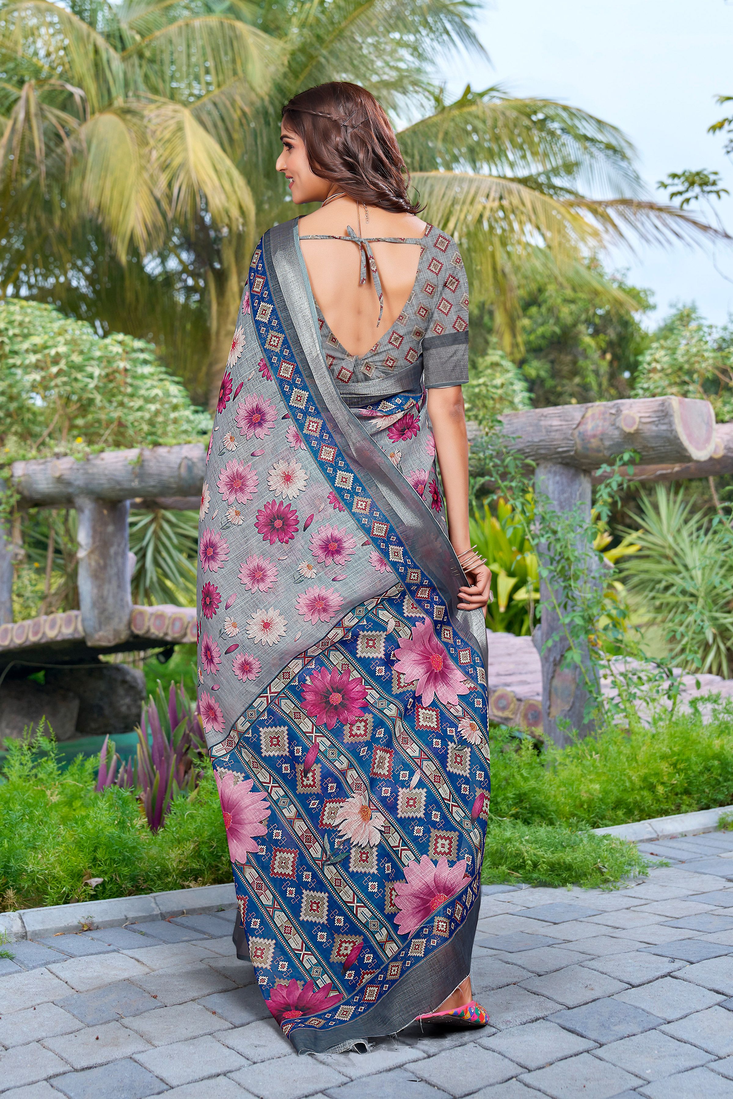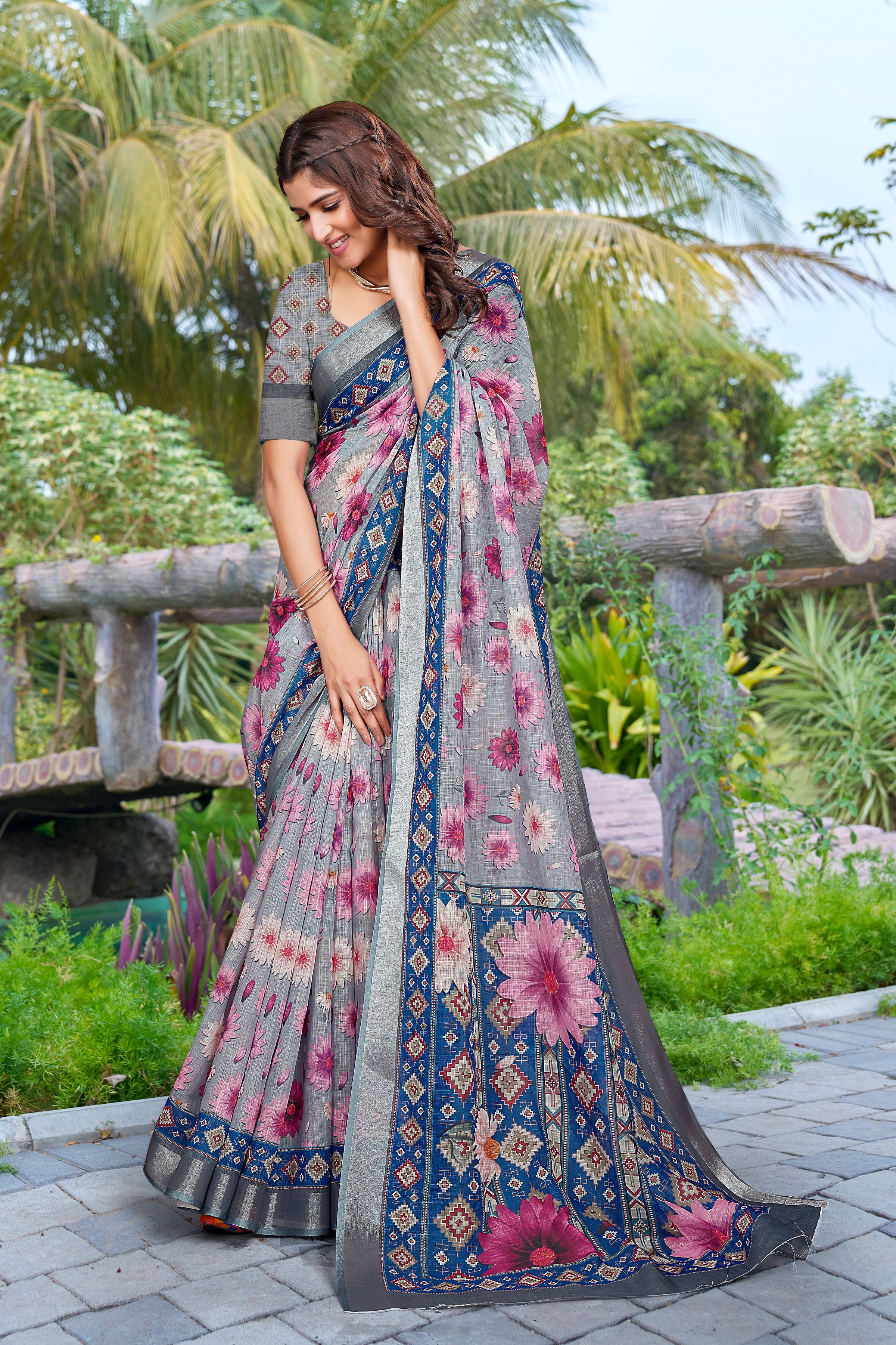 Grey Color Linen Cotton Fabric Beautiful Festive Special Saree