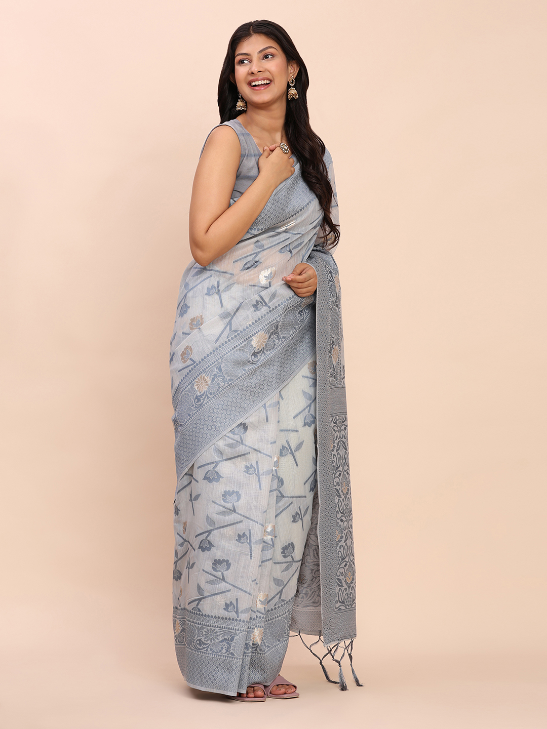 Grey Color Linen Cotton Fabric Woven Designer Saree