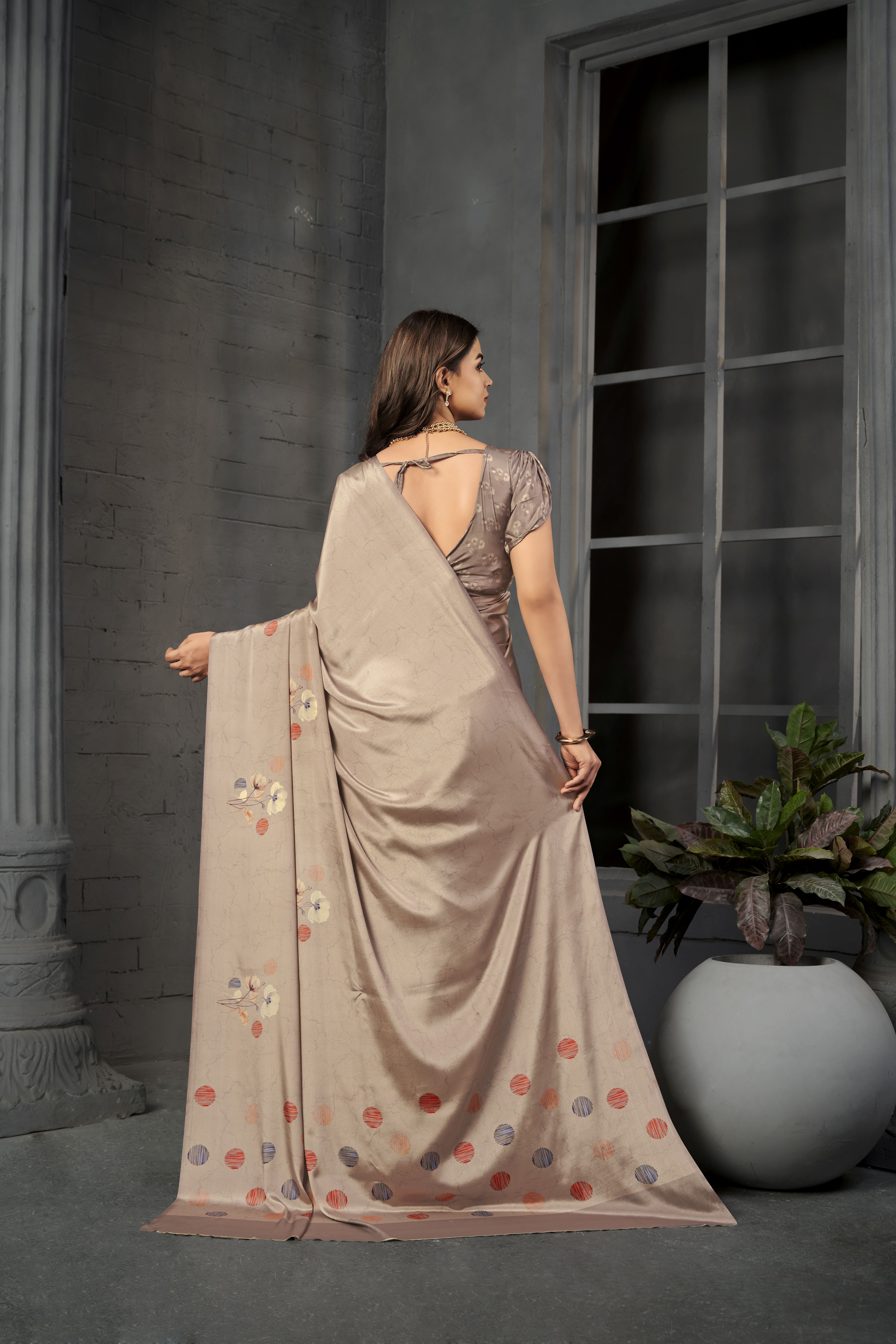 Grey Color Malai Crepe Silk Fabric Designer Digital Printed Beautiful Fancy Partywear Saree