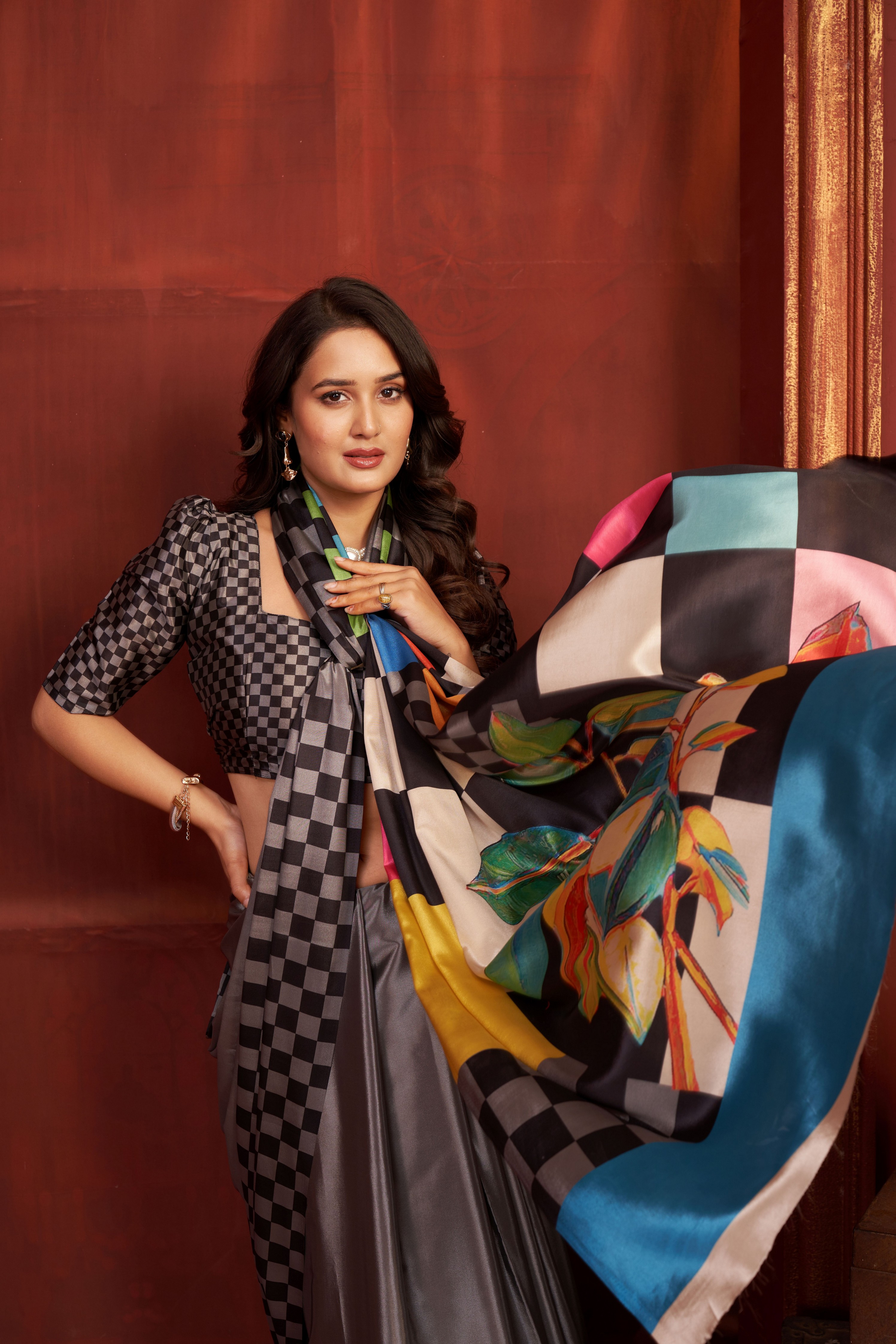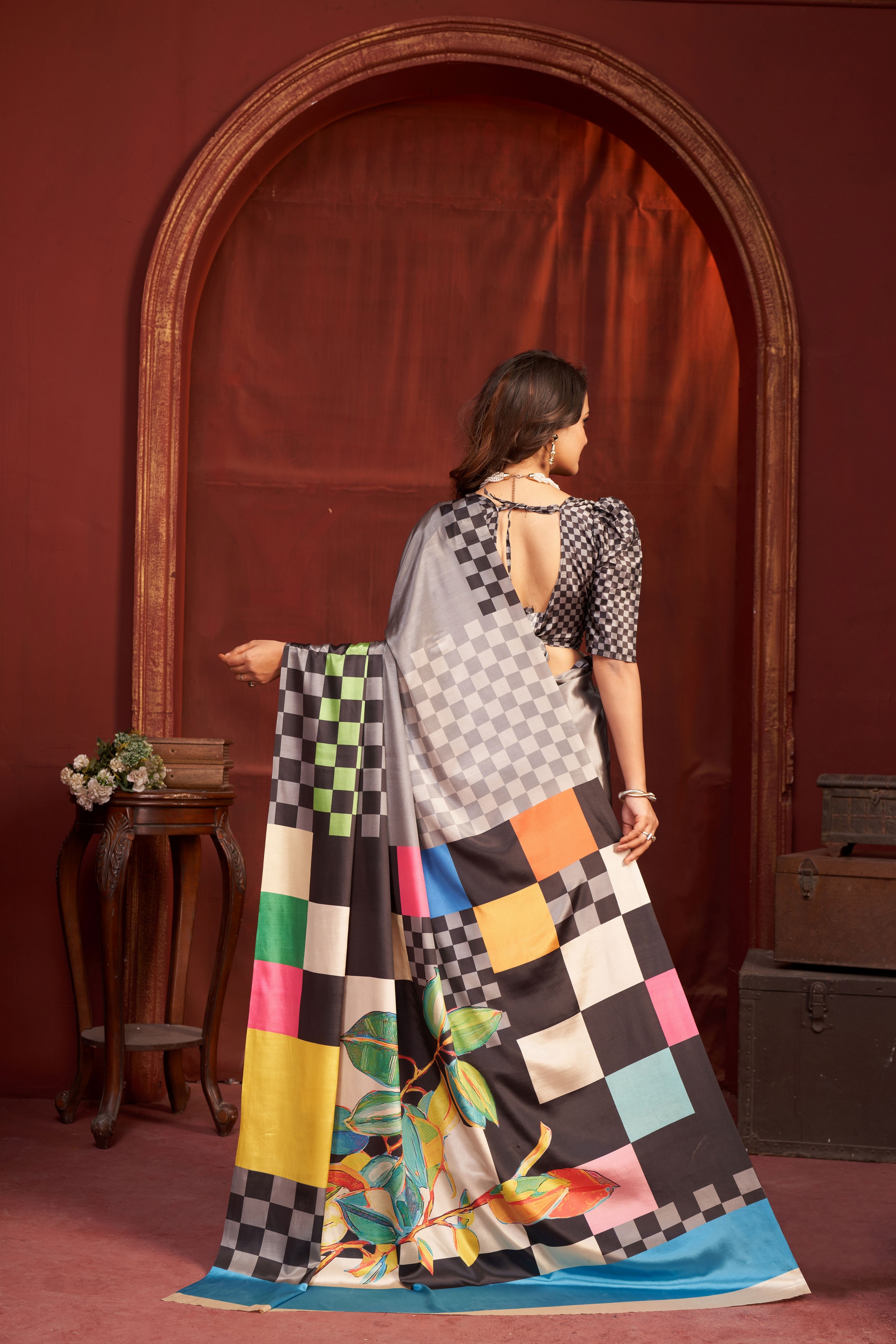Grey Color Malai Crepe Silk Fabric Designer Digital Printed Girlie Fashinova Saree