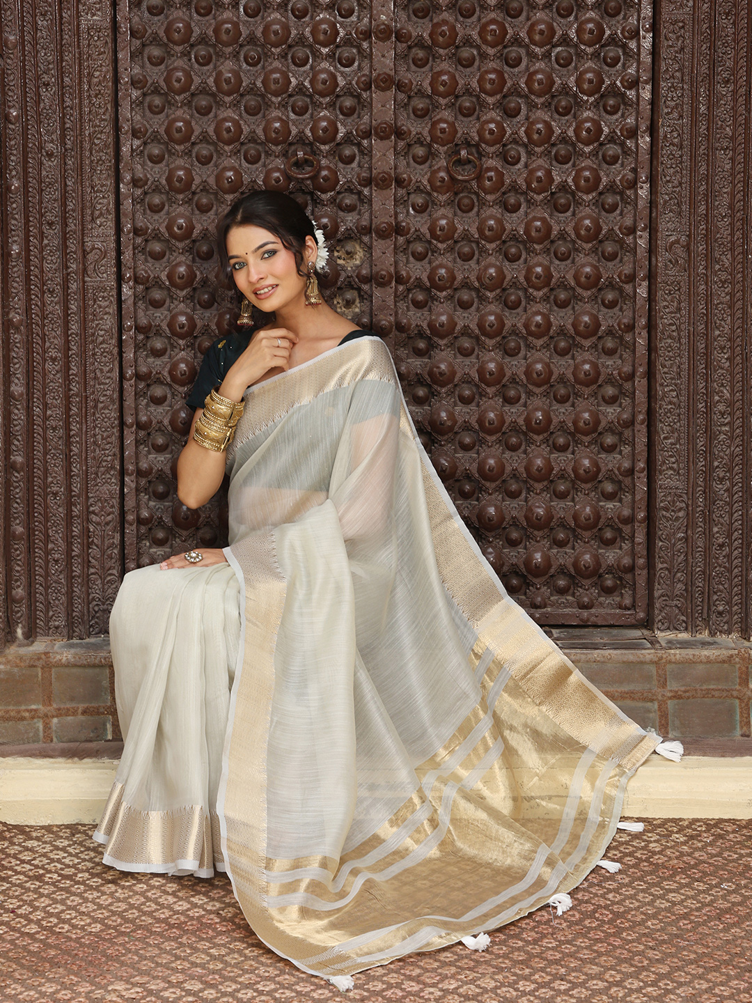 Grey Color Rich Ceremonial Looks Cotton Based Woven Designer Saree