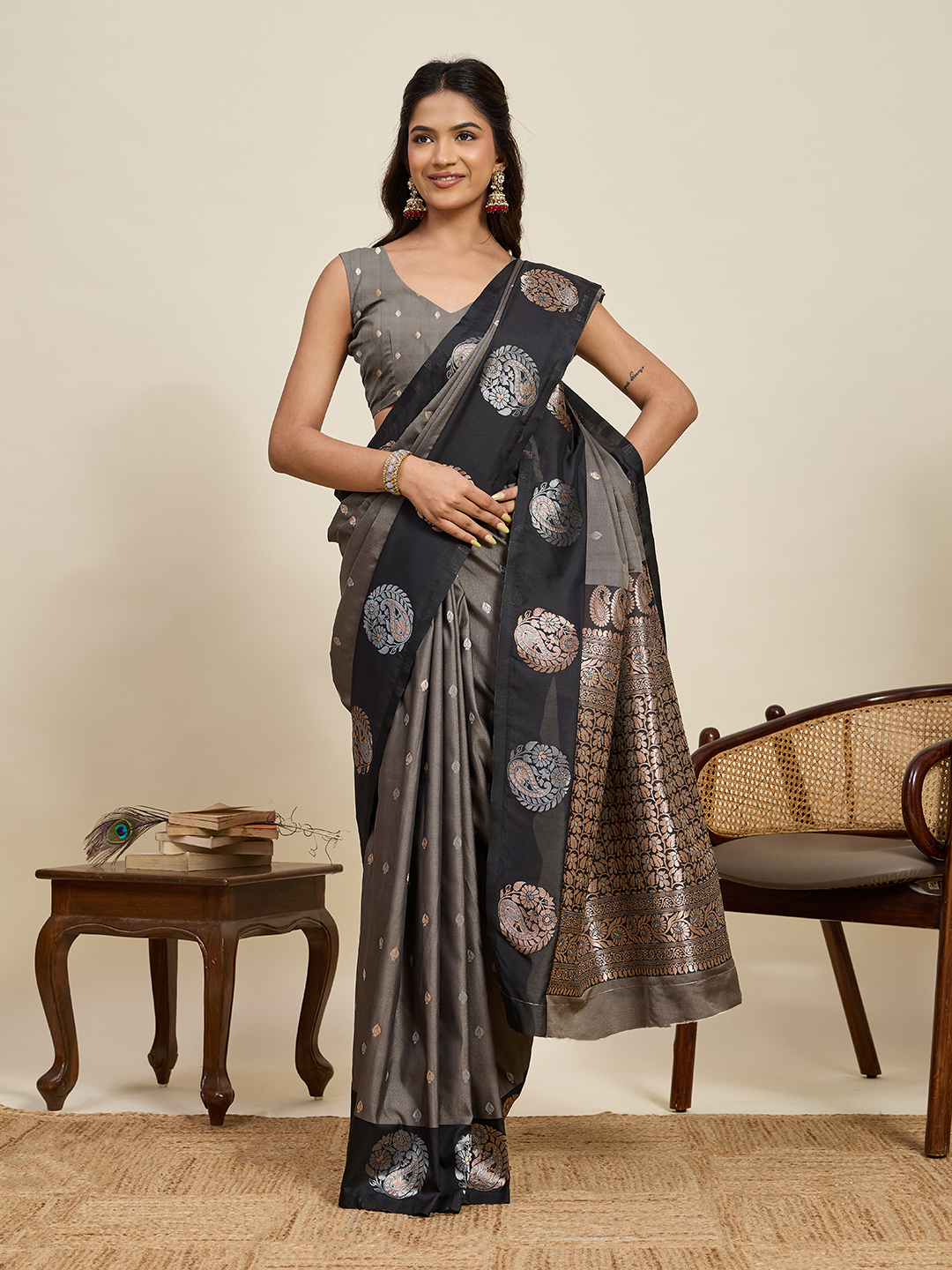 Grey Color Soft Silk Fabric Woven Jari Designer Ceremonial Partywear Saree