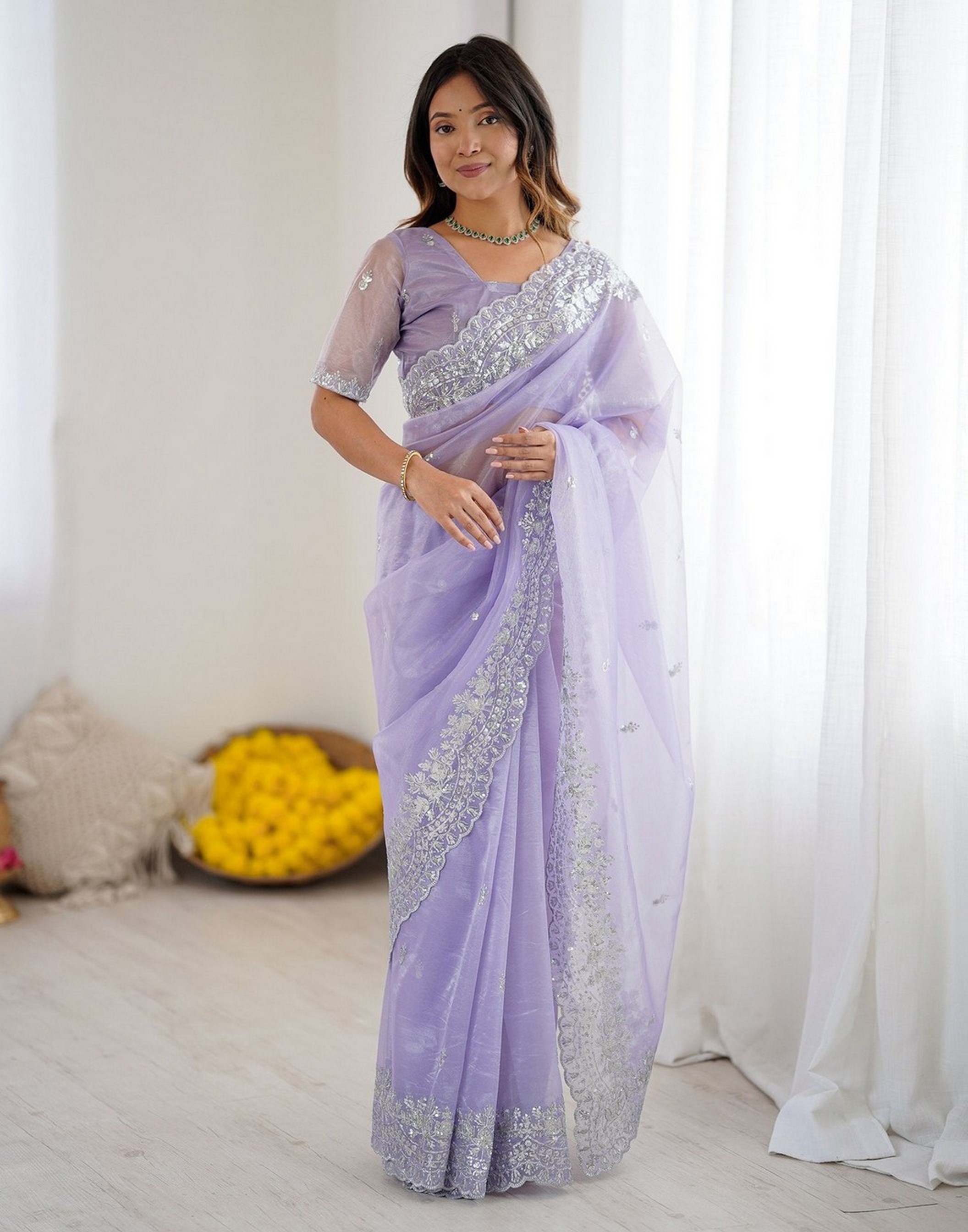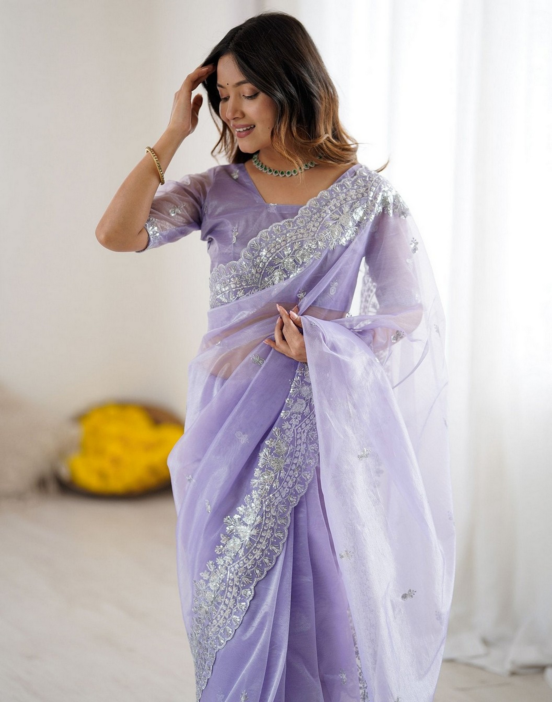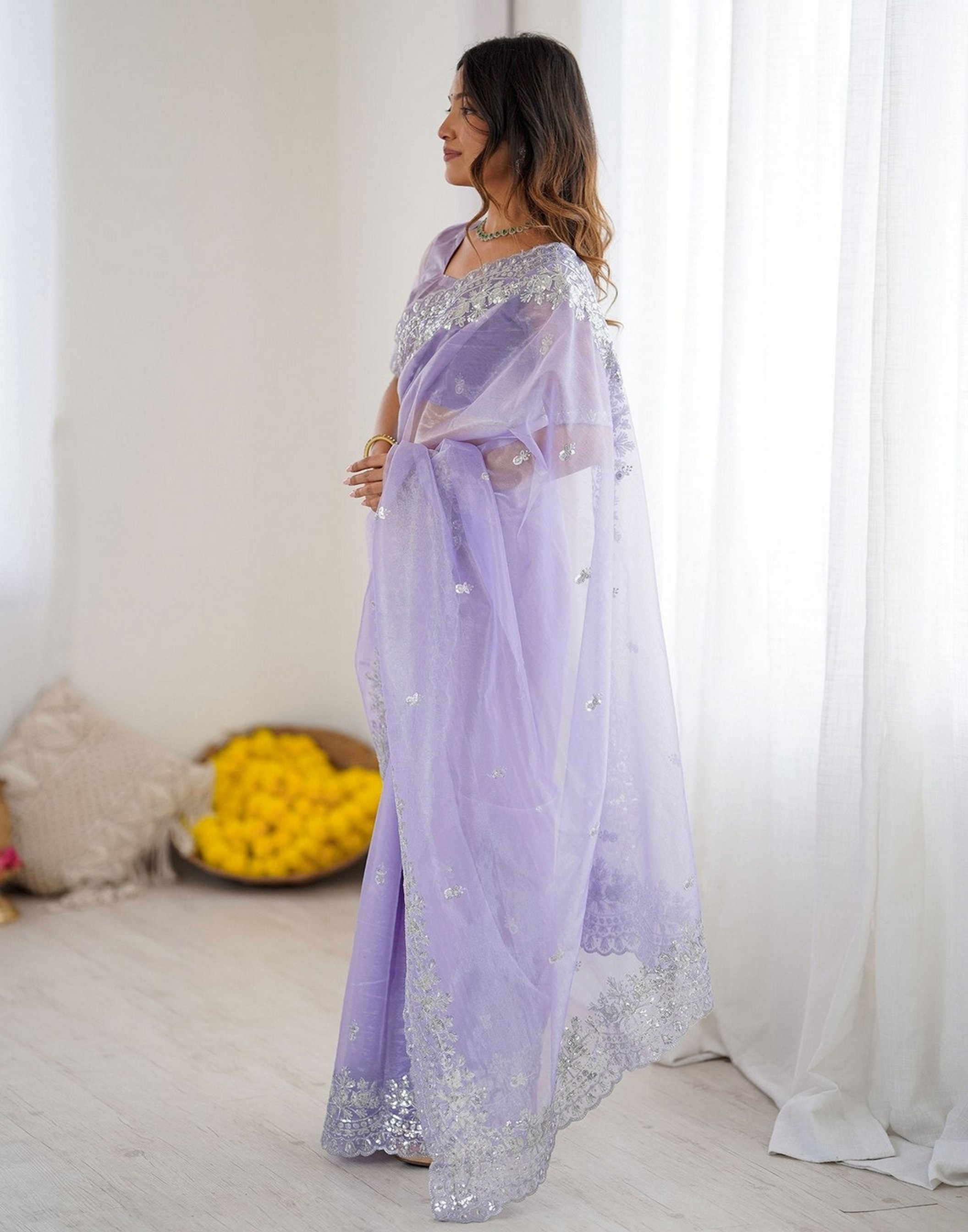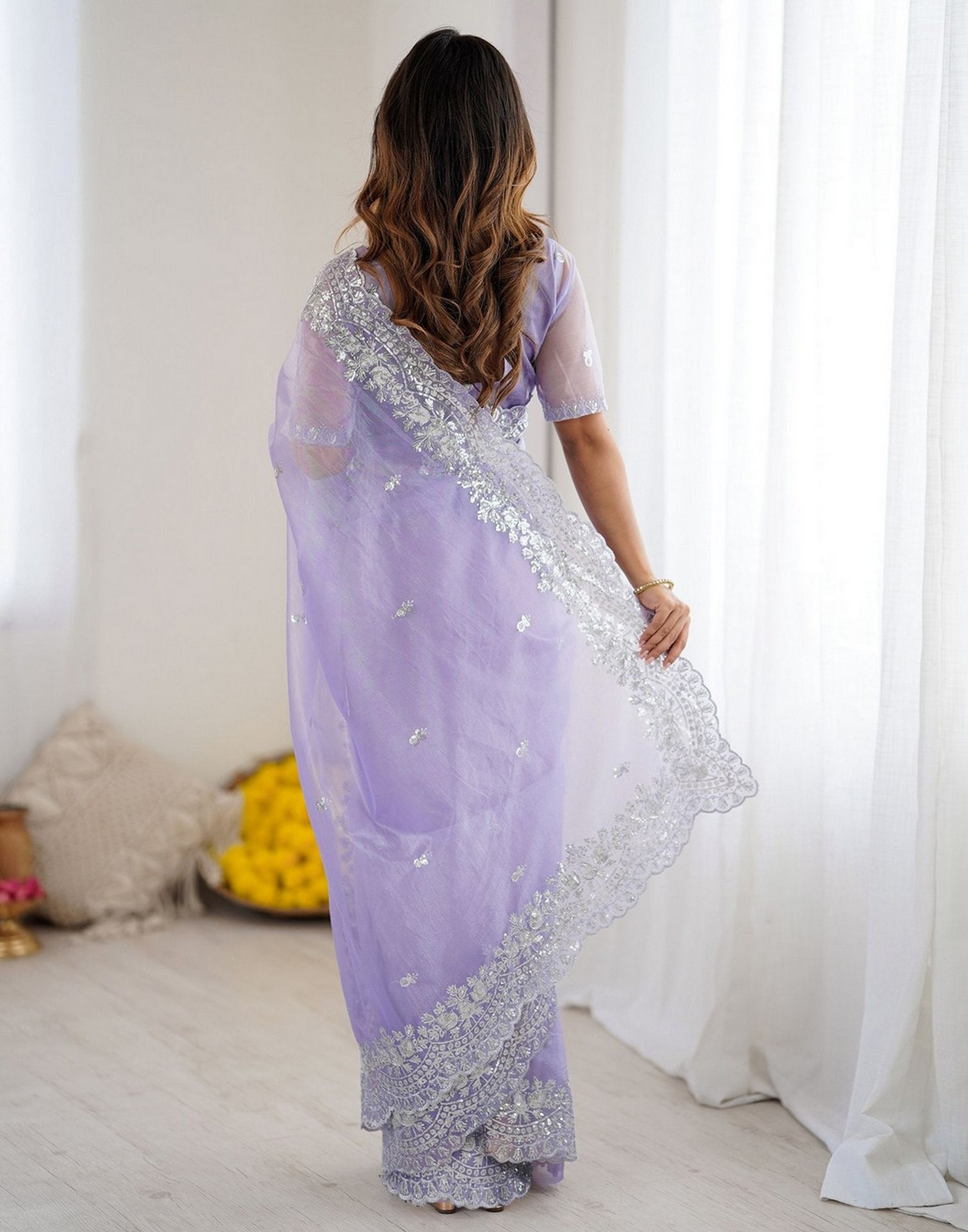 Lavender Color Art Silk Fabric Designer Embroidered Saree For Ceremonial Looks