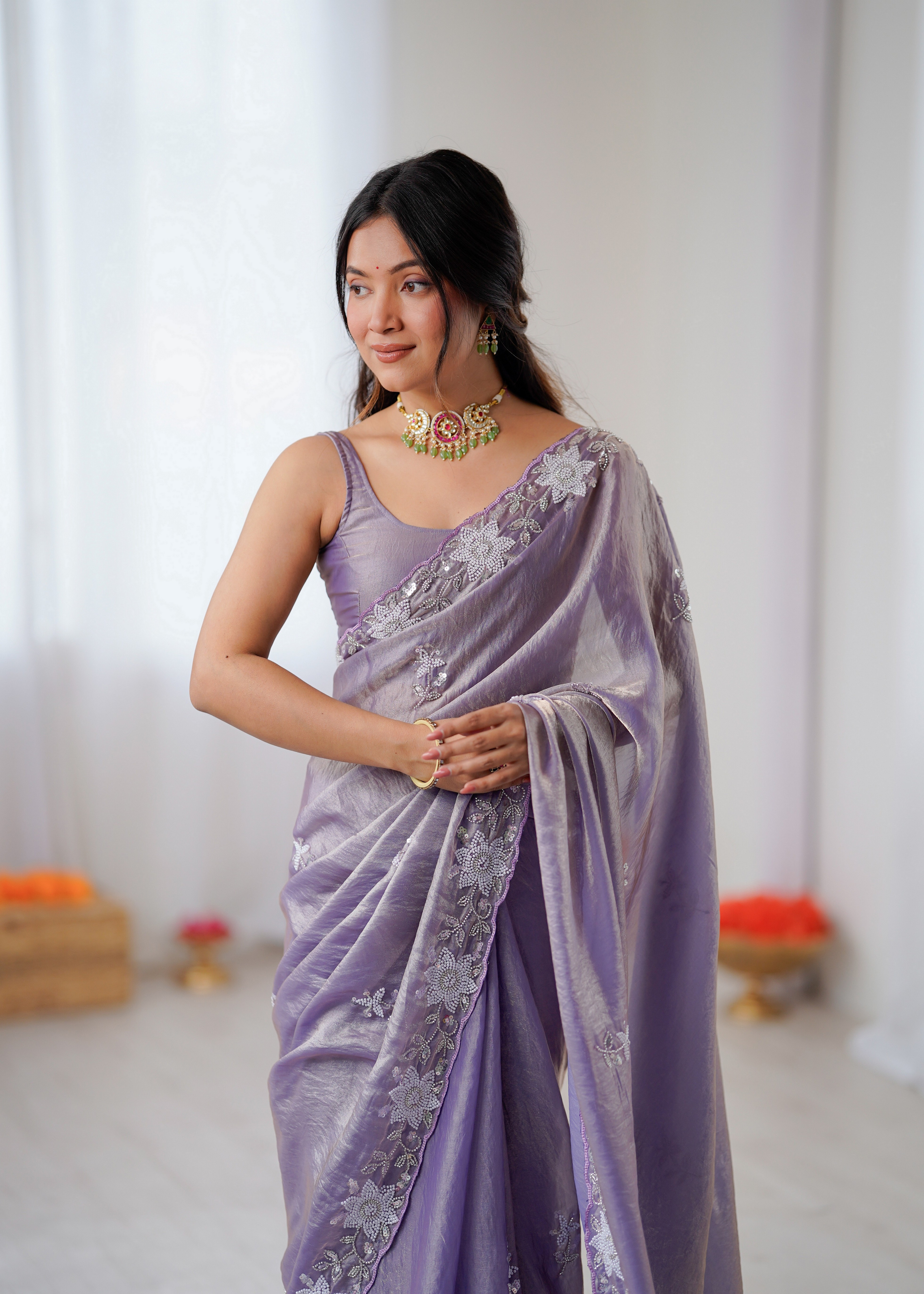 Lavender Color Fendy Satin Graceful Embroidered Bollywood Saree