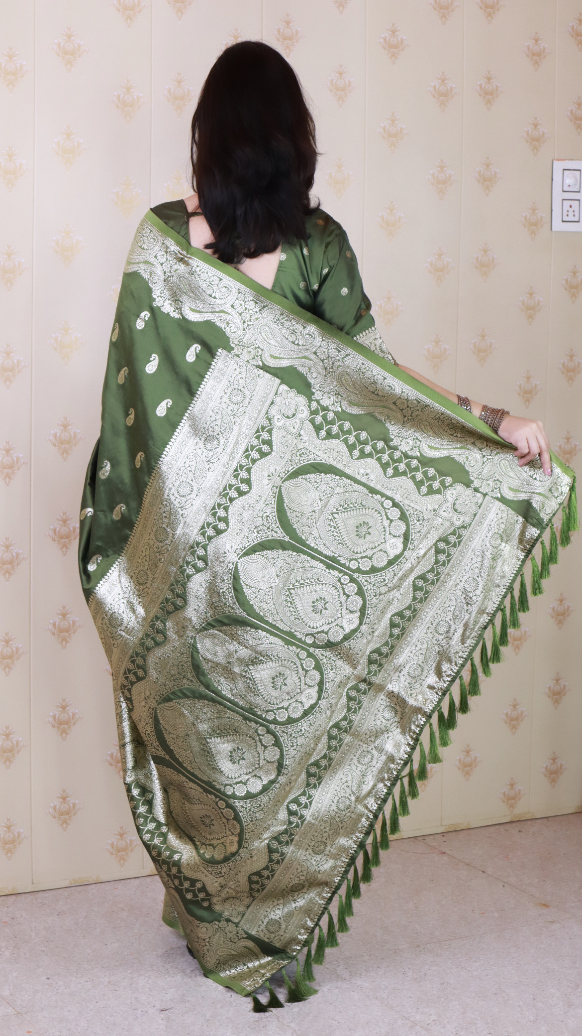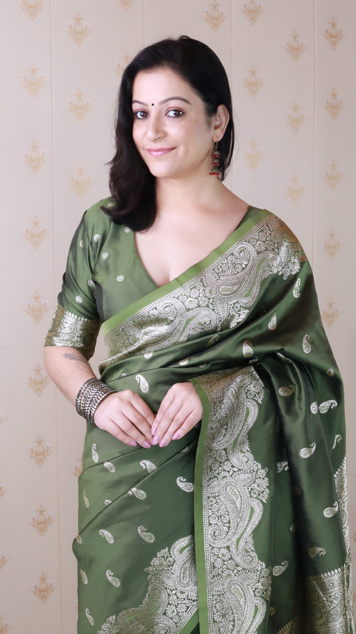 Mahendi Color Banarasi Silk Saree Woven Silver Jari Designer Ceremonial Partywear Saree