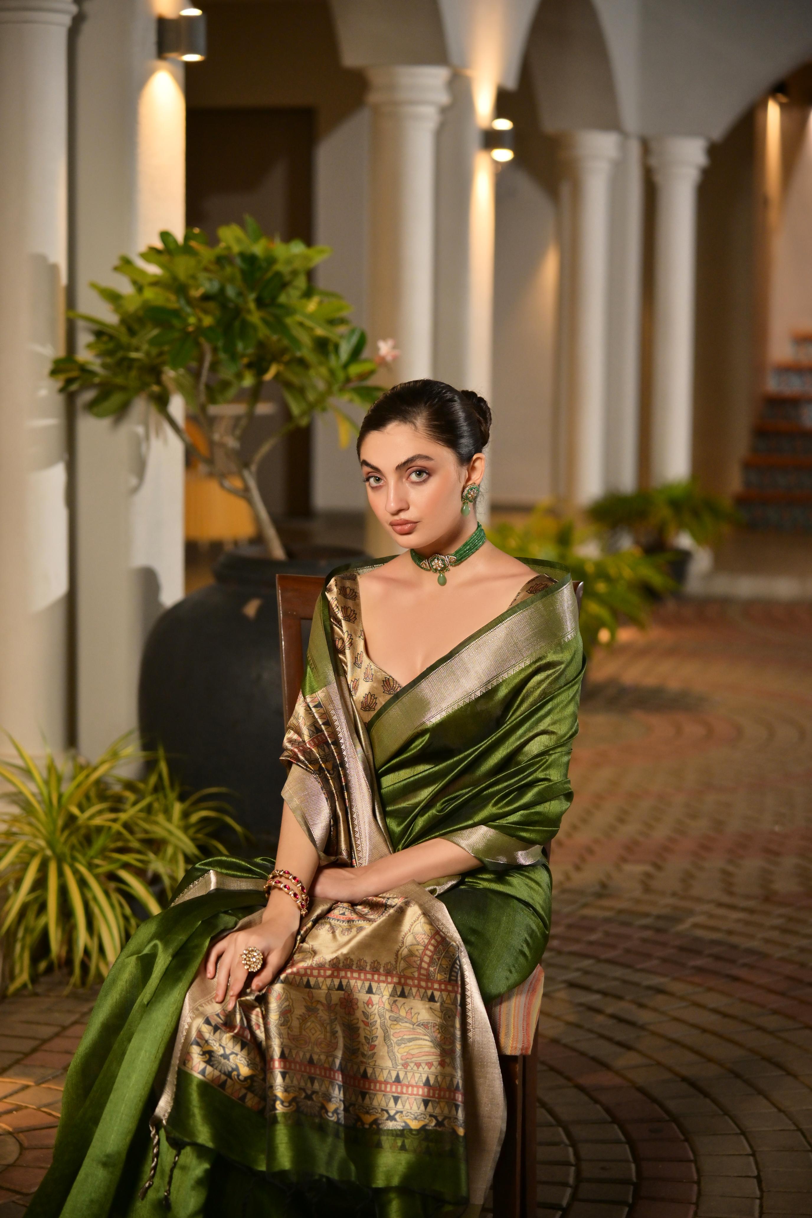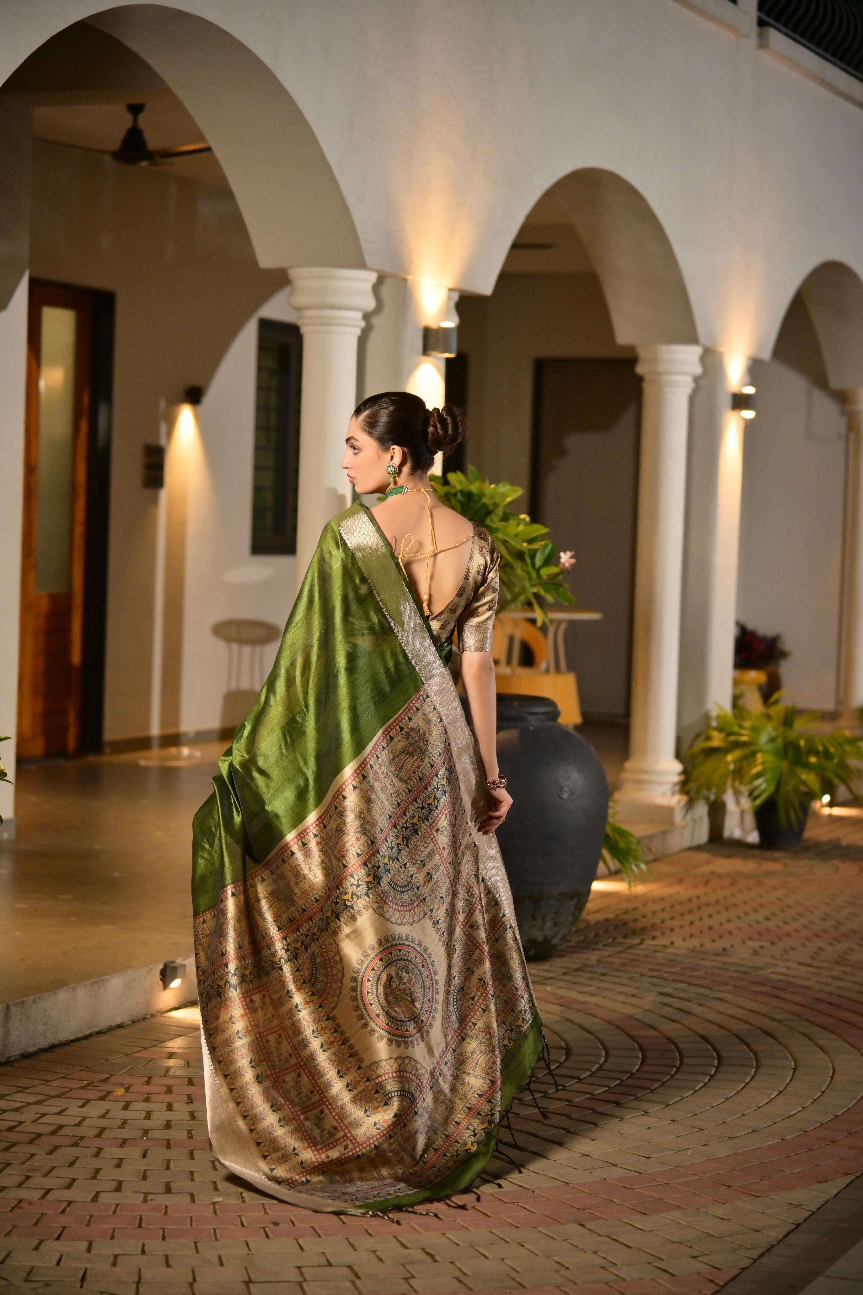 Mahendi Color Smart Khadi Raw Silk Saree With Graceful Madhubani Style Print