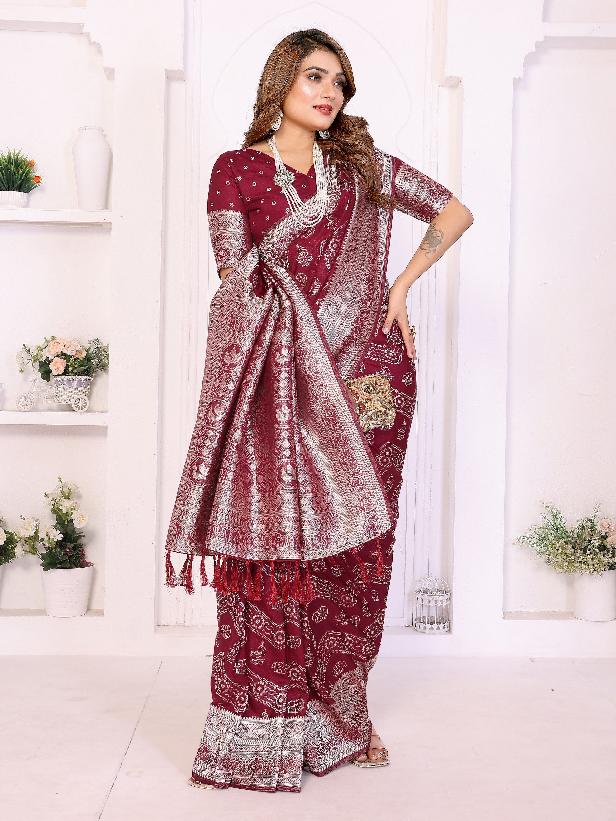 Maroon Color Georgette Silk Fabric Woven Laheriya Jari Designer Saree