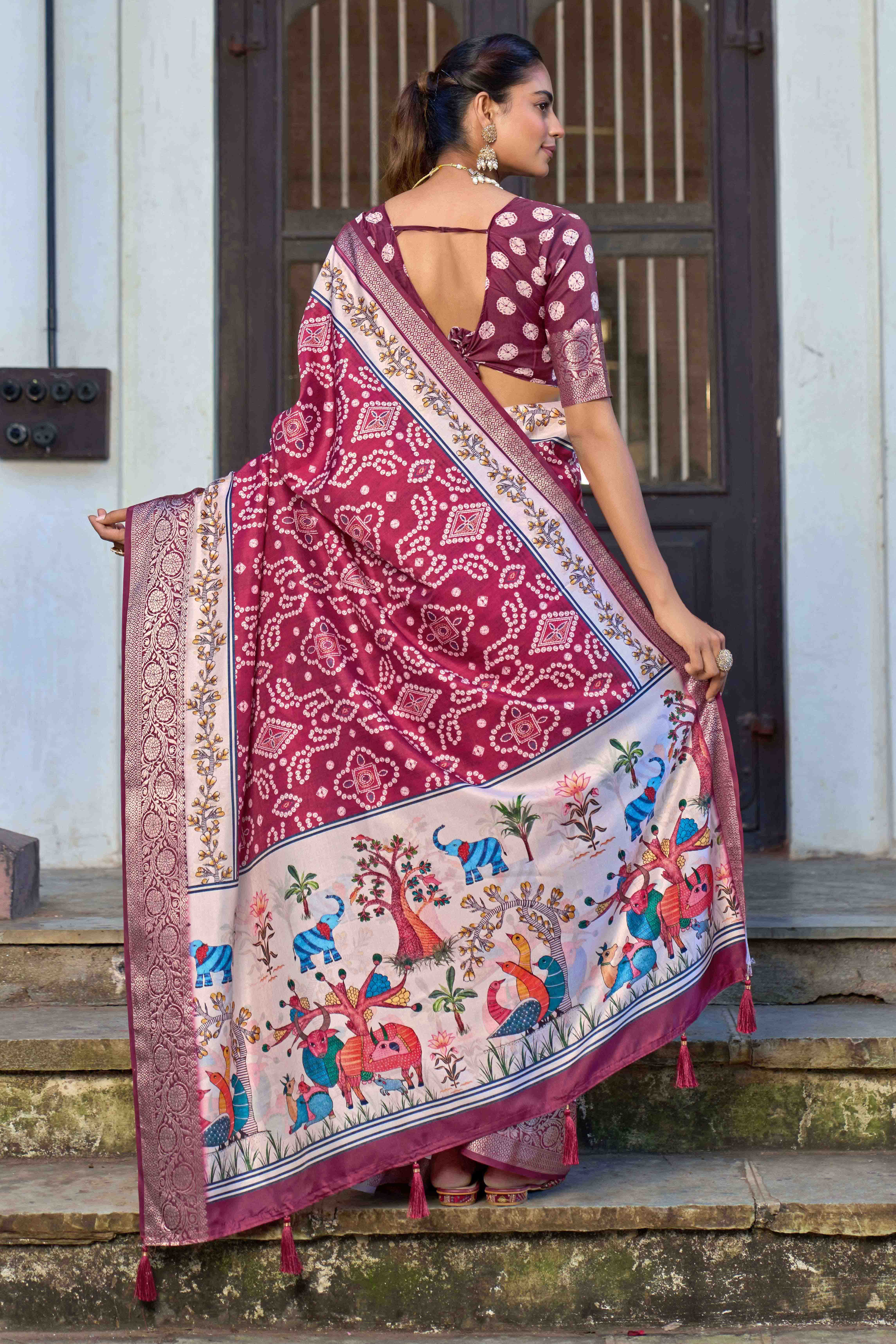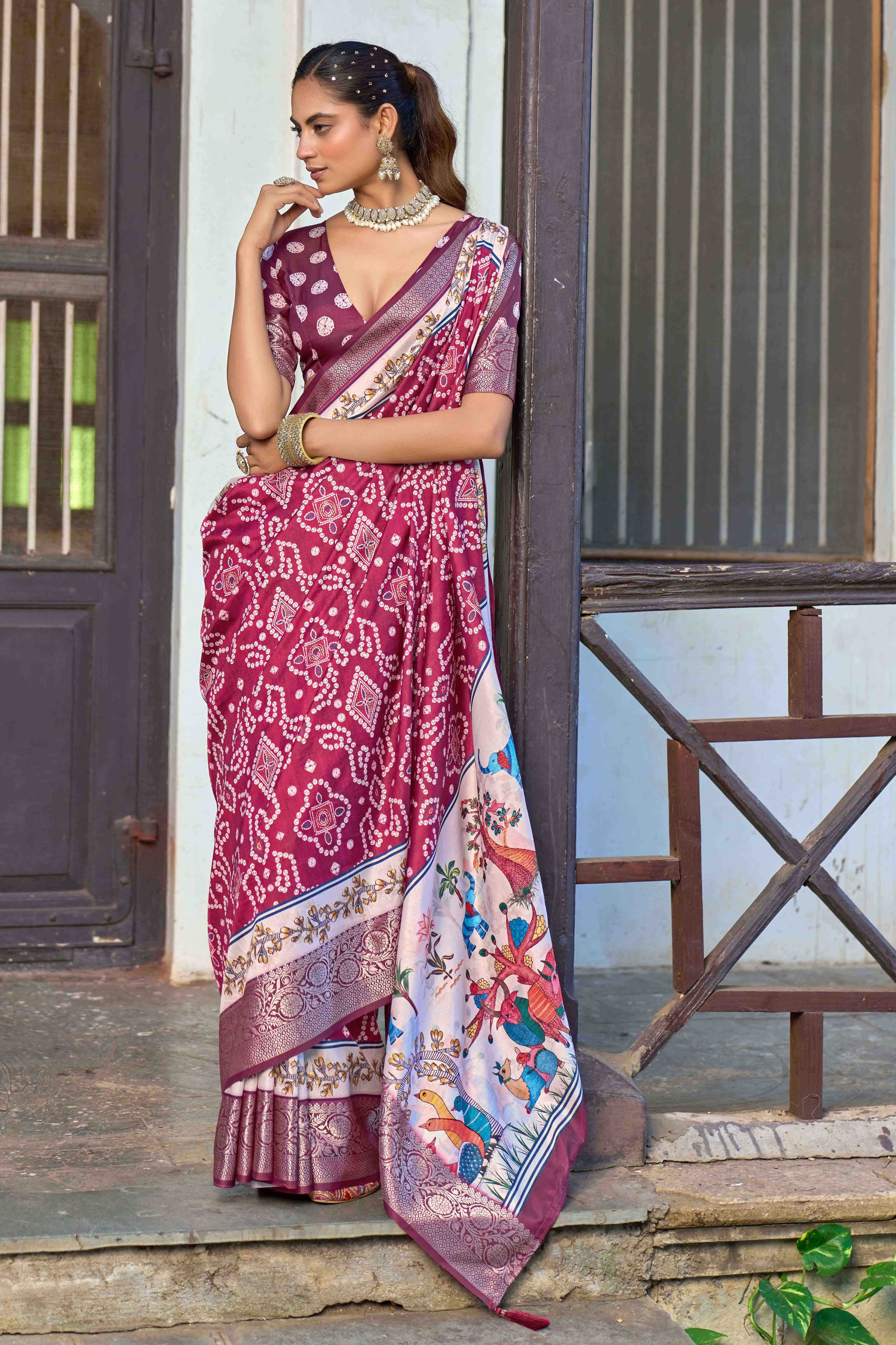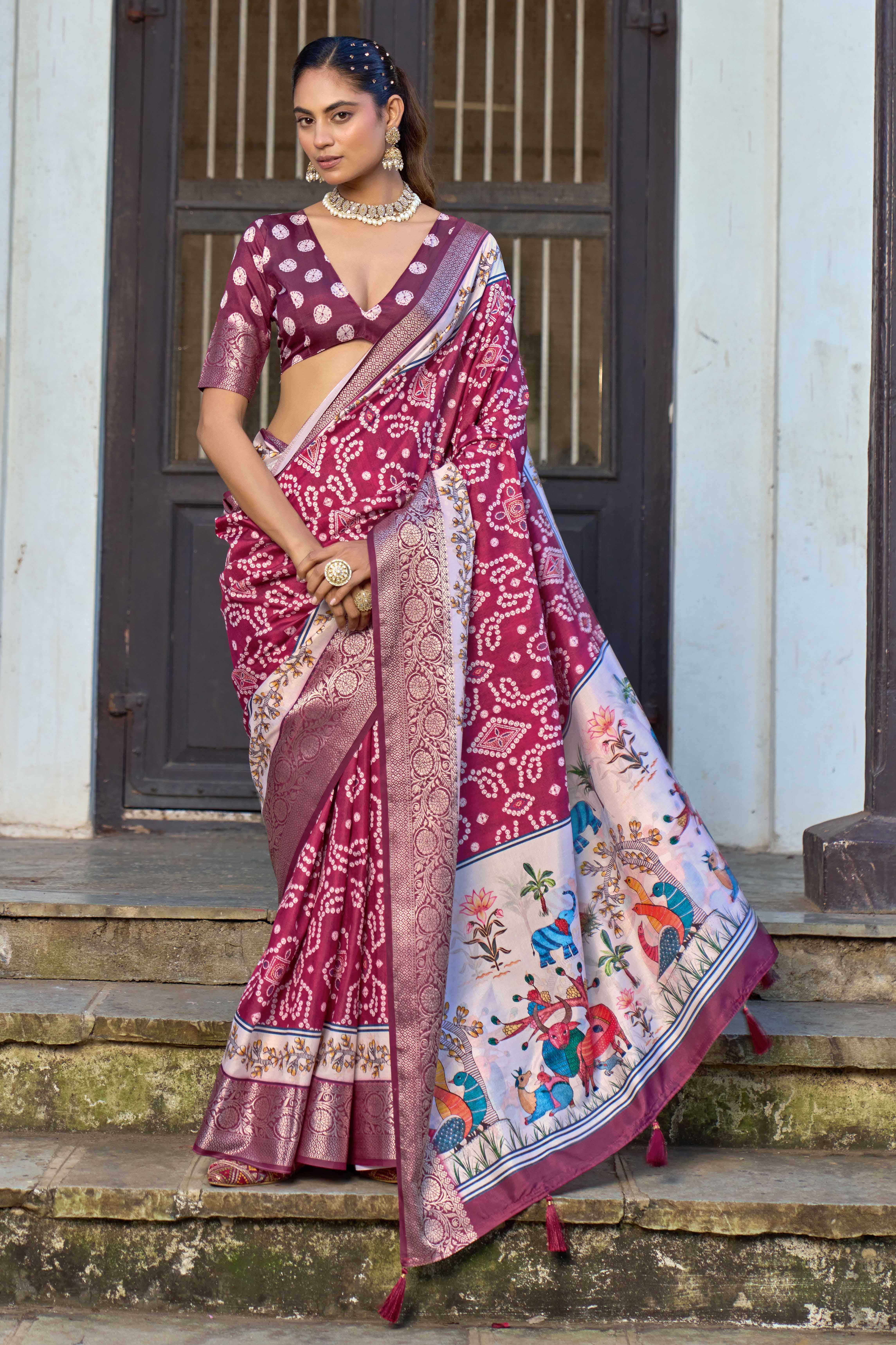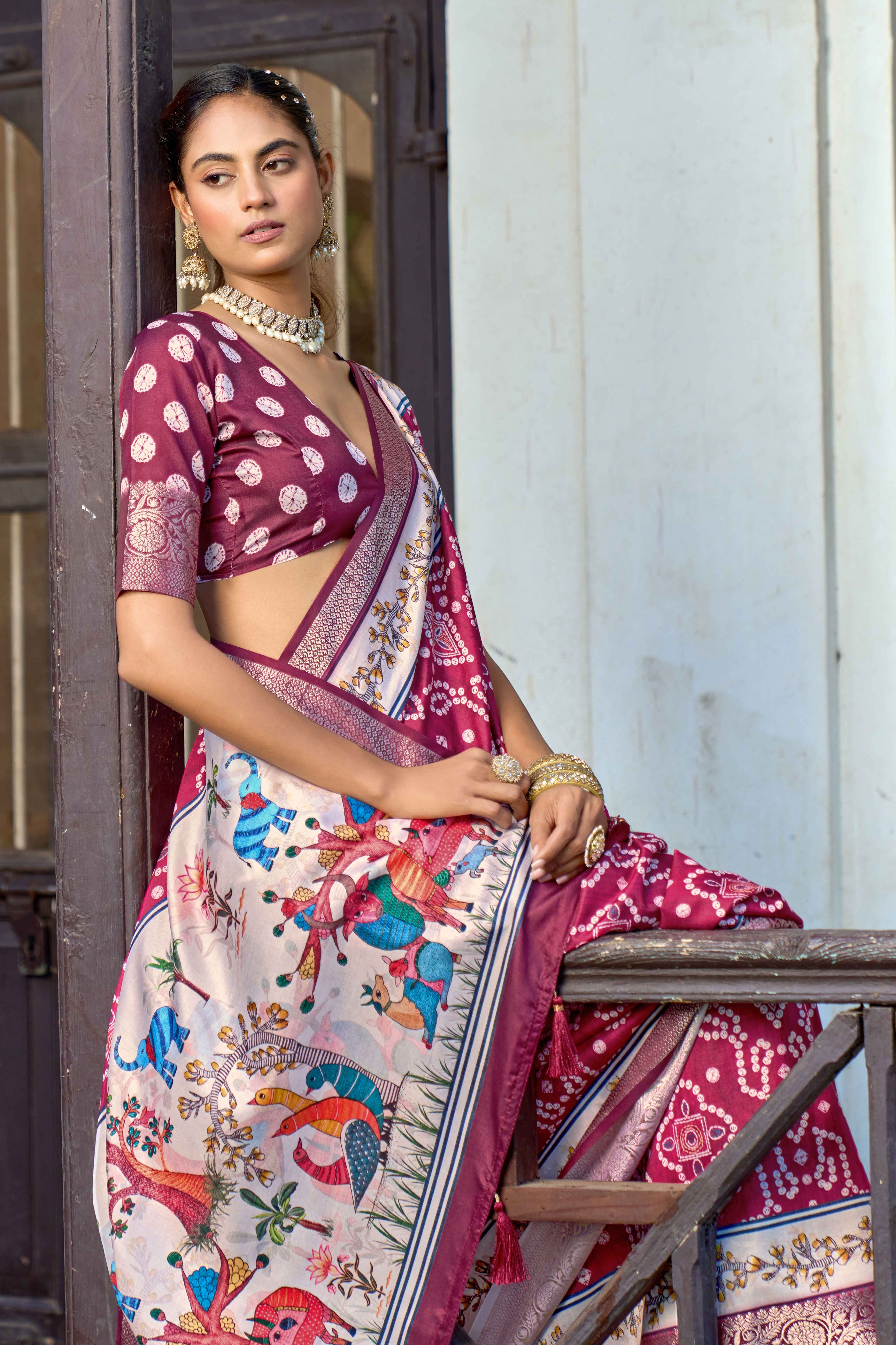 Maroon Color Silk Blended Traditional Bandhani Ajrakh Printed Saree