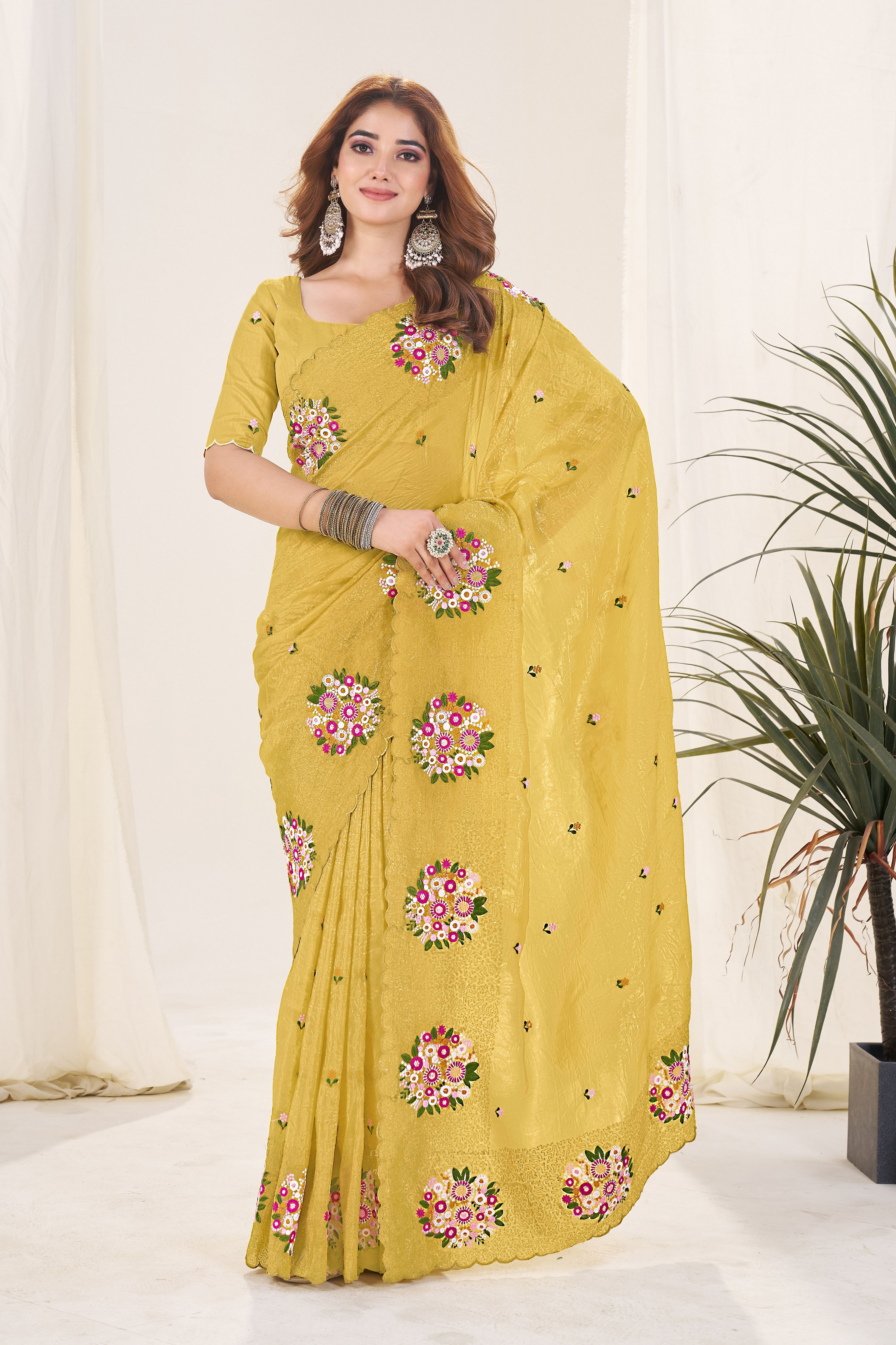 Mustard Color Gold Crush Fabric Designer Embroidered Saree