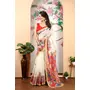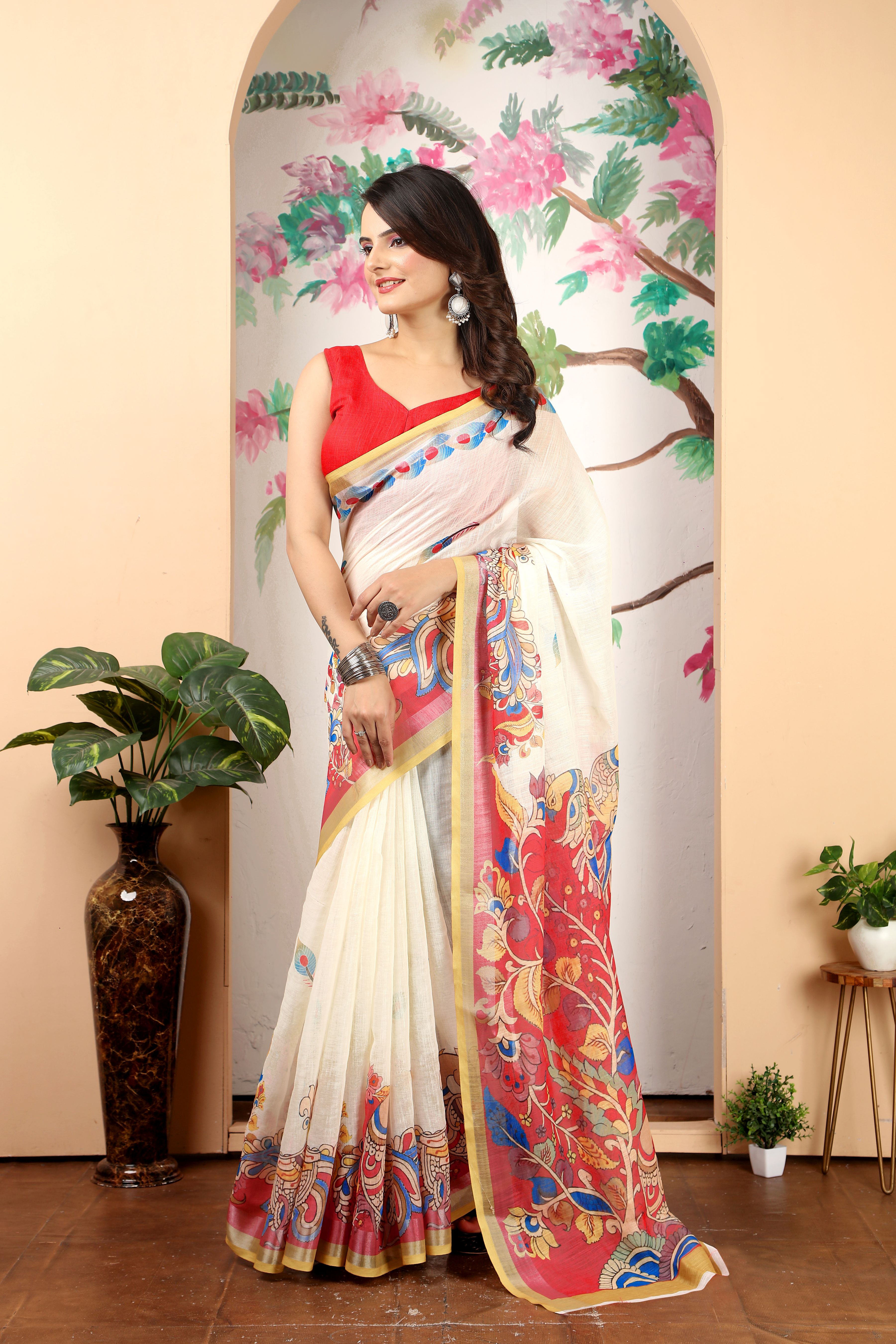 Off White Color Linen Cotton Fabric Beautiful Printed Saree