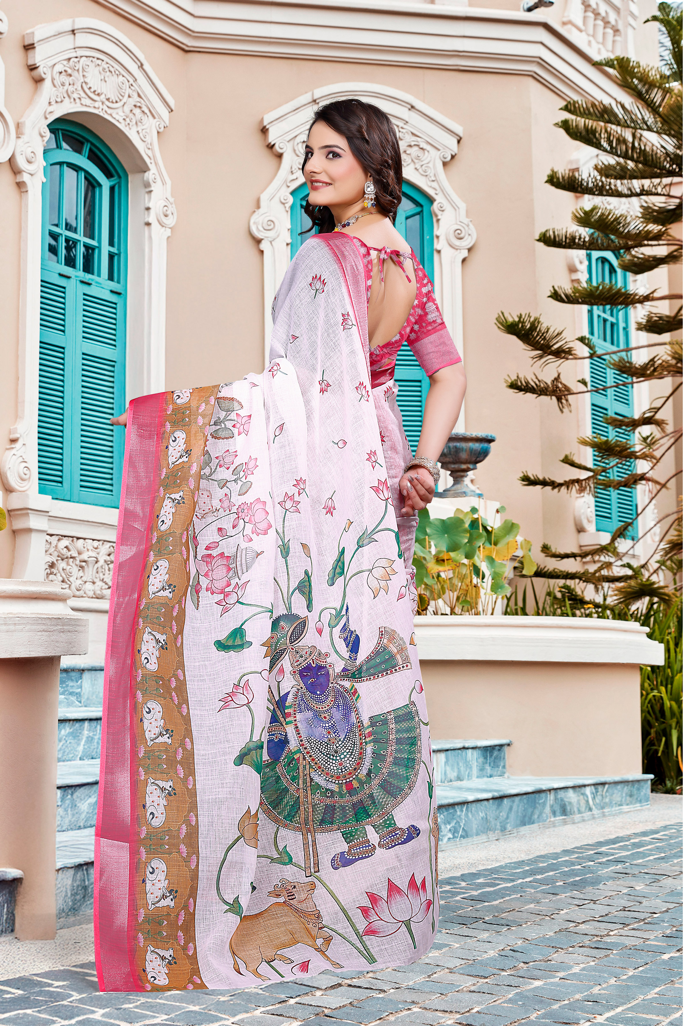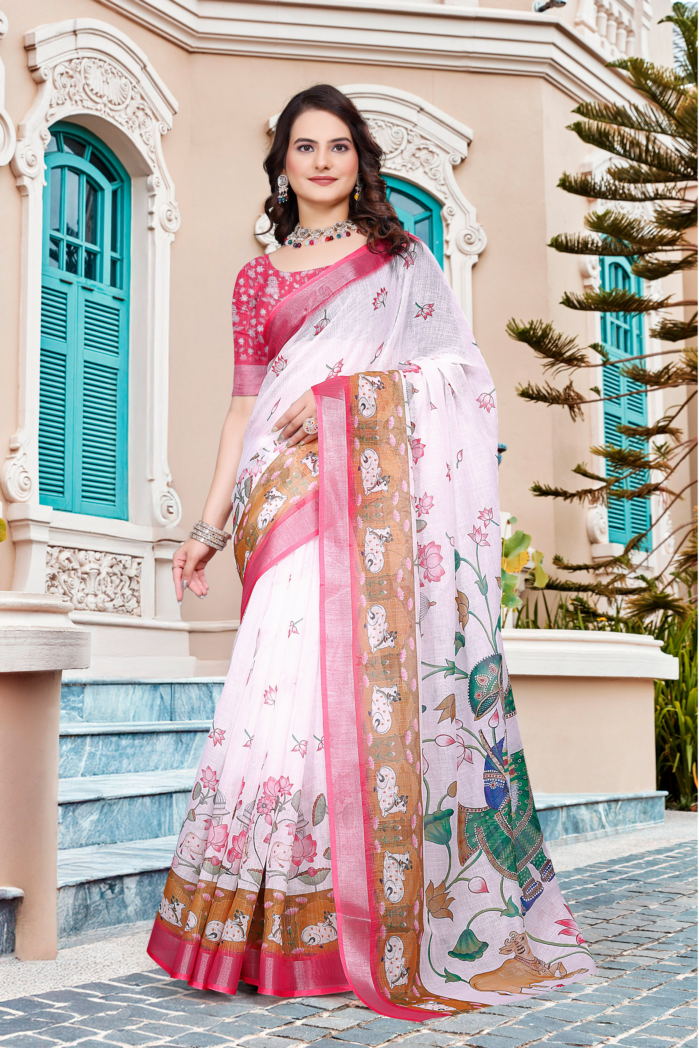 Off White Color Linen Cotton Saree With Smart Partywear Printed Looks