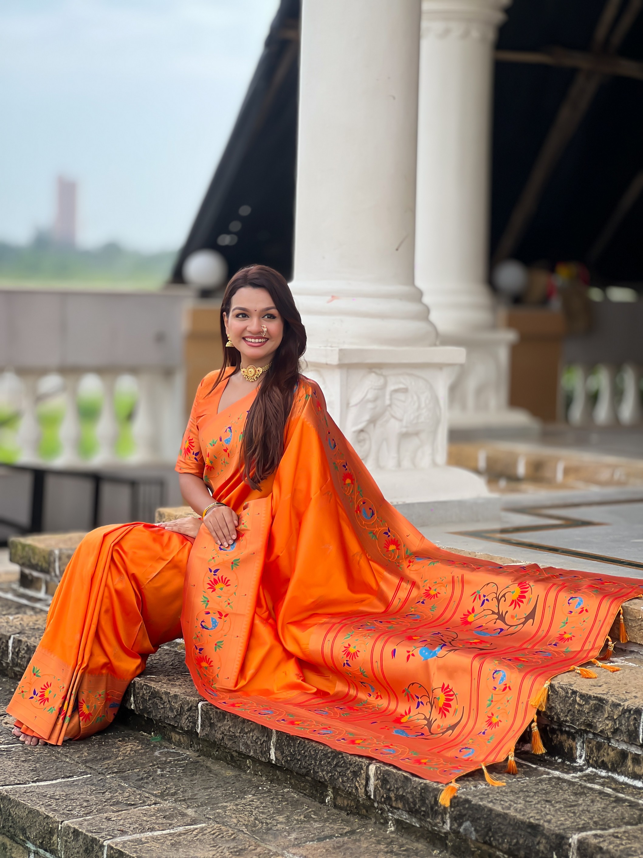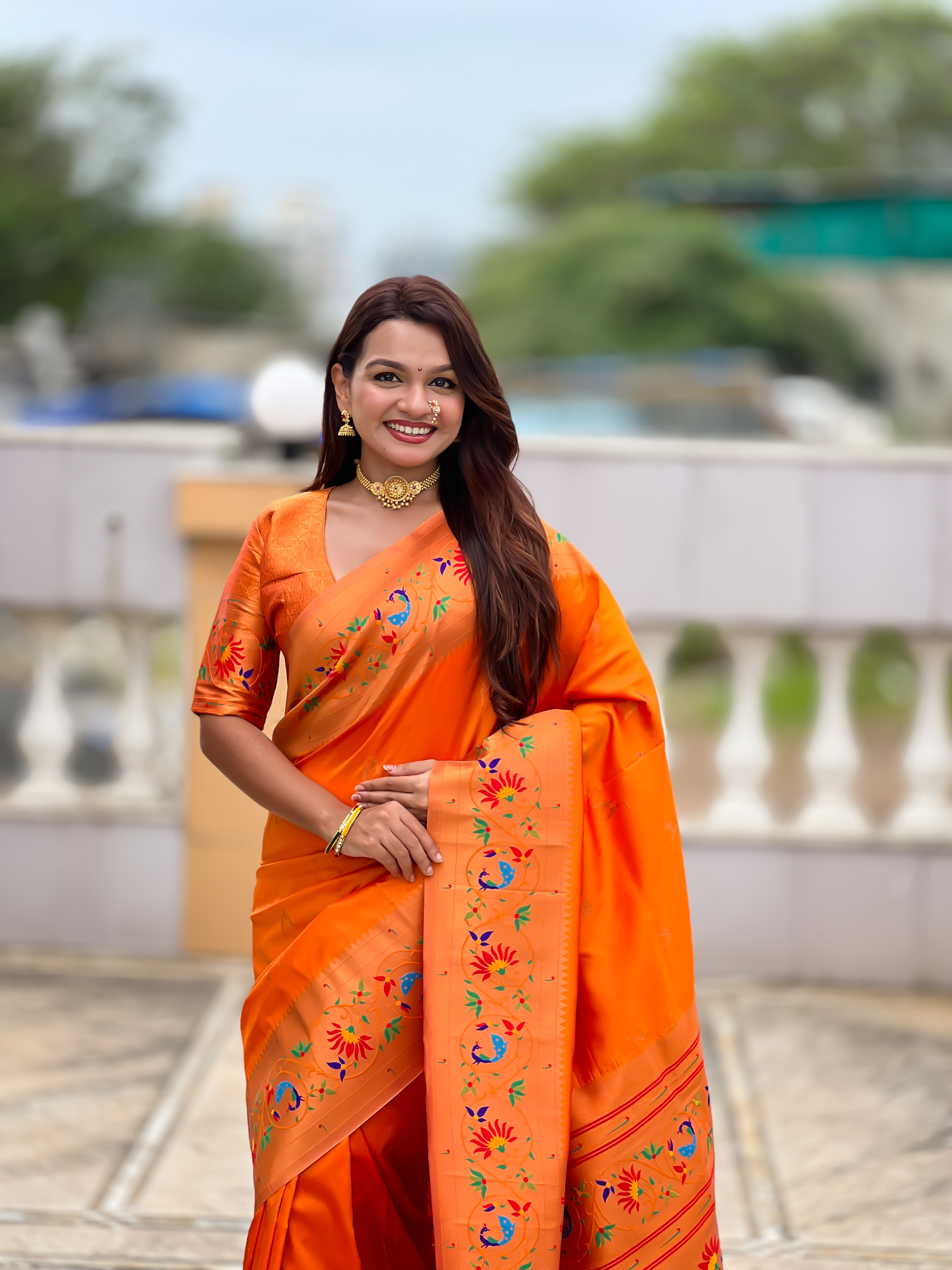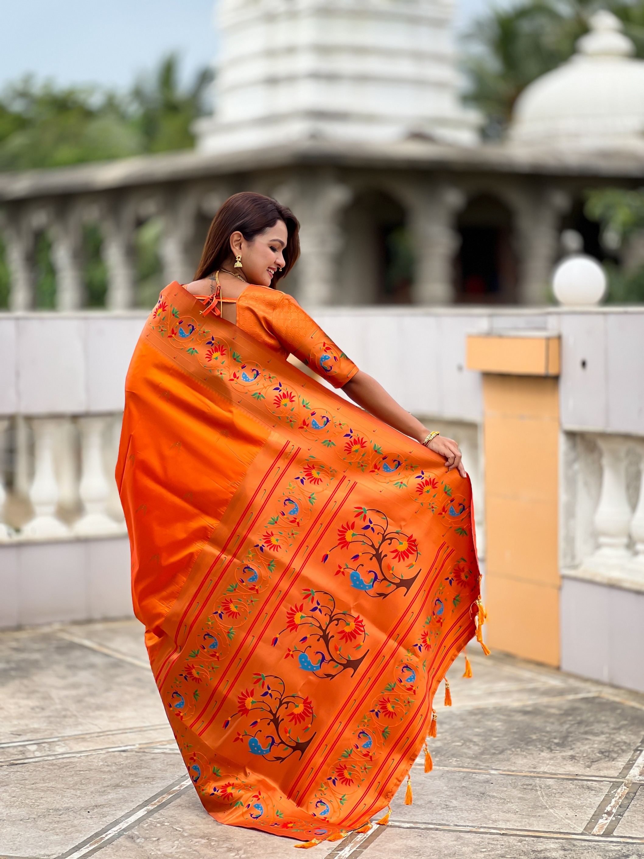 Orange Color Paithani Silk Fabric Woven Meenakari Jacquard Designer Graceful Wedding Saree