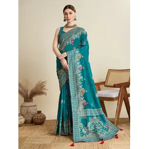 Teal Blue Color Satin Silk Wevon Jari...